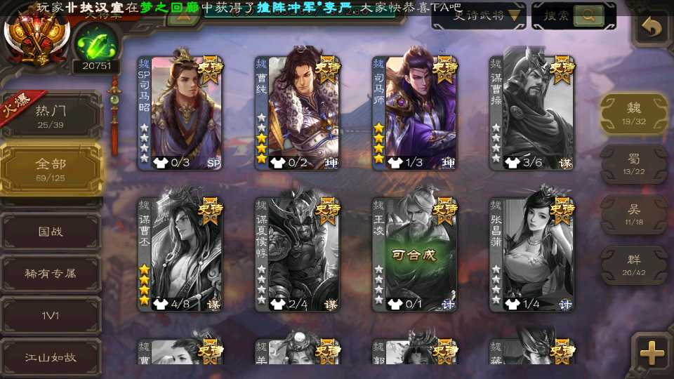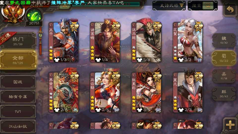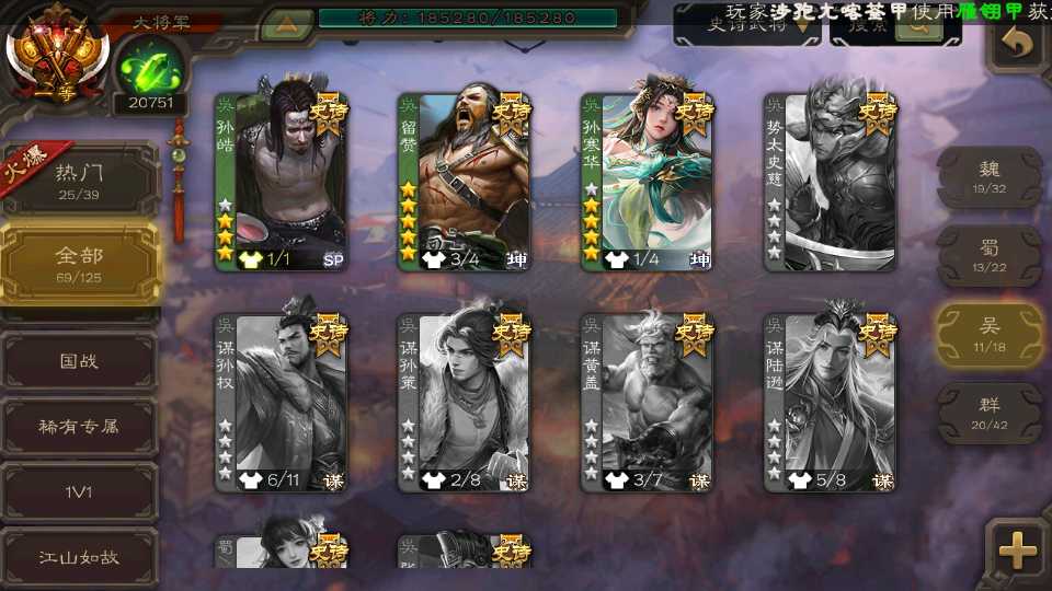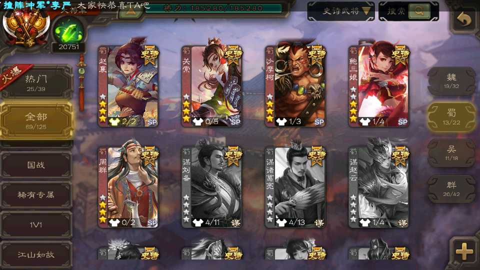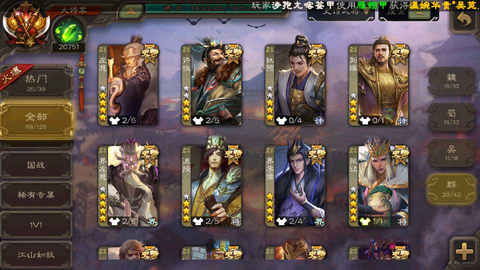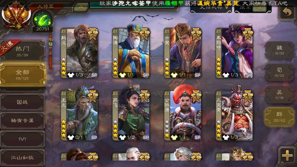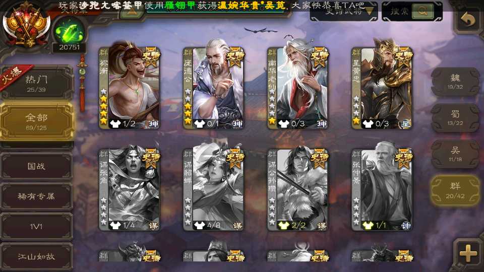 (群雄):杜预,祢衡,界左慈,南华老仙,麴义,许攸,庞德公,张让,界李儒,苏飞,卑弥呼,士燮,王允,公孙康,刘璋,陶谦,星黄忠,左慈,沮授,兀突骨