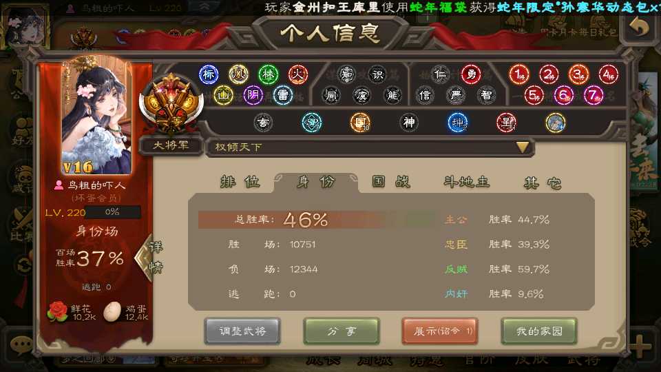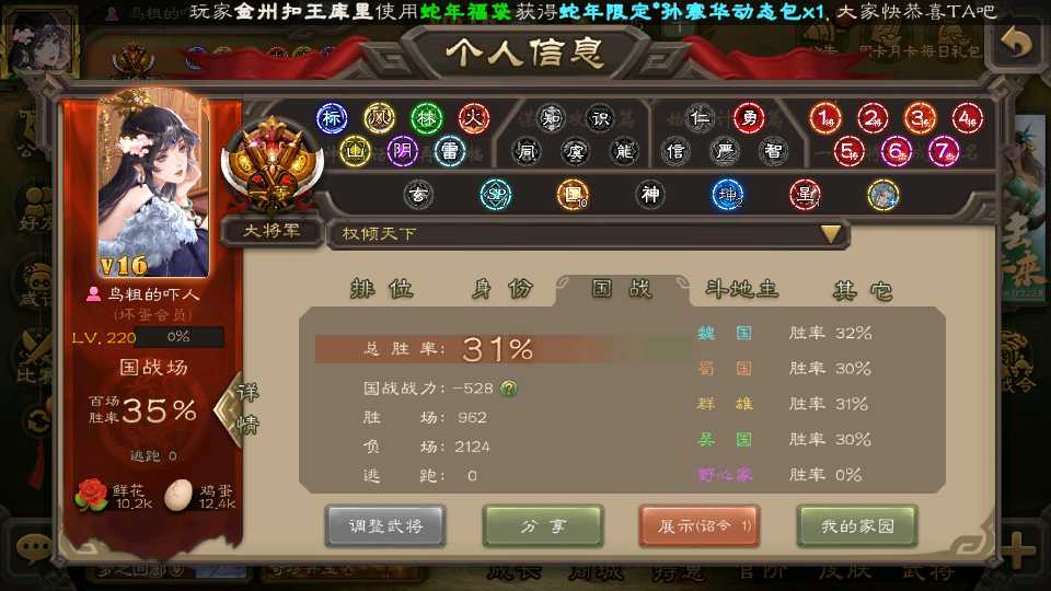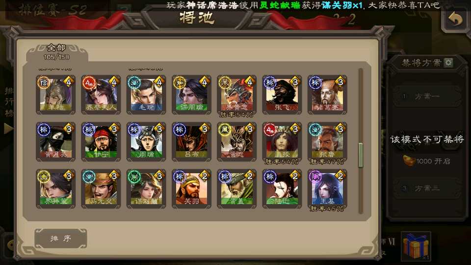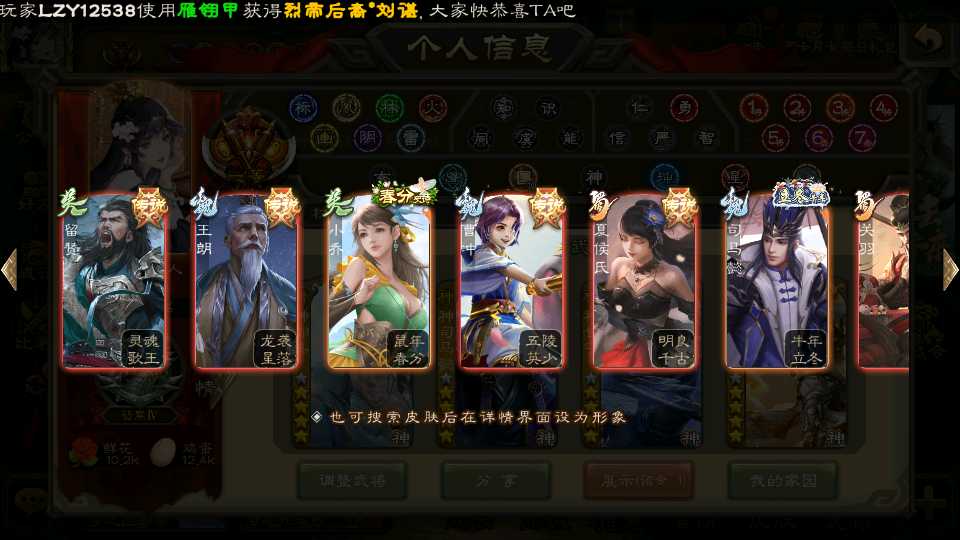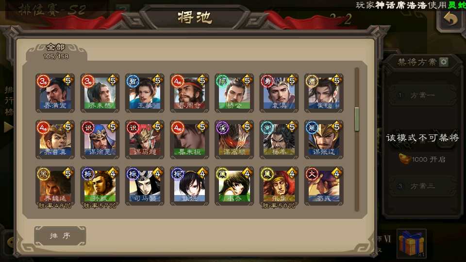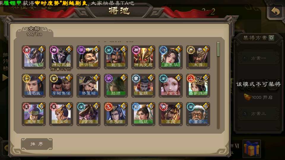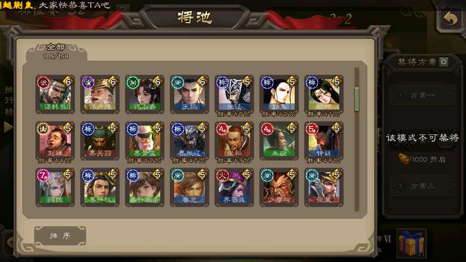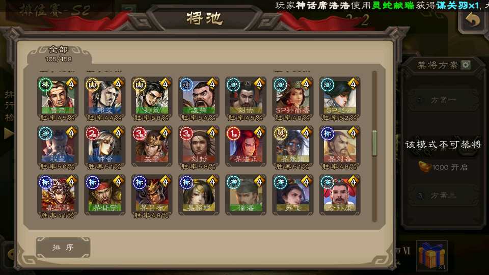 (群雄):杜预,祢衡,界左慈,南华老仙,麴义,许攸,庞德公,张让,界李儒,苏飞,卑弥呼,士燮,王允,公孙康,刘璋,陶谦,星黄忠,左慈,沮授,兀突骨