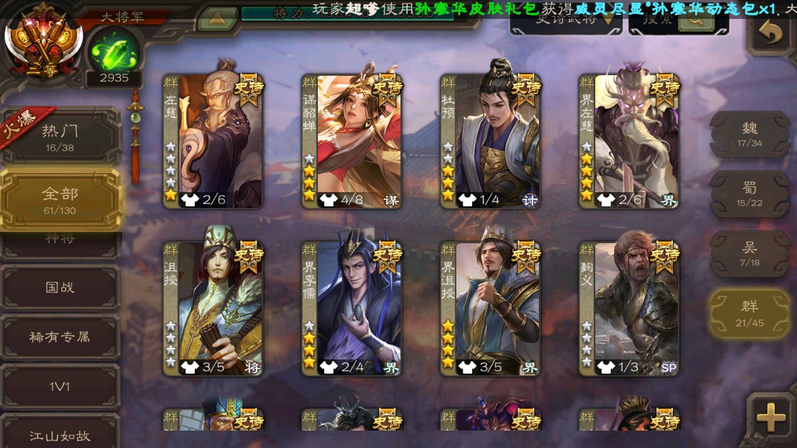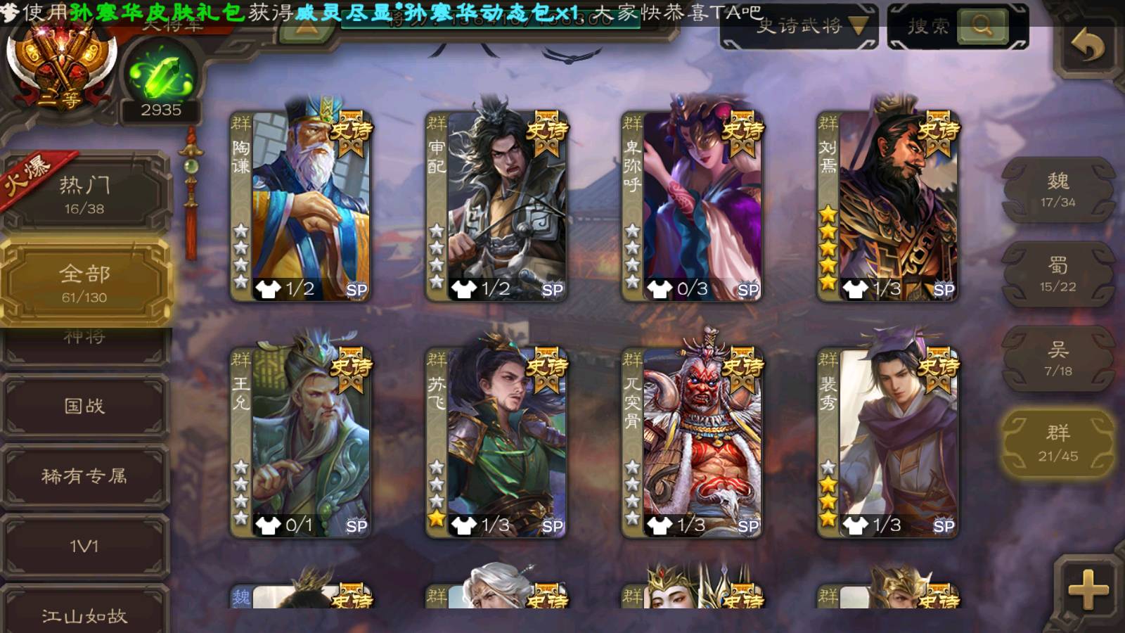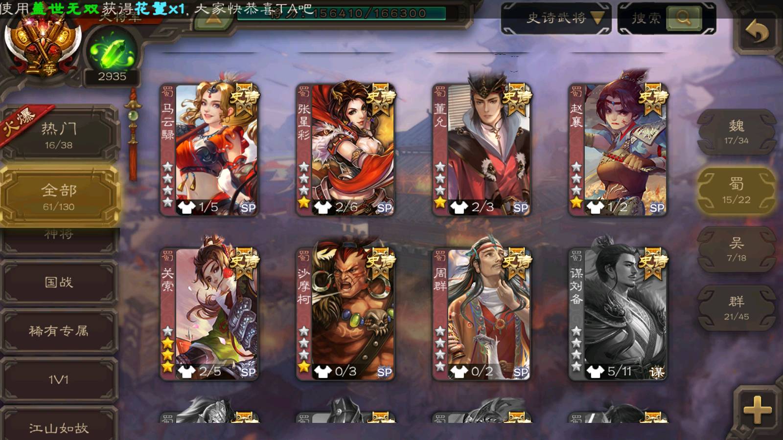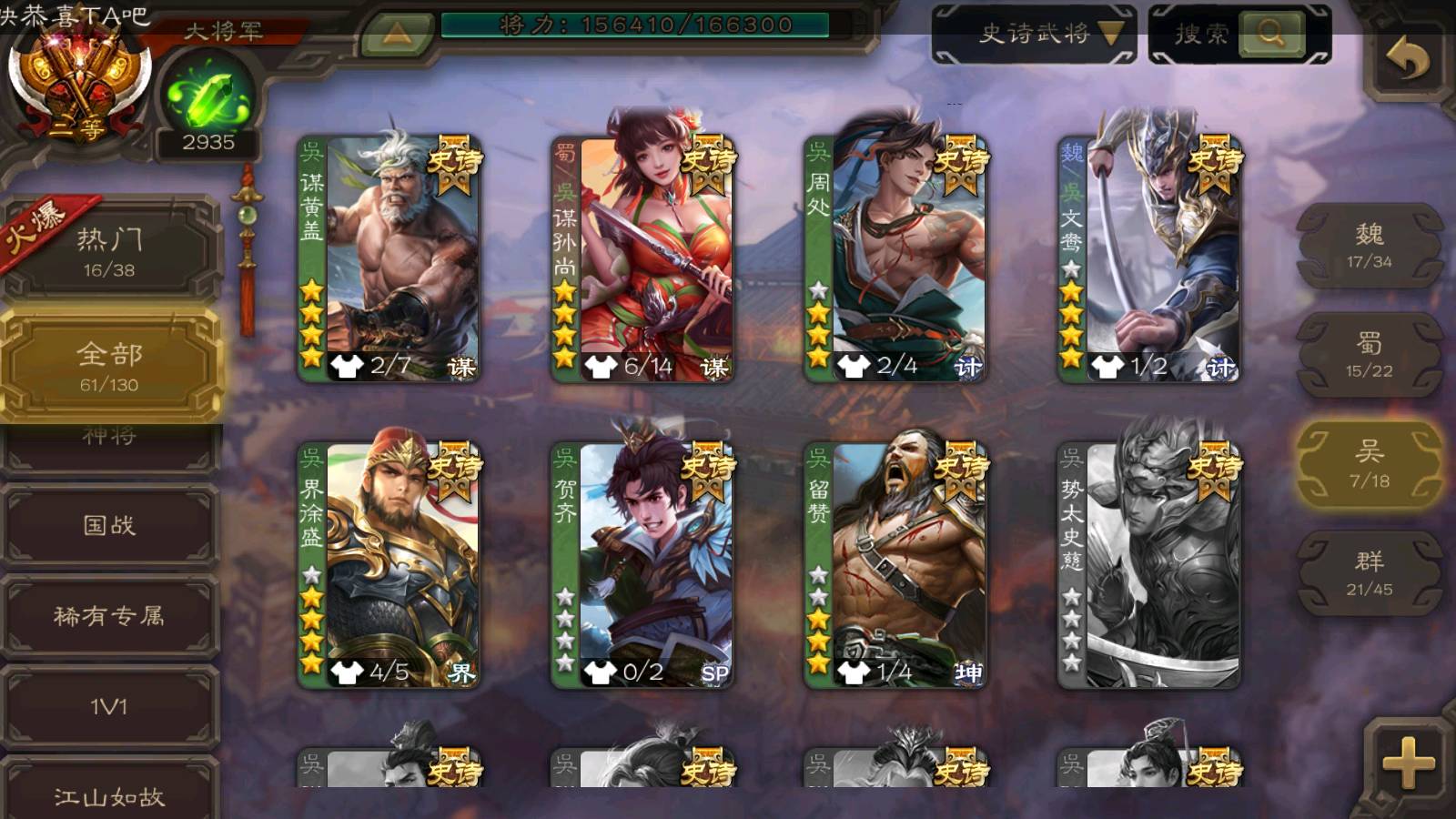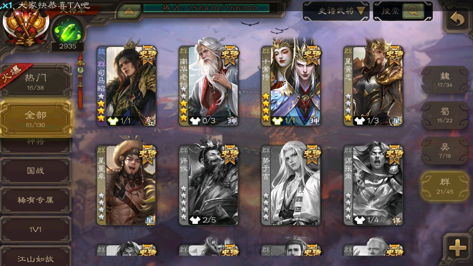 (群雄):刘焉,杜预,界左慈,南华老仙,麴义,界沮授,星董卓,谋貂蝉,司马昭,界李儒,苏飞,十常侍,裴秀,卑弥呼,王允,陶谦,审配,星黄忠,左慈,沮授,兀突骨