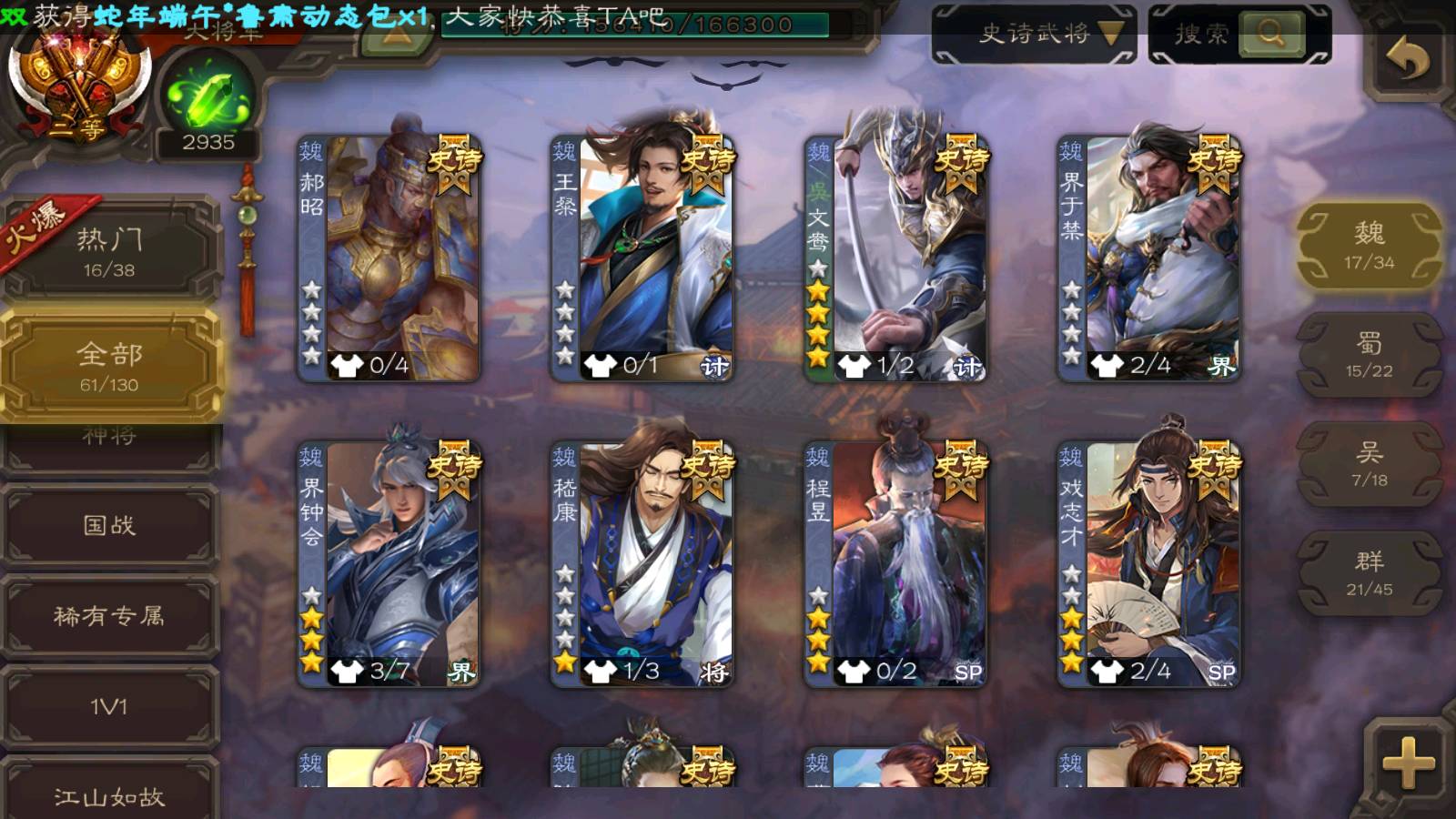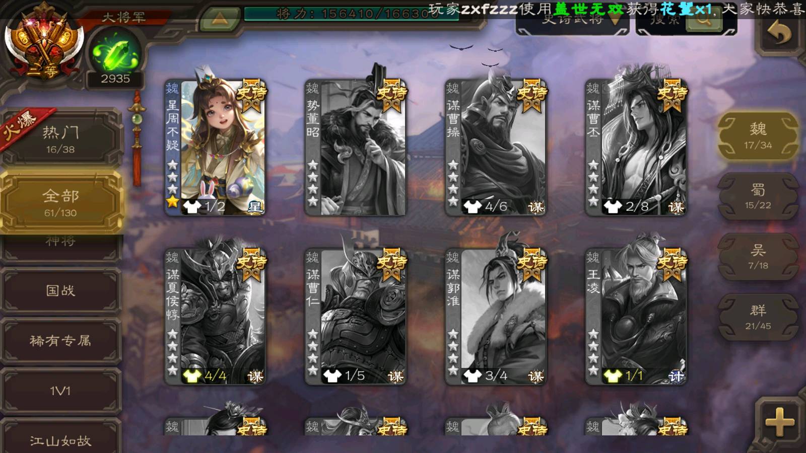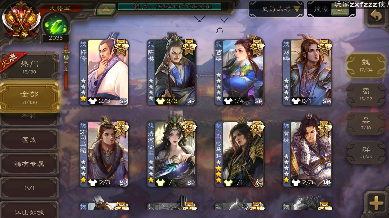 (魏国):曹婴,文鸯,戏志才,界钟会,SP司马昭,清河公主,界于禁,郝昭,王粲,星周不疑,程昱,曹纯,杨修,陈琳,嵇康,刘晔