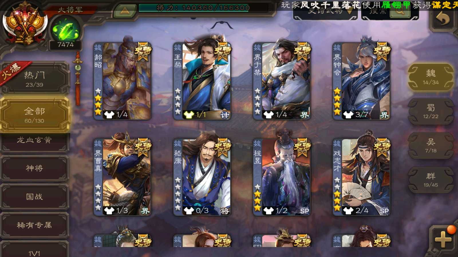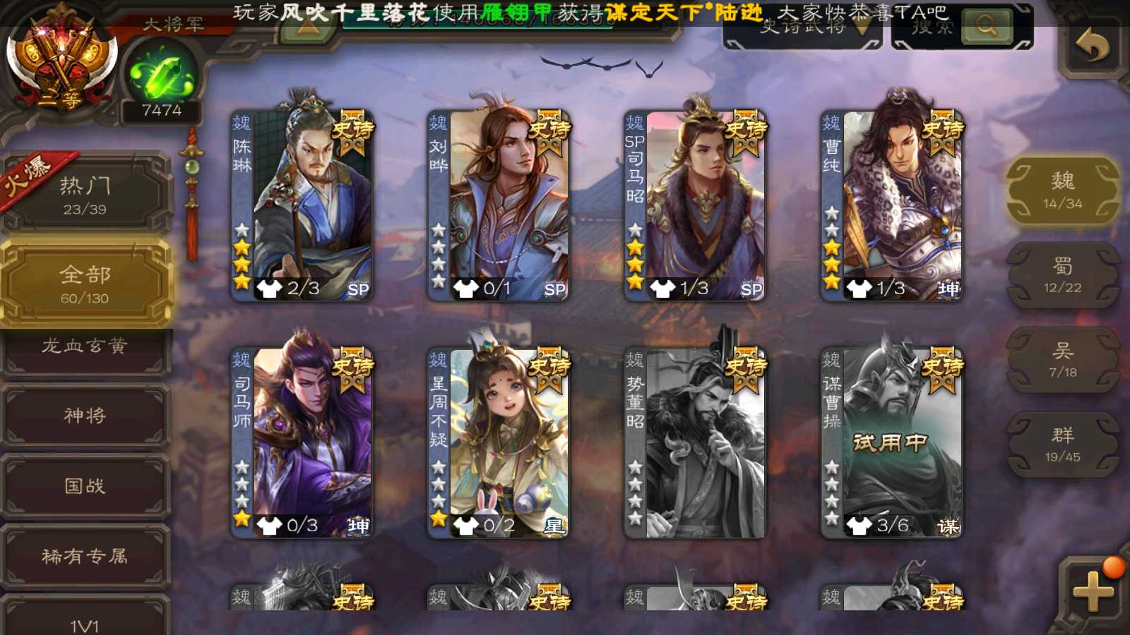(魏国):戏志才,界钟会,SP司马昭,司马师,界于禁,郝昭,王粲,界曹真,星周不疑,程昱,曹纯,陈琳,嵇康,刘晔