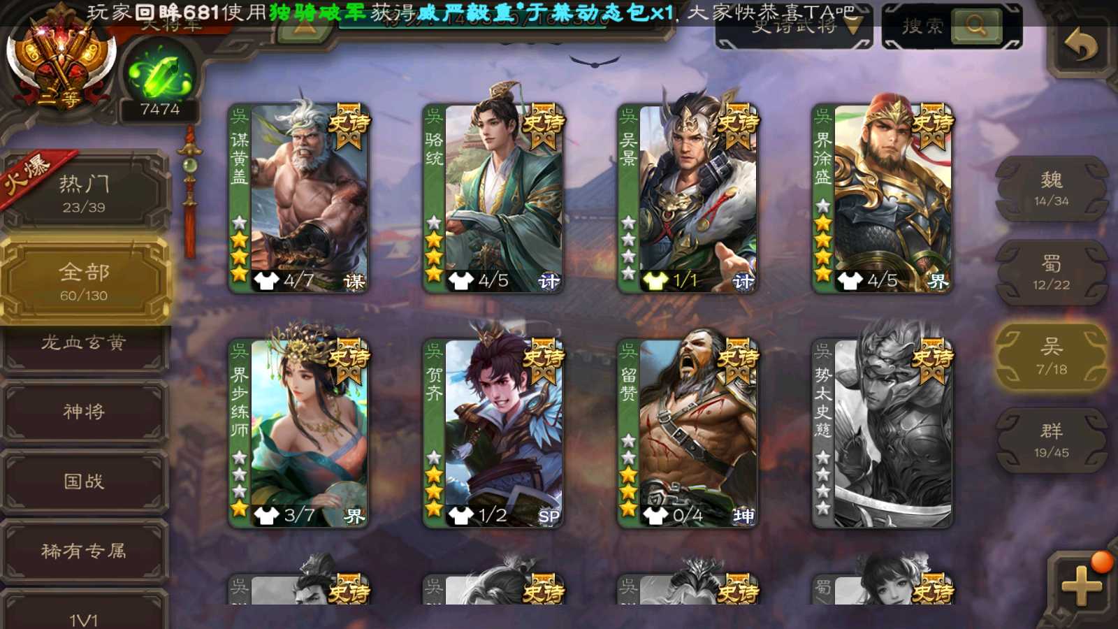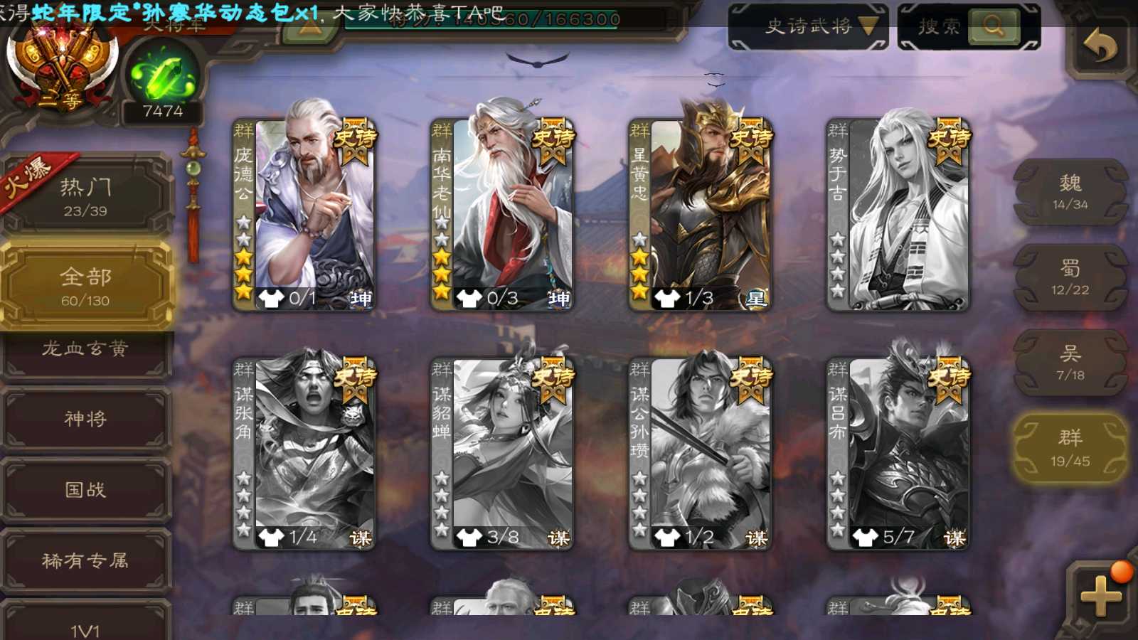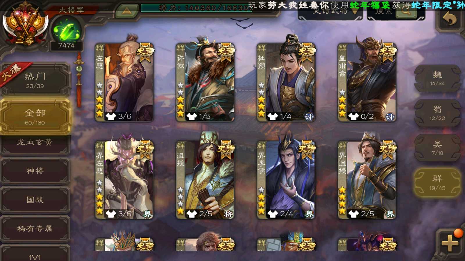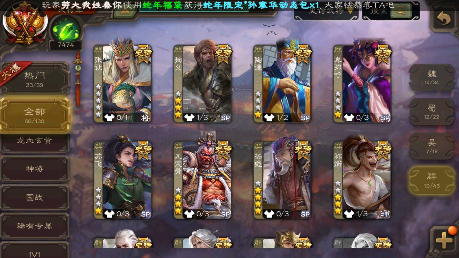 (群雄):杨彪,杜预,祢衡,界左慈,南华老仙,麴义,许攸,界沮授,庞德公,张让,界李儒,苏飞,皇甫嵩,卑弥呼,陶谦,星黄忠,左慈,沮授,兀突骨