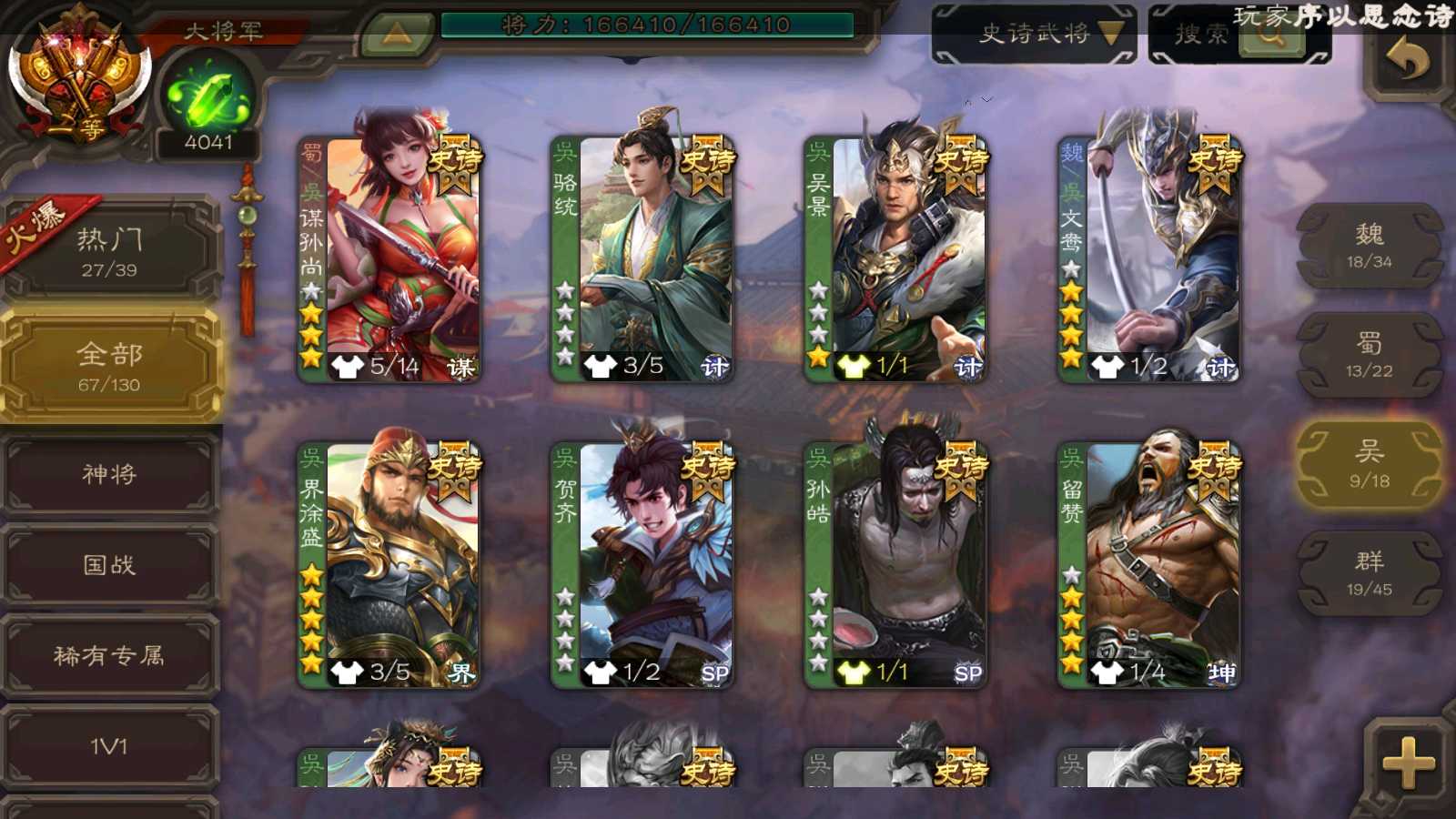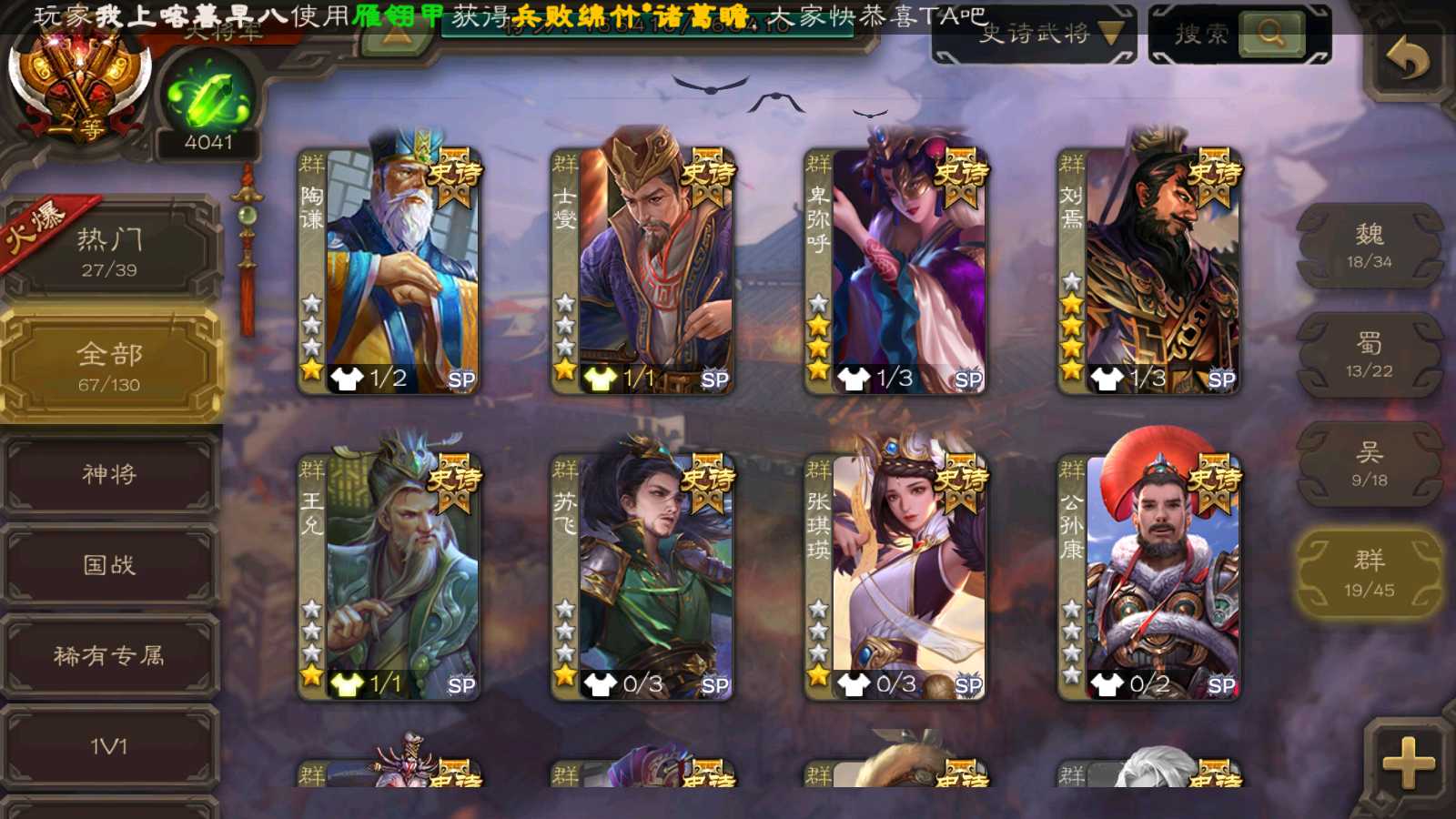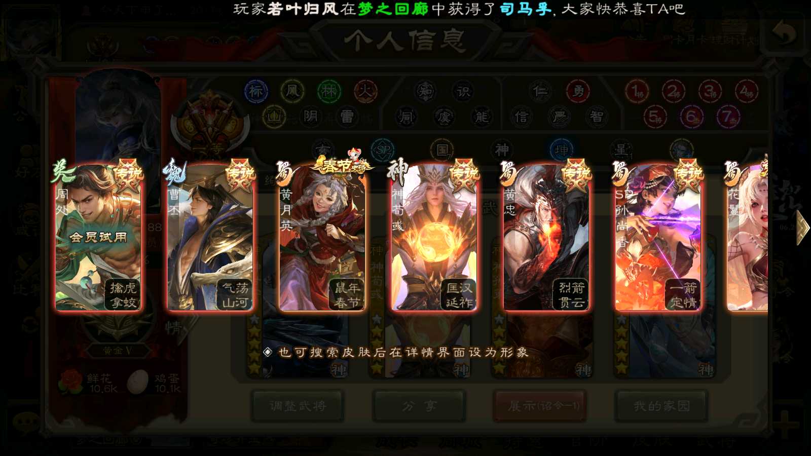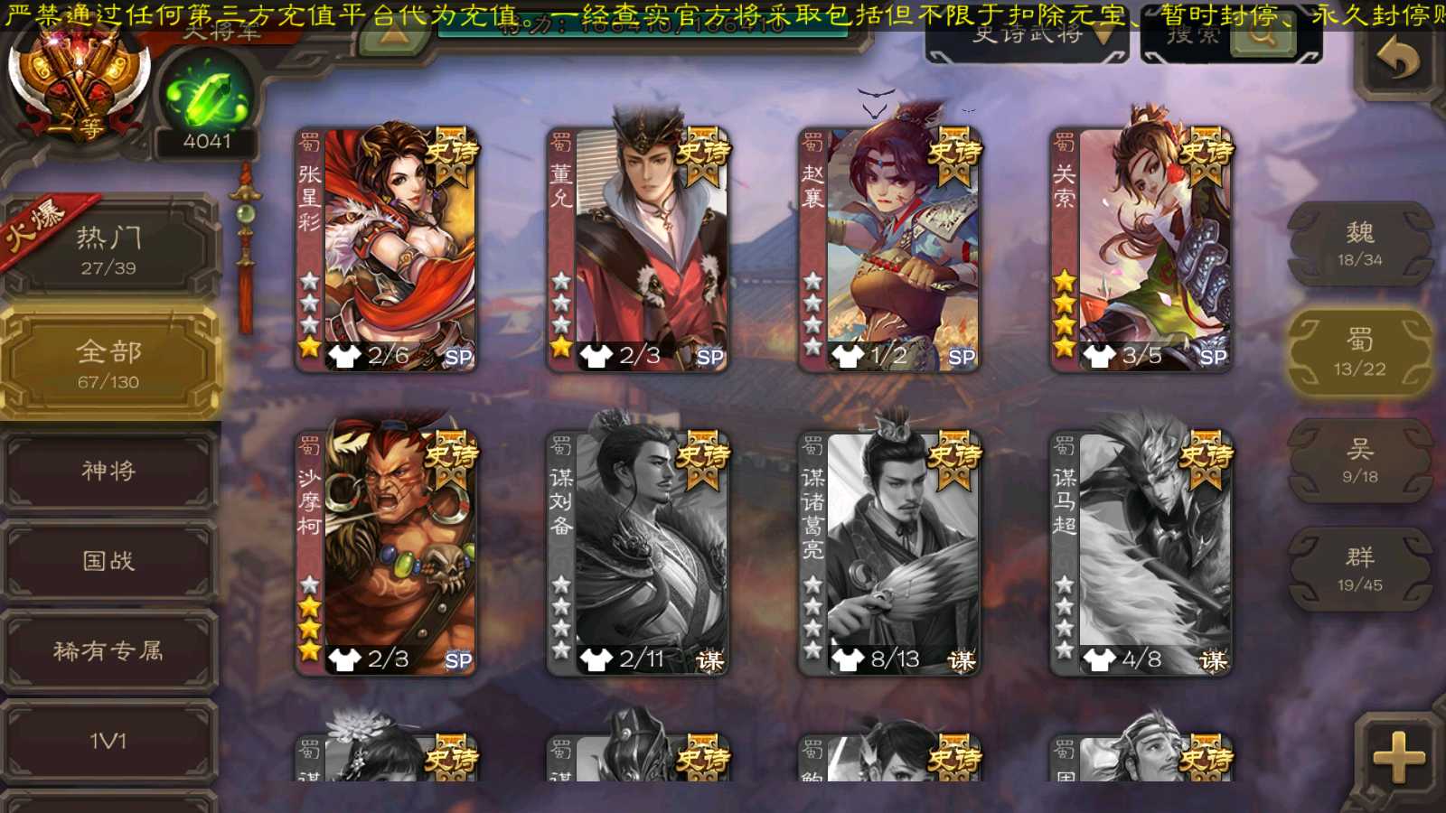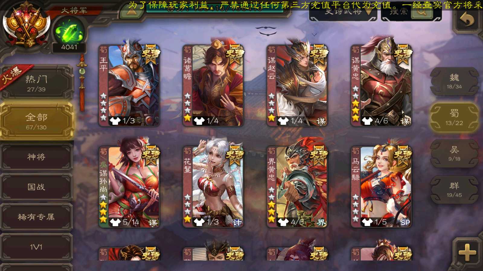 (蜀国):界黄忠,谋黄忠,谋孙尚香,诸葛瞻,谋赵云,花鬘,沙摩柯,关索,张星彩,王平,马云騄,董允,赵襄
