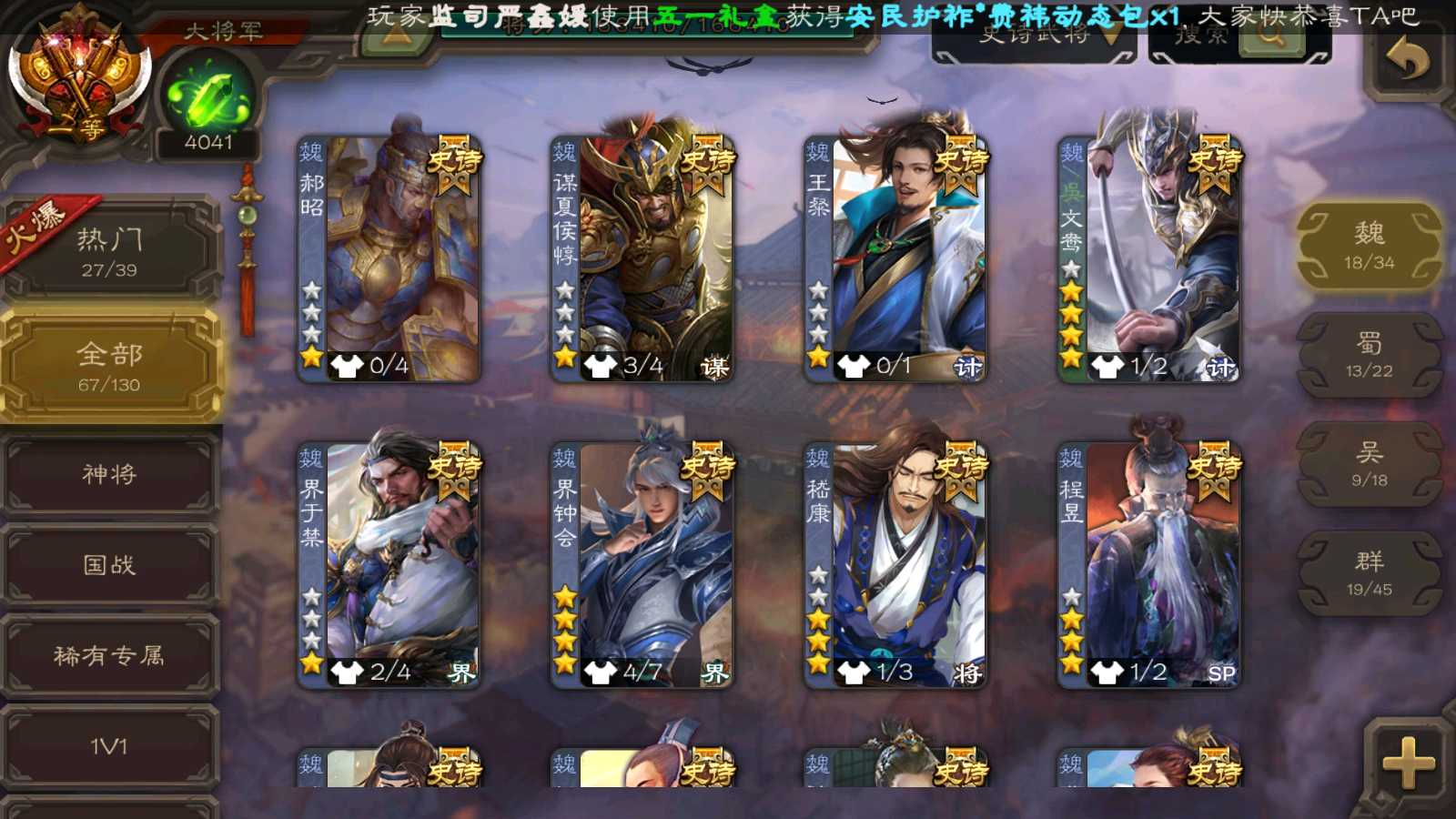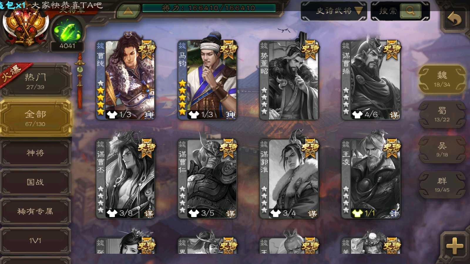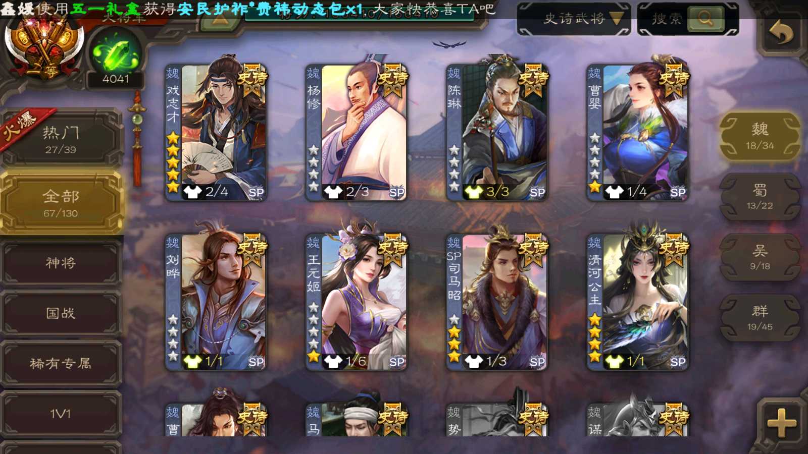 (魏国):曹婴,马钧,王元姬,文鸯,戏志才,界钟会,SP司马昭,清河公主,界于禁,谋夏侯惇,郝昭,王粲,程昱,曹纯,杨修,陈琳,嵇康,刘晔