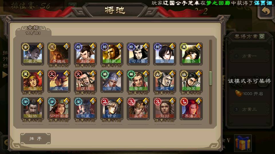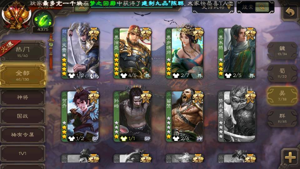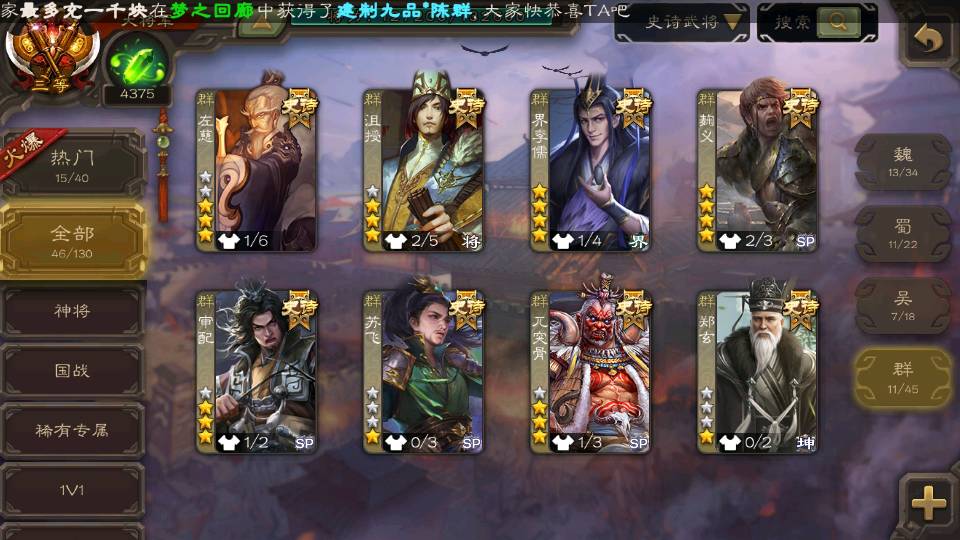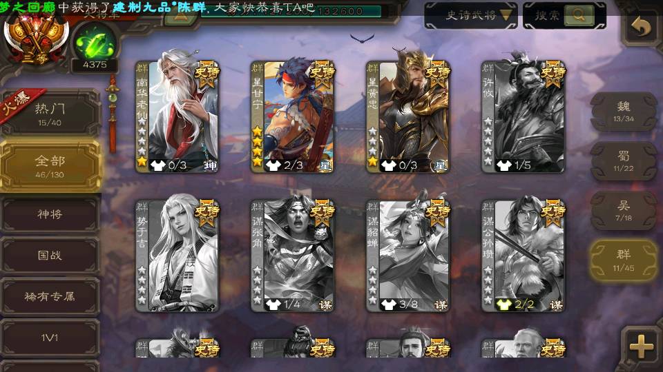 (群雄):南华老仙,麴义,界李儒,苏飞,星甘宁,郑玄,审配,星黄忠,左慈,沮授,兀突骨