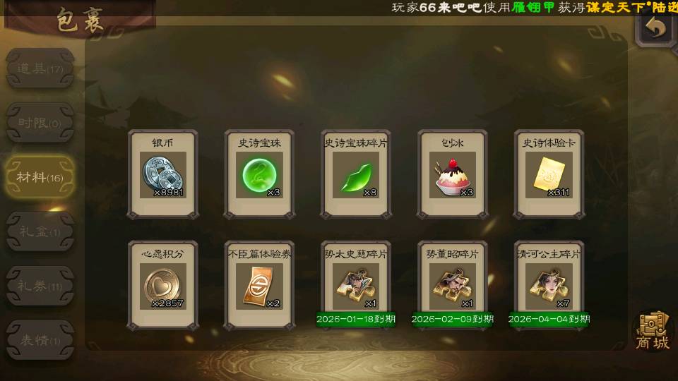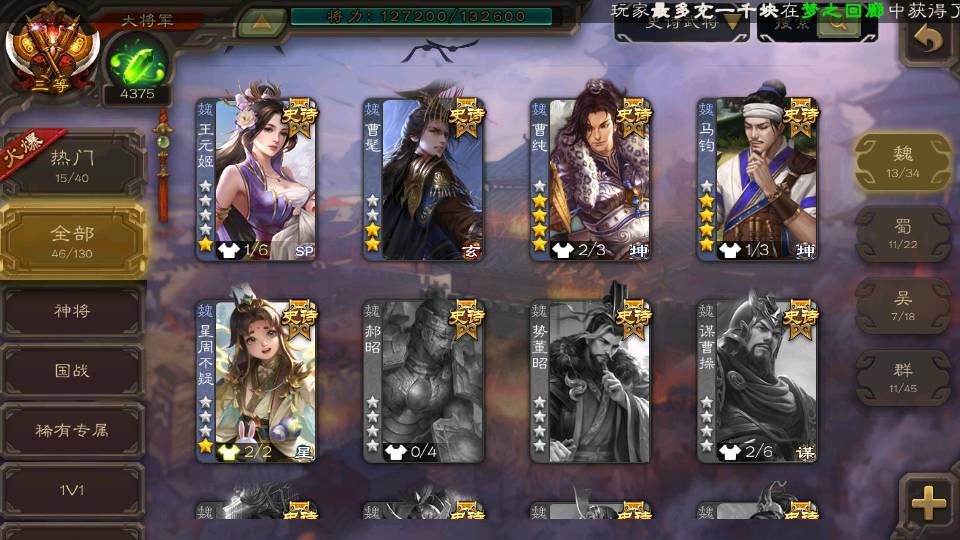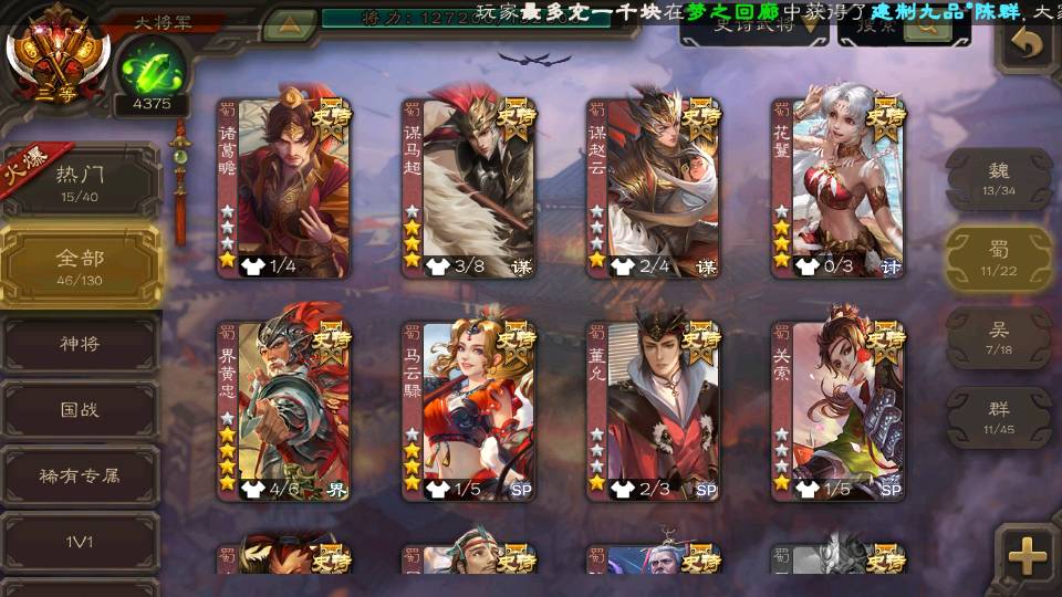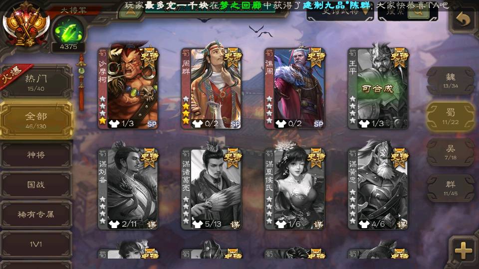 (蜀国):界黄忠,周群,诸葛瞻,谋赵云,花鬘,沙摩柯,谯周,谋马超,关索,马云騄,董允