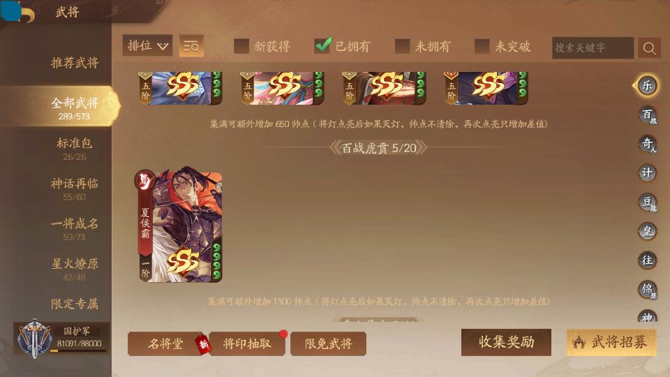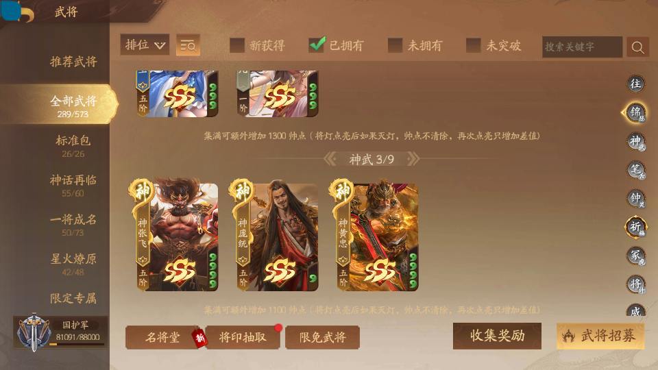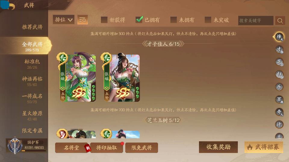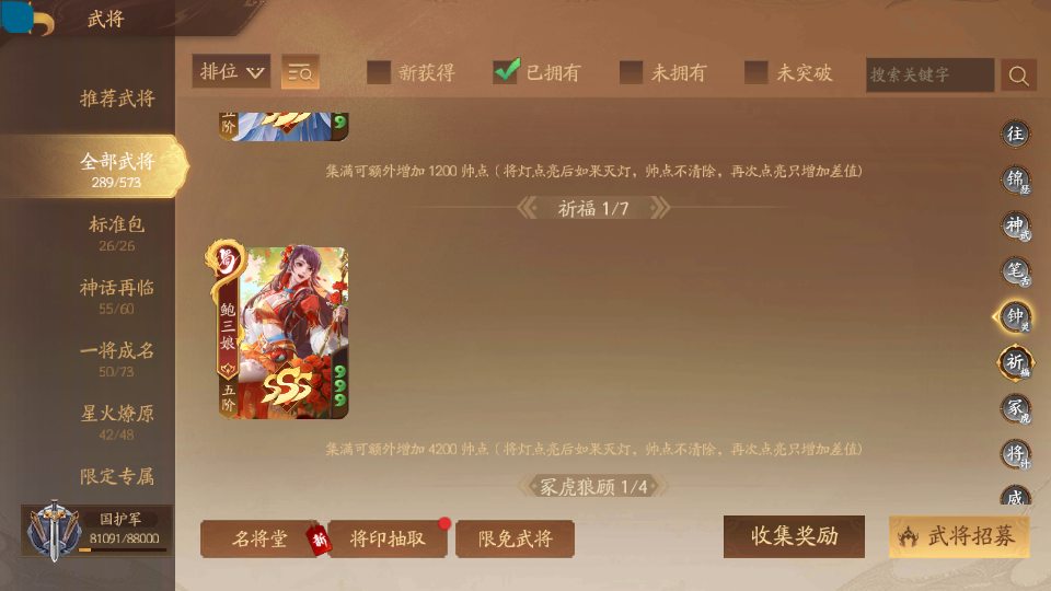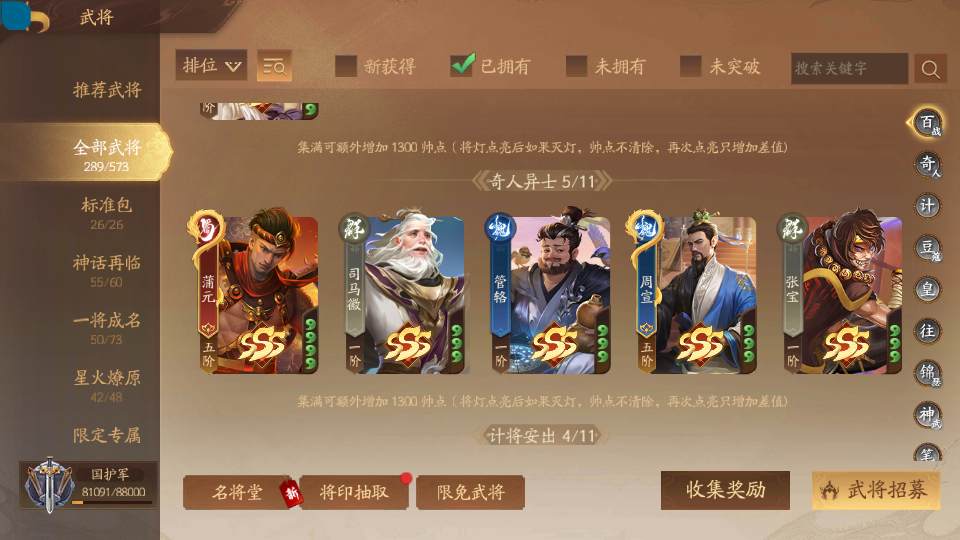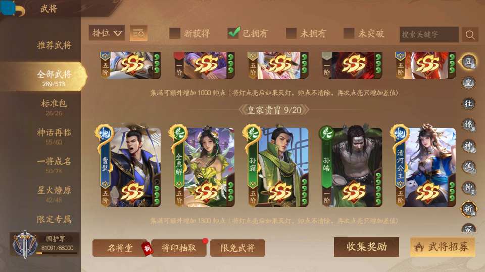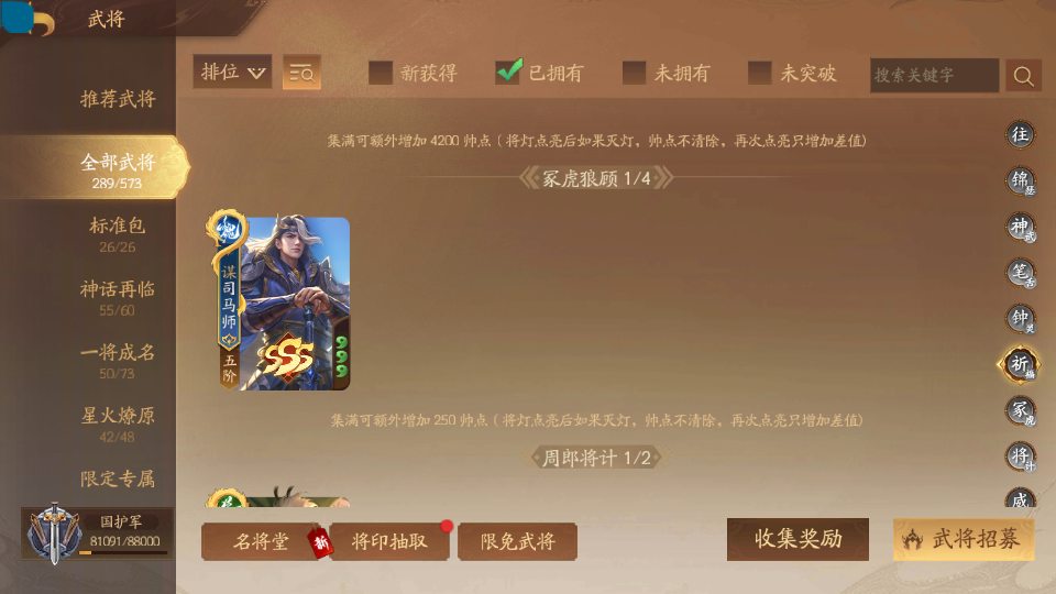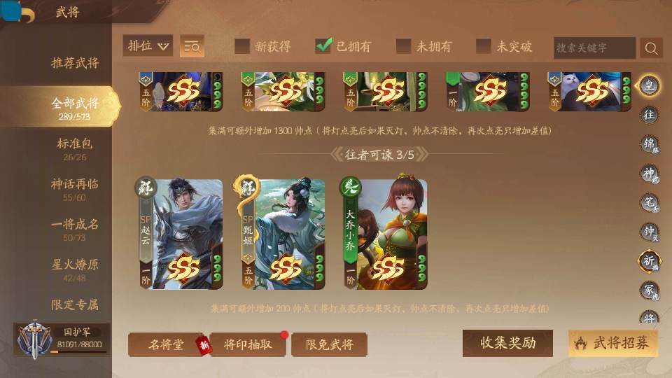 商品编号sa161 武将:神张飞,神庞统,神黄忠,王荣,曹金玉,曹髦,来莺儿,蒲元,管辂,司马徽,鲍三娘,滕公主(限动),张嫙,周宣,薛灵芸(限动),全惠解,乐蔡文姬(限动),乐祢衡 将灵:SSA赵襄 包裹:传世玉4,祈福灯83,V会员6,总武将289,总皮肤814,总国战91,帅点8.1w
