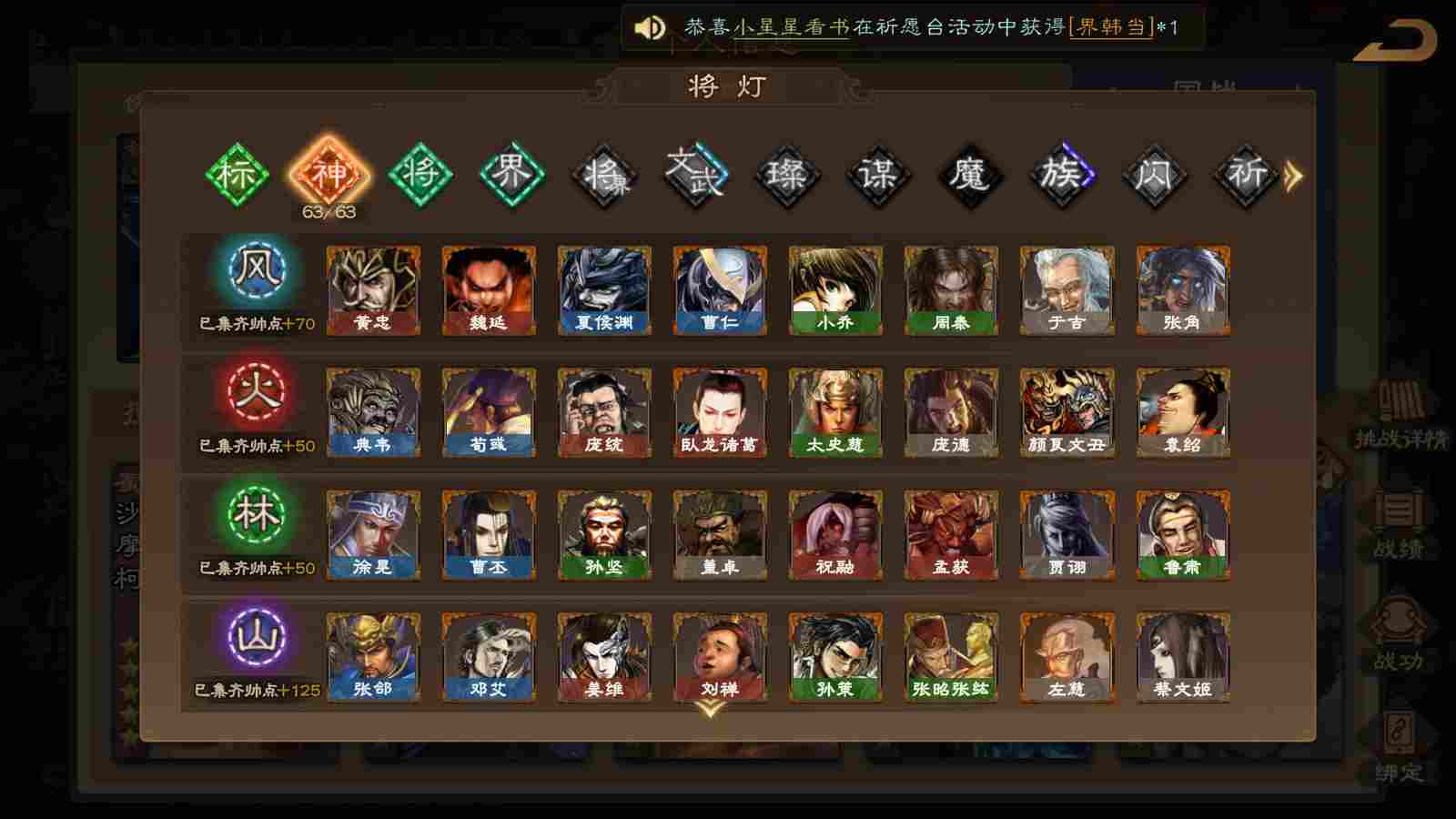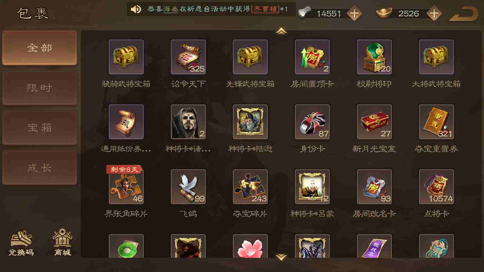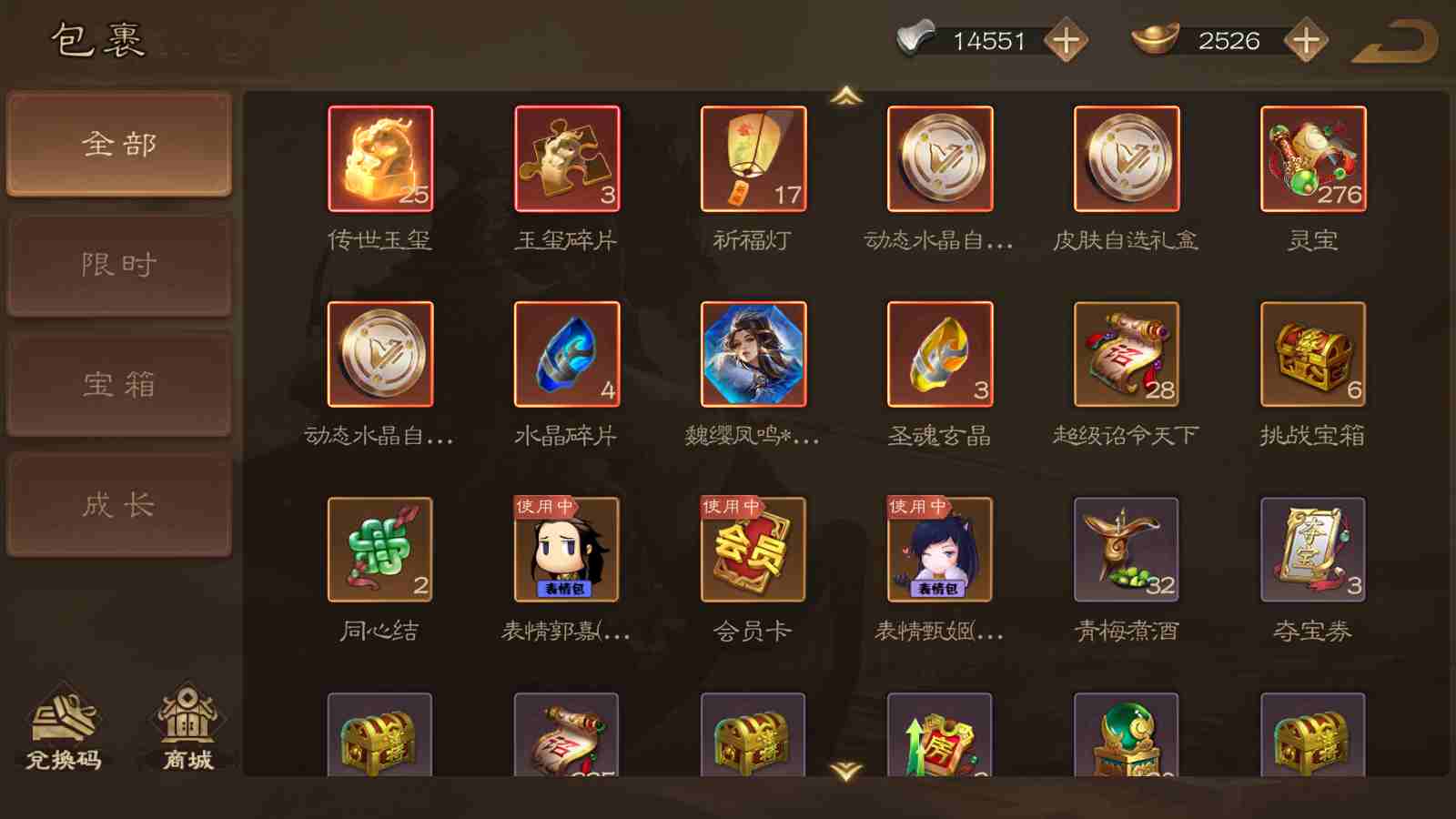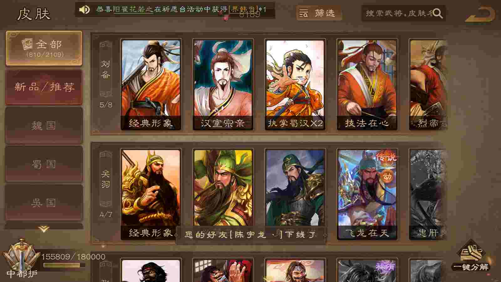 商品编号A064 V9+张琪瑛(动),神张角,杜夫人(动),谋袁绍(动),神灯齐全,界灯只缺界荀彧,总武将405,五阶278,皮肤810,动23 包裹:玉玺25,灵宝276,祈福灯17,官阶中都护15.5w