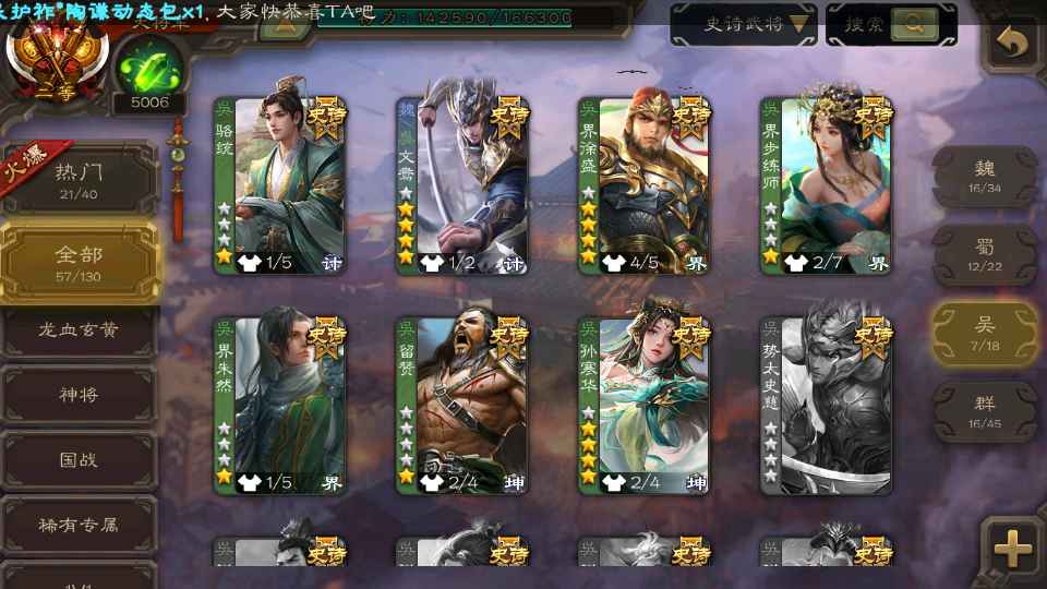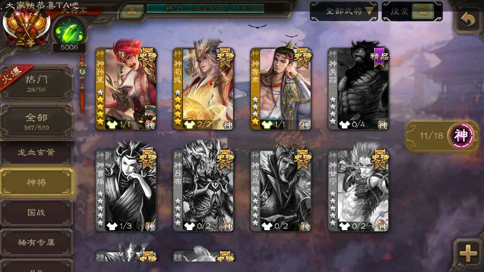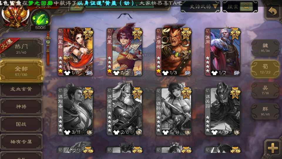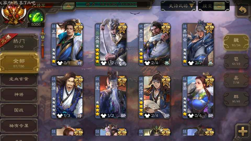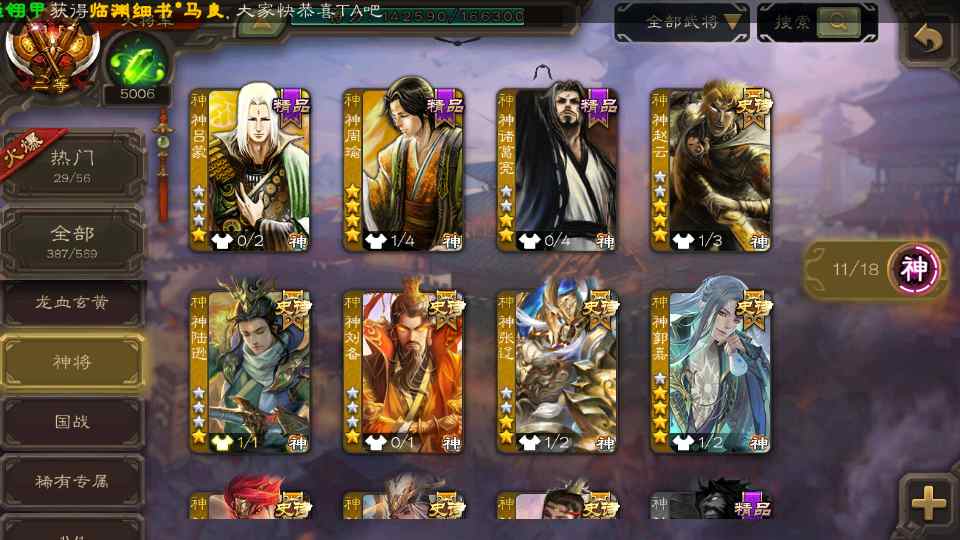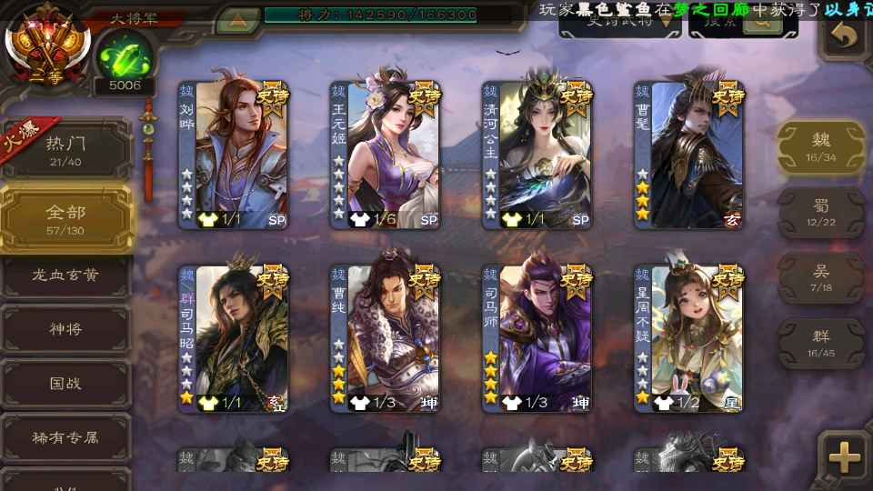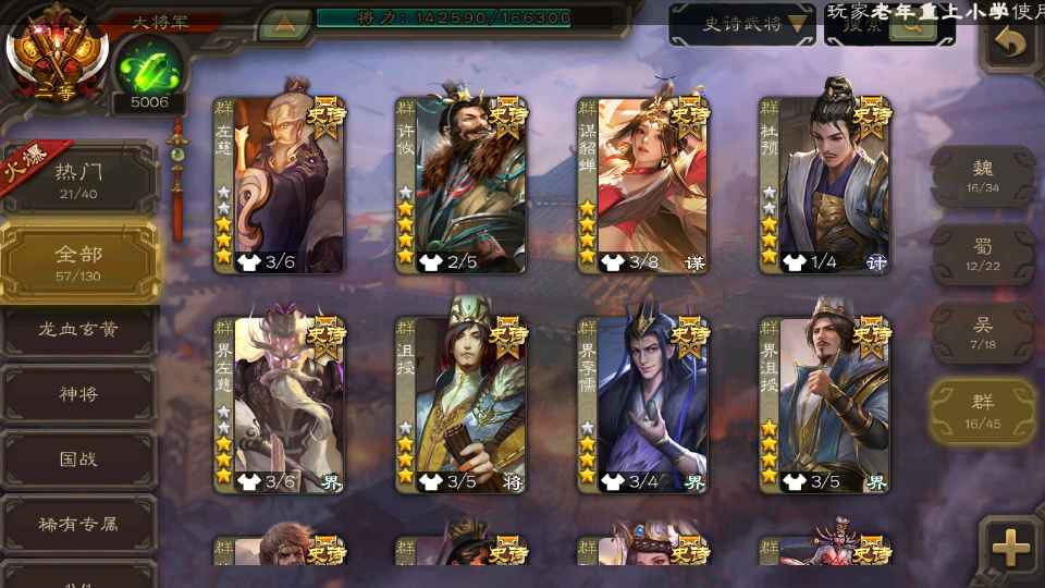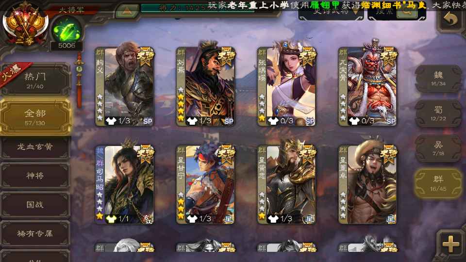 (群雄):刘焉,杜预,界左慈,麴义,许攸,界沮授,星董卓,谋貂蝉,司马昭,界李儒,星甘宁,张琪瑛,星黄忠,左慈,沮授,兀突骨