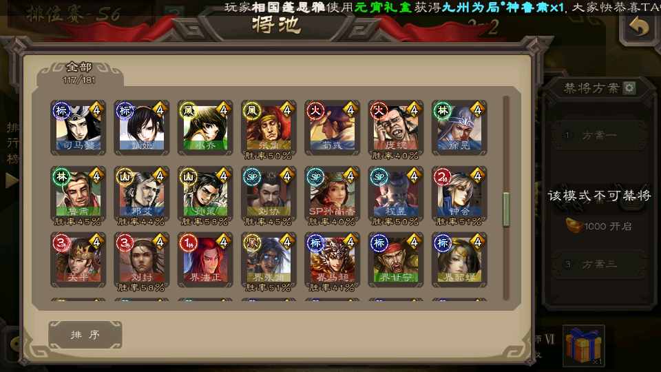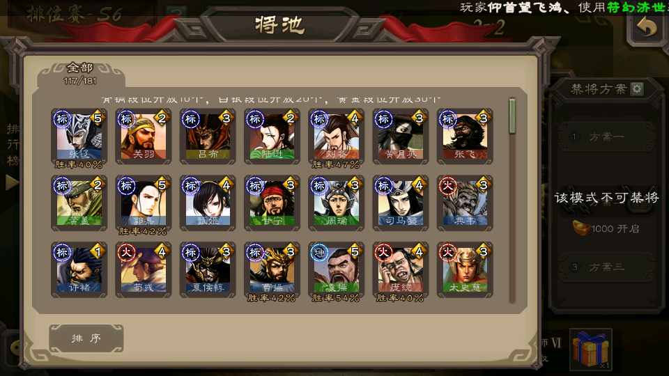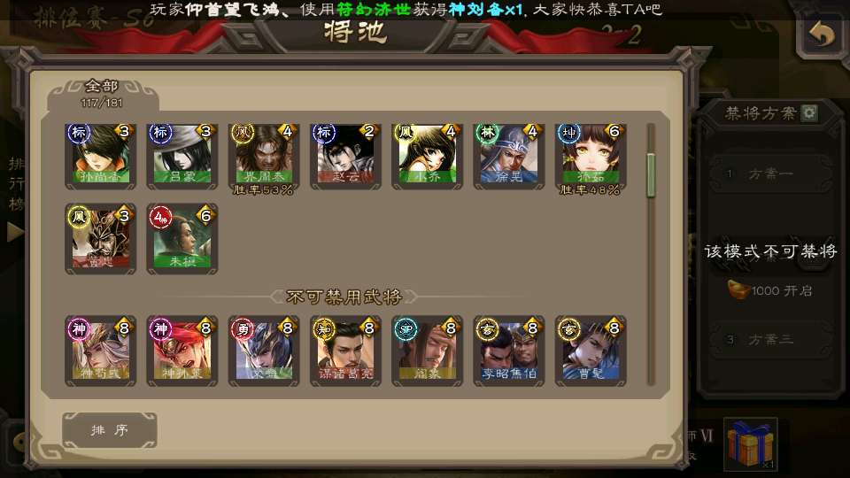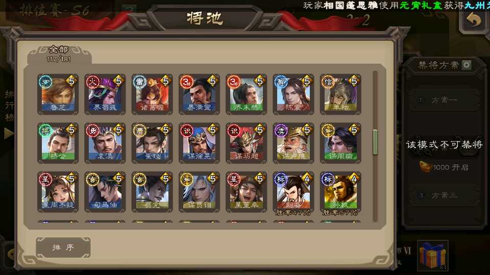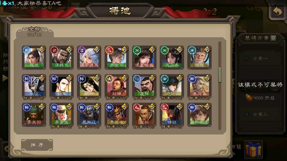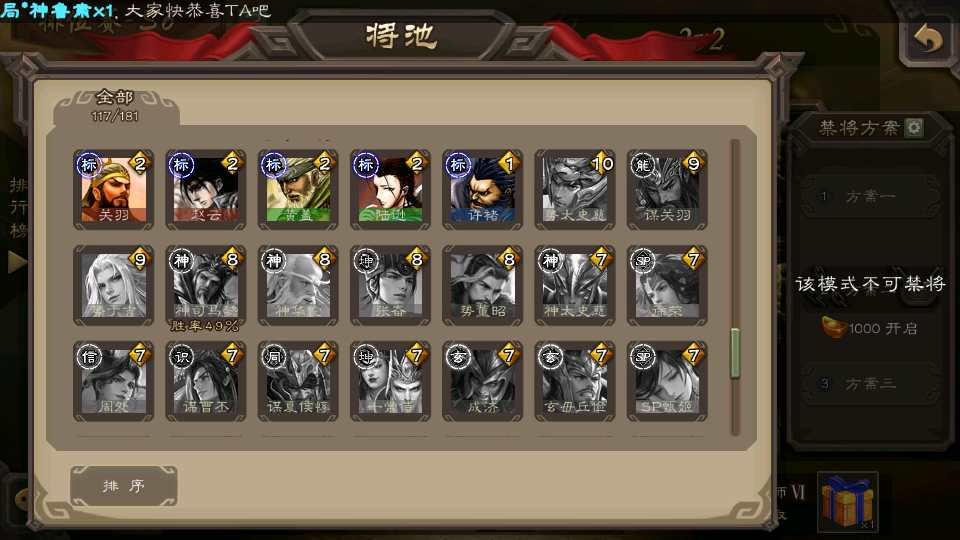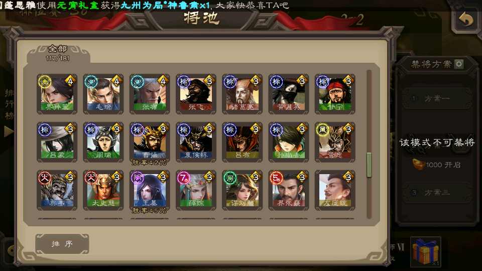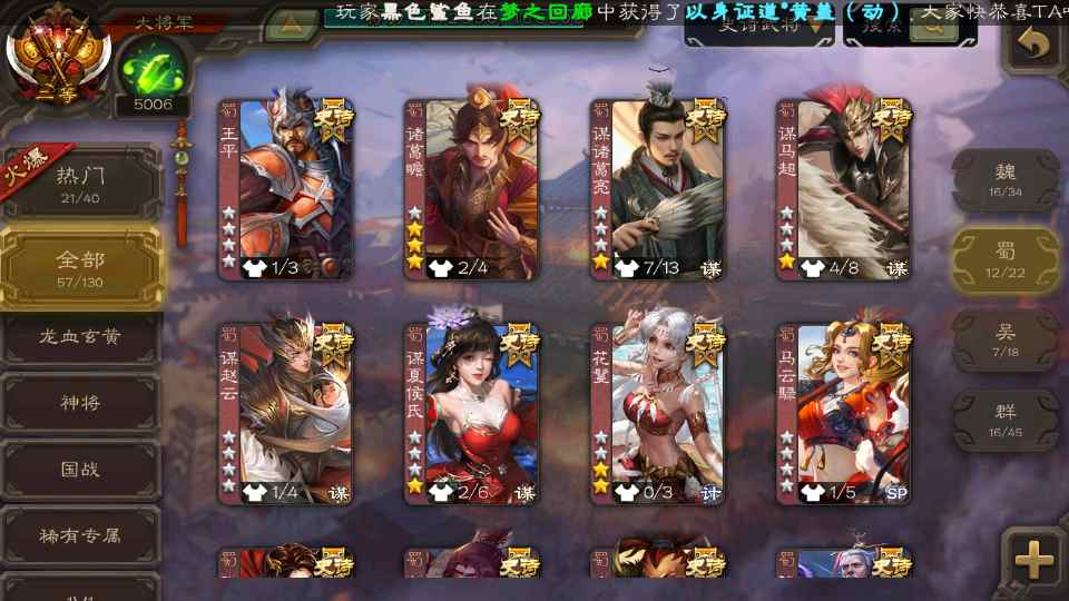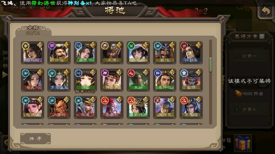 (群雄):刘焉,杜预,界左慈,麴义,许攸,界沮授,星董卓,谋貂蝉,司马昭,界李儒,星甘宁,张琪瑛,星黄忠,左慈,沮授,兀突骨