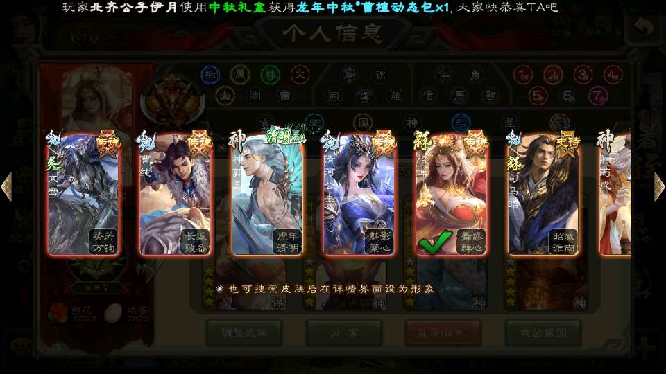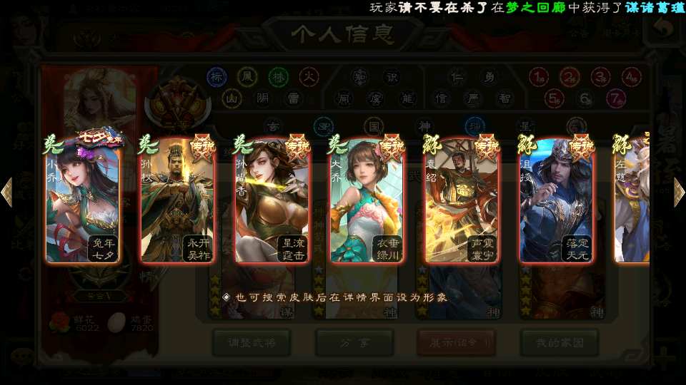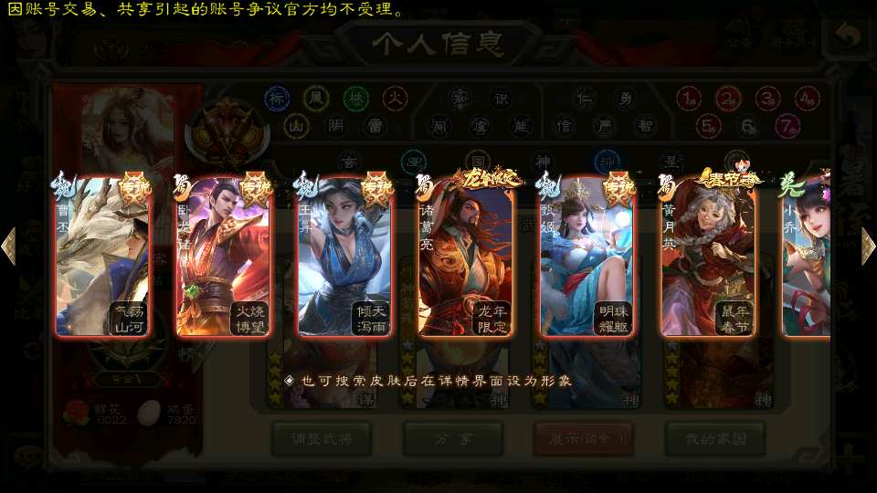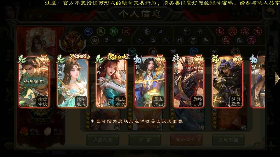 商品编号21822 全部皮肤489,动态皮肤59,全部武将387,排位武将117,国战武将88,史诗武将57,杜预新回廊,界沮授回廊,神荀彧动皮,,小乔手办,神孙策动皮,孙寒华动皮,文鸯动皮,谋貂蝉回廊,宝珠21,欢乐豆2.1w,金票7.3w,雁翎3.1w,将魂5k