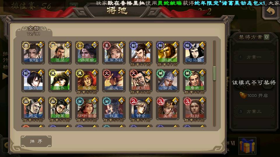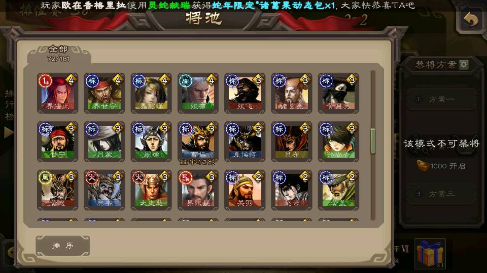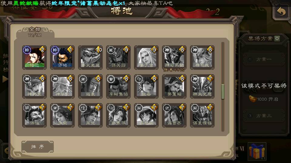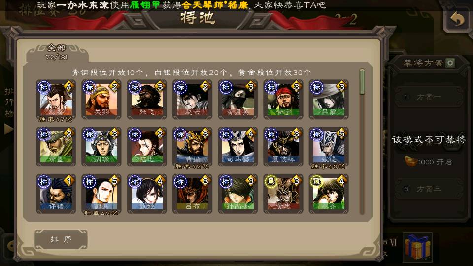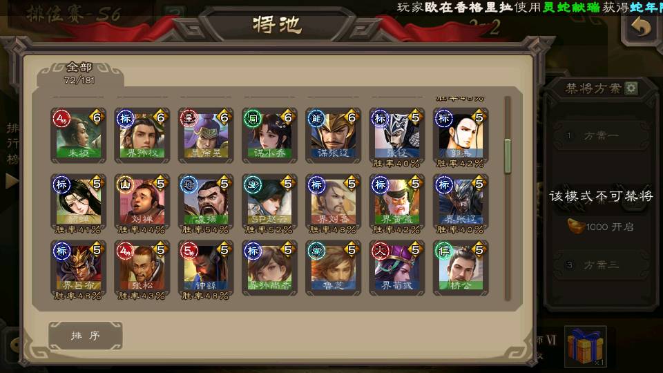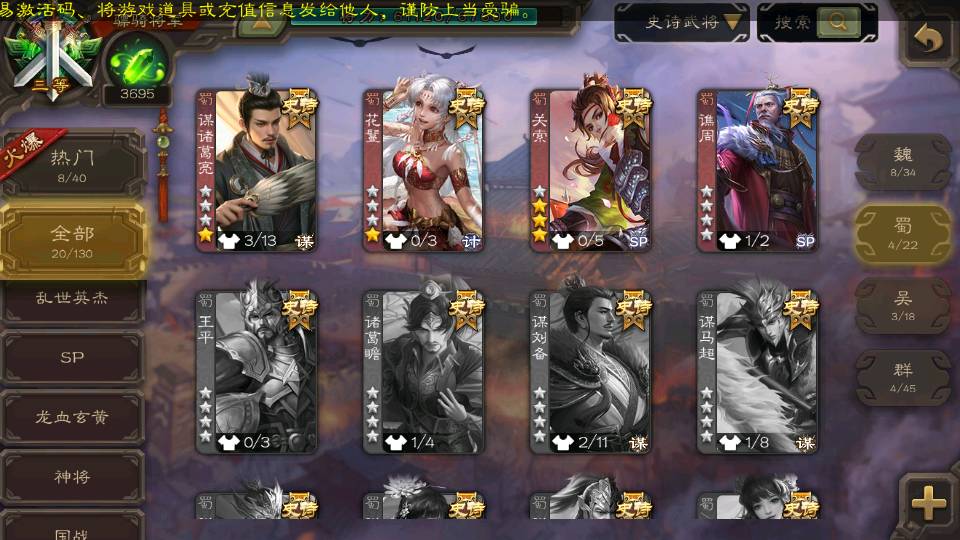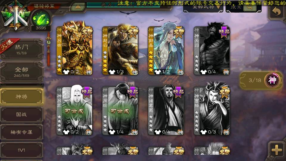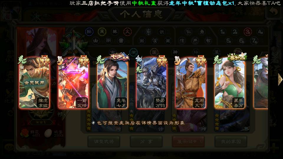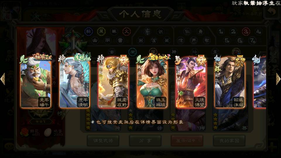商品编号21830 全部皮肤261,动态皮肤15,全部武将240,排位武将72,国战武将76,史诗武将20,界钟会回廊,十常侍回廊,文鸯动皮,雁翎5.9w,将魂3.6k