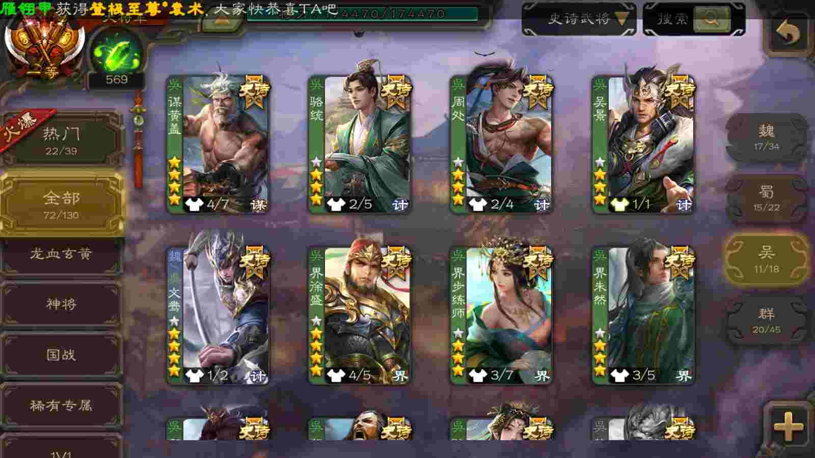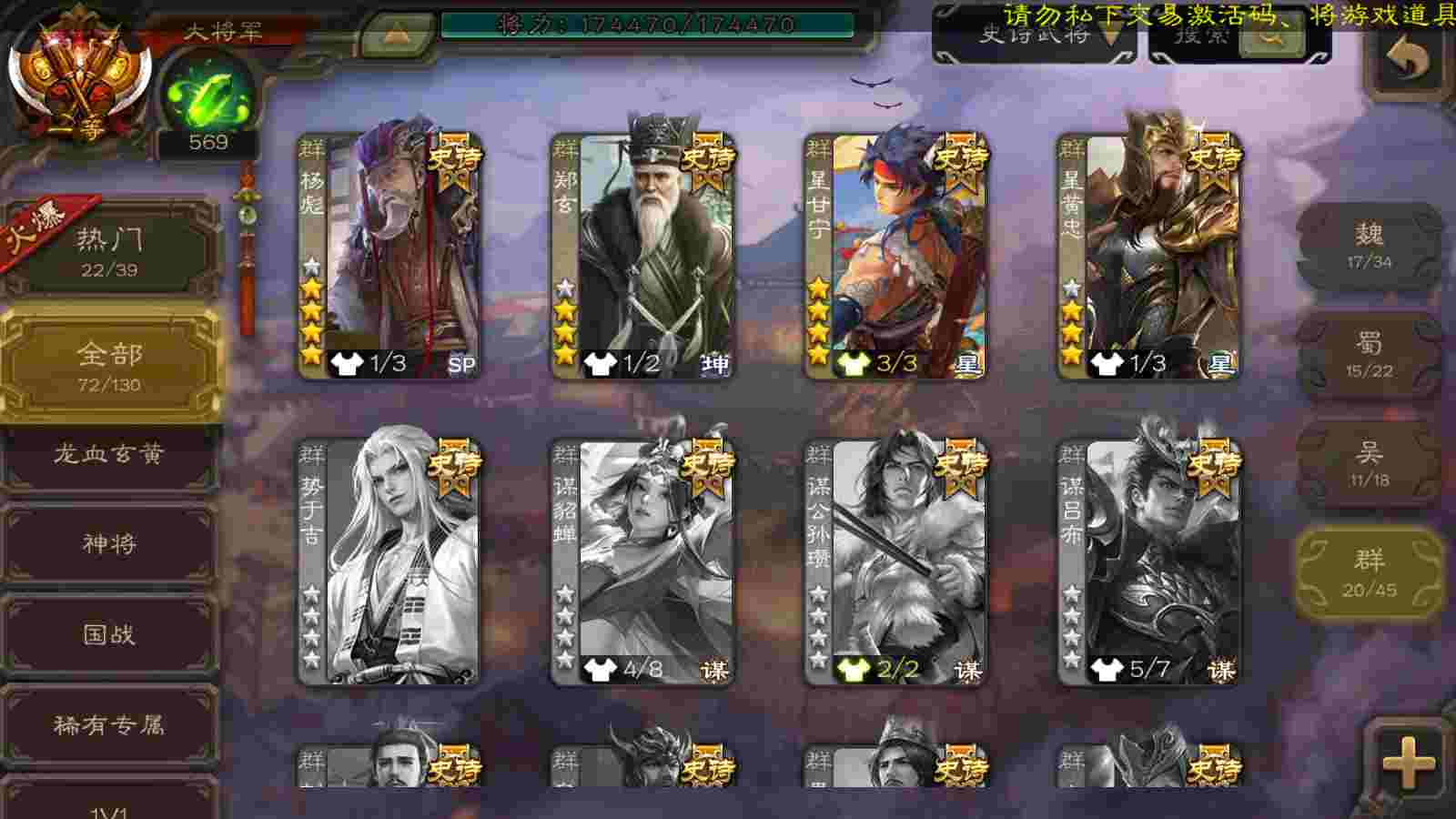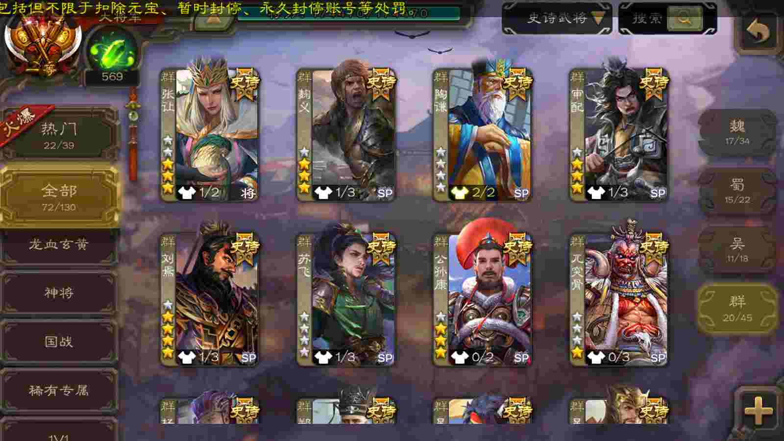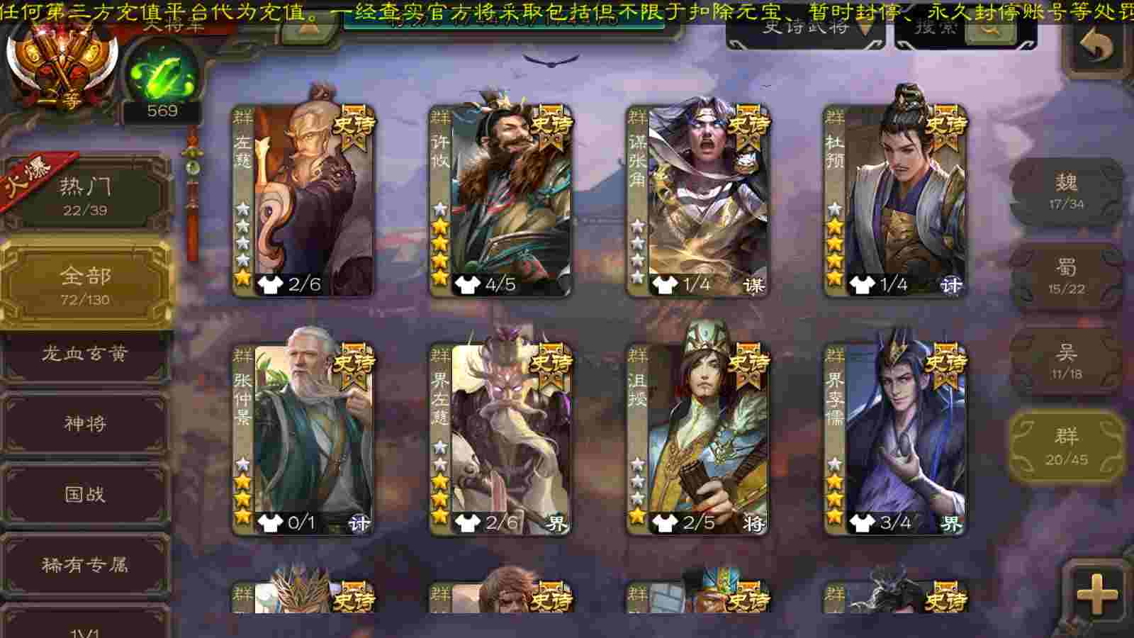 (群雄):刘焉,杨彪,杜预,界左慈,麴义,许攸,张仲景,张让,界李儒,苏飞,星甘宁,谋张角,陶谦,审配,公孙康,郑玄,星黄忠,左慈,沮授,兀突骨