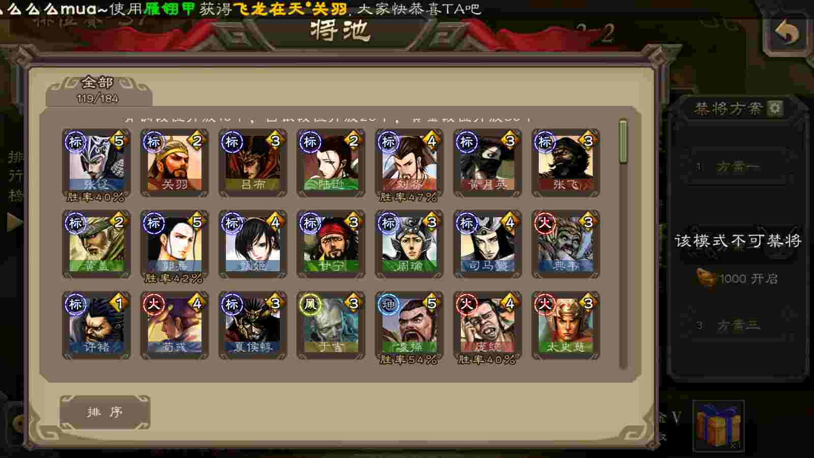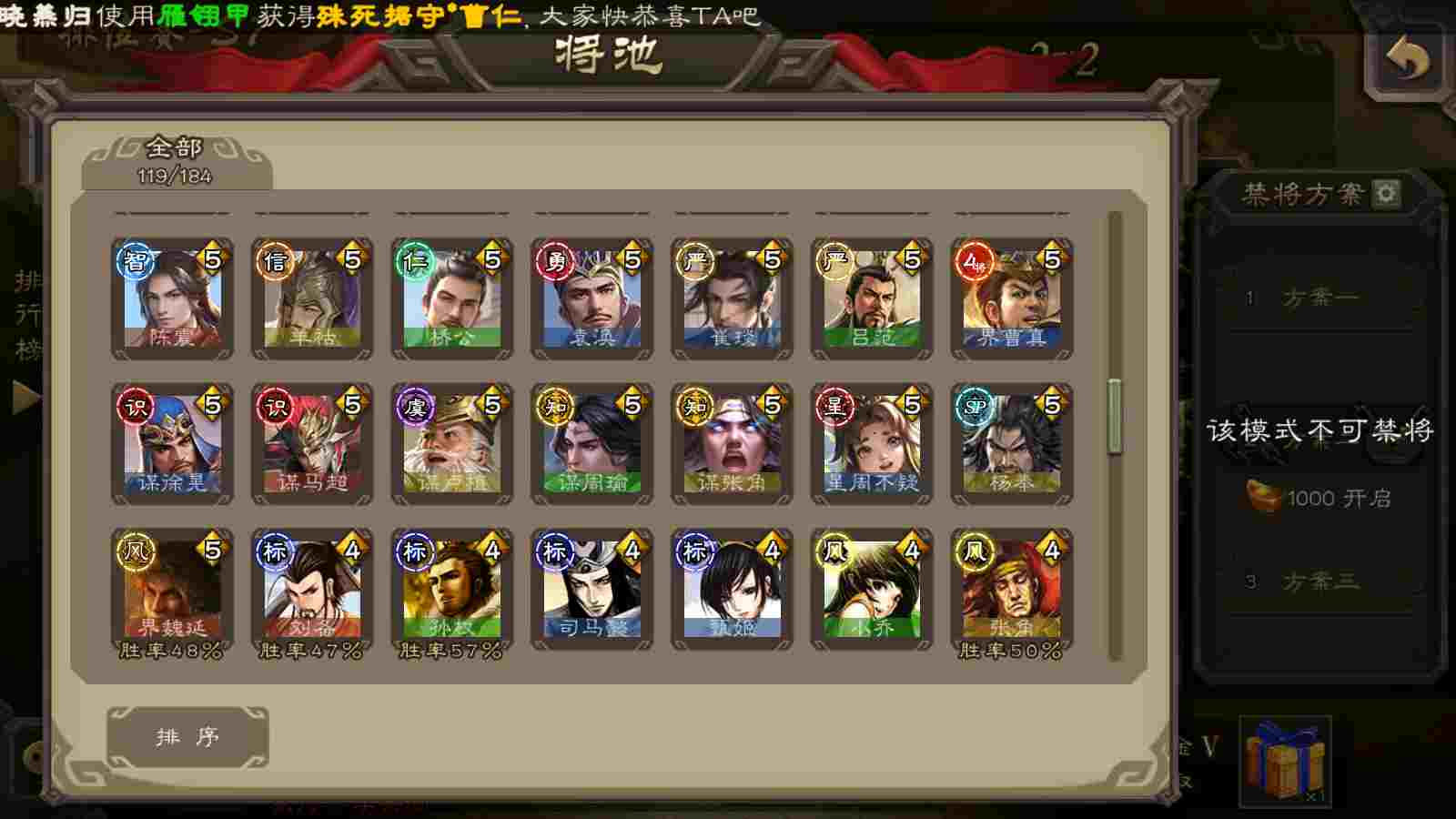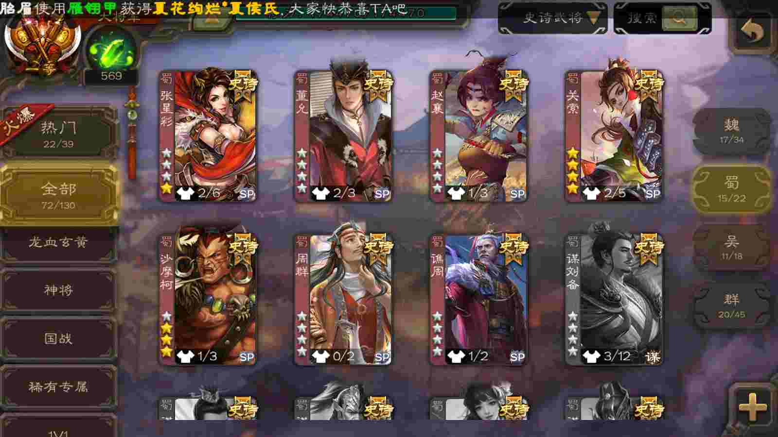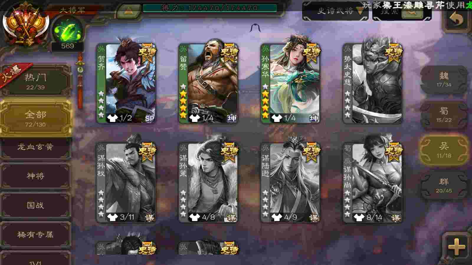 (群雄):刘焉,杨彪,杜预,界左慈,麴义,许攸,张仲景,张让,界李儒,苏飞,星甘宁,谋张角,陶谦,审配,公孙康,郑玄,星黄忠,左慈,沮授,兀突骨