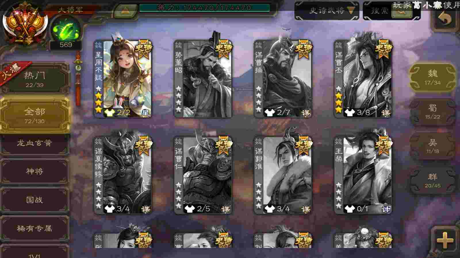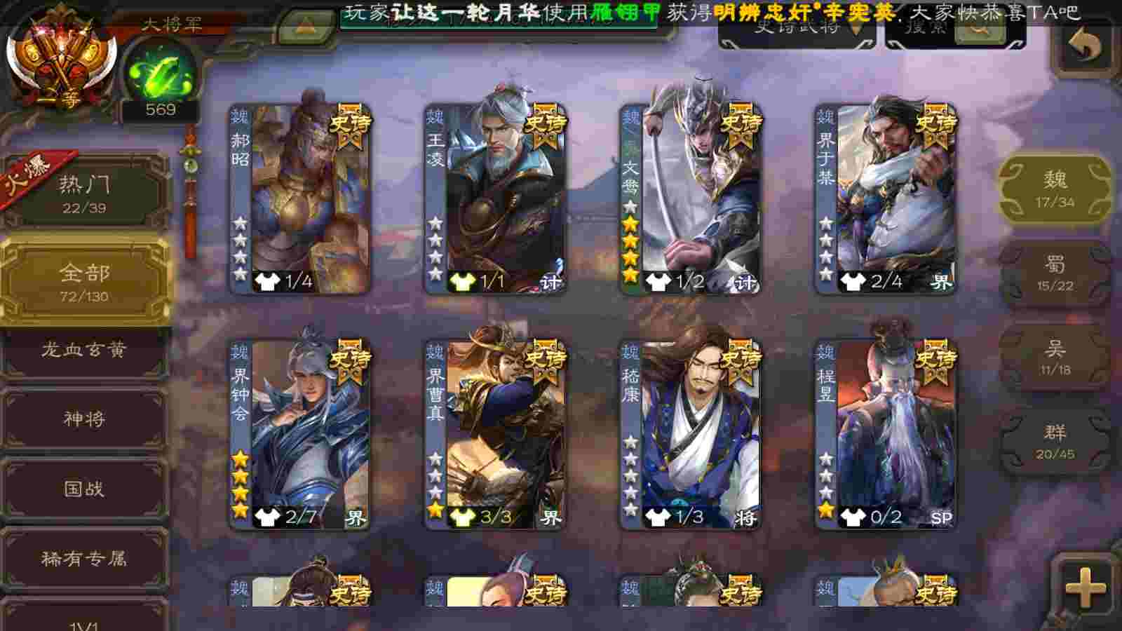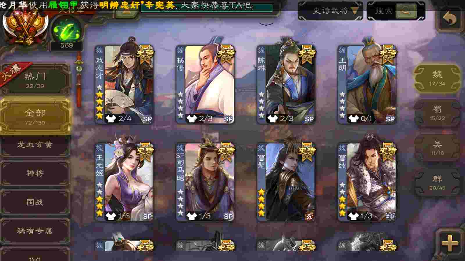 (魏国):王元姬,曹髦,文鸯,戏志才,界钟会,SP司马昭,王朗,界于禁,郝昭,王粲,界曹真,星周不疑,程昱,曹纯,杨修,陈琳,嵇康