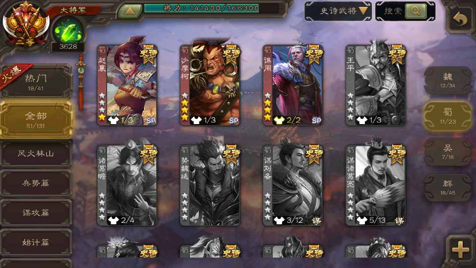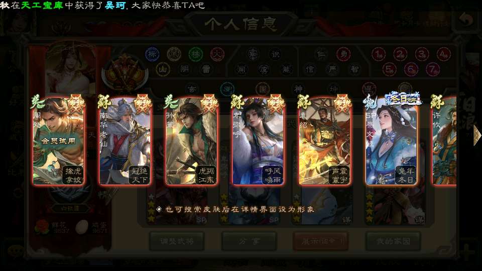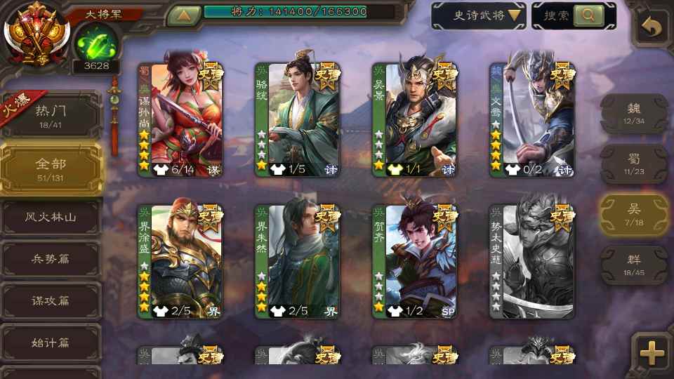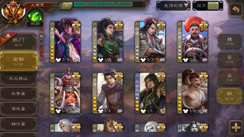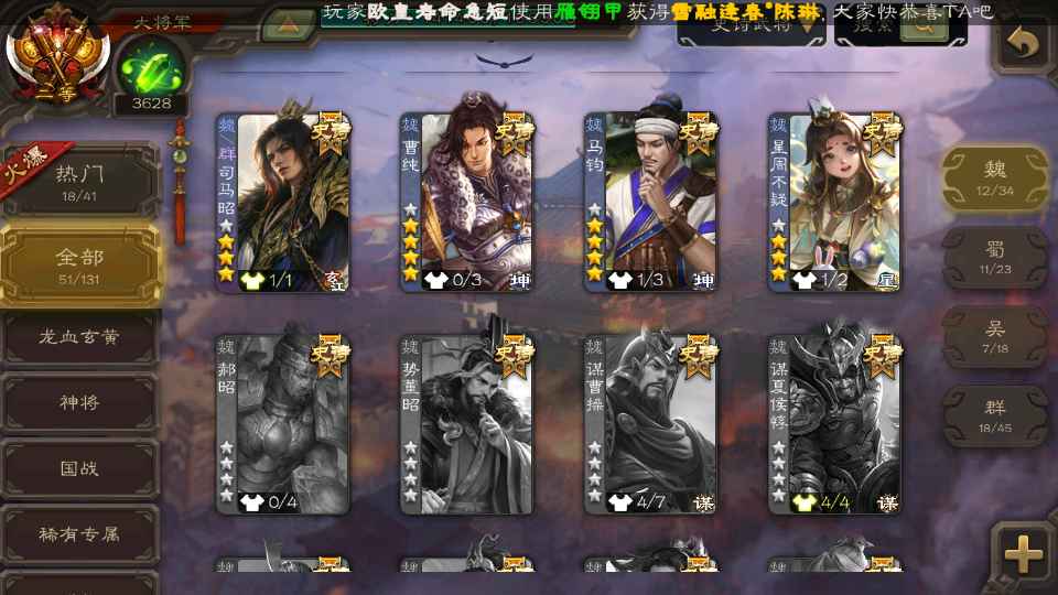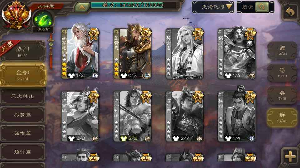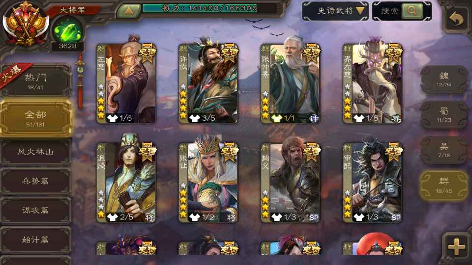 (群雄):祢衡,界左慈,张仲景,南华老仙,麴义,许攸,司马昭,裴秀,张让,苏飞,卑弥呼,审配,公孙康,星黄忠,陈登,左慈,沮授,兀突骨