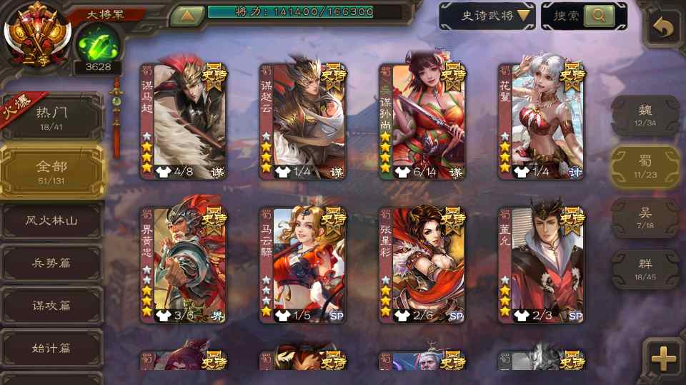 (蜀国):谋孙尚香,谋赵云,界黄忠,沙摩柯,花鬘,谯周,谋马超,张星彩,马云騄,董允,赵襄