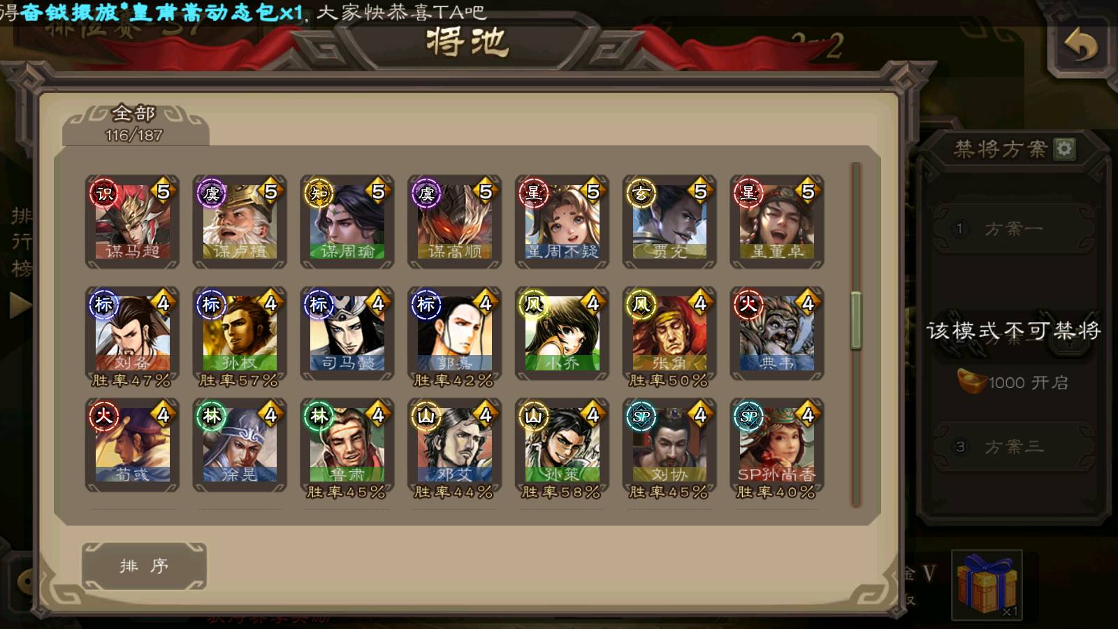 (群雄):杨彪,杜预,界左慈,界沮授,南华老仙,谋貂蝉,麴义,司马昭,谋公孙瓒,界李儒,苏飞,卑弥呼,星董卓,星黄忠,左慈,沮授,兀突骨