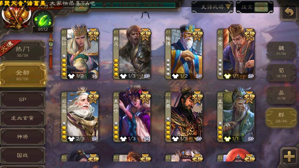 (群雄):刘焉,徐荣,杨彪,杜预,祢衡,界左慈,南华老仙,麴义,许攸,张仲景,星董卓,张让,界李儒,苏飞,庞德公,星甘宁,张琪瑛,卑弥呼,士燮,王允,公孙康,刘璋,郑玄,陶谦,星黄忠,司马徽,左慈,沮授,兀突骨