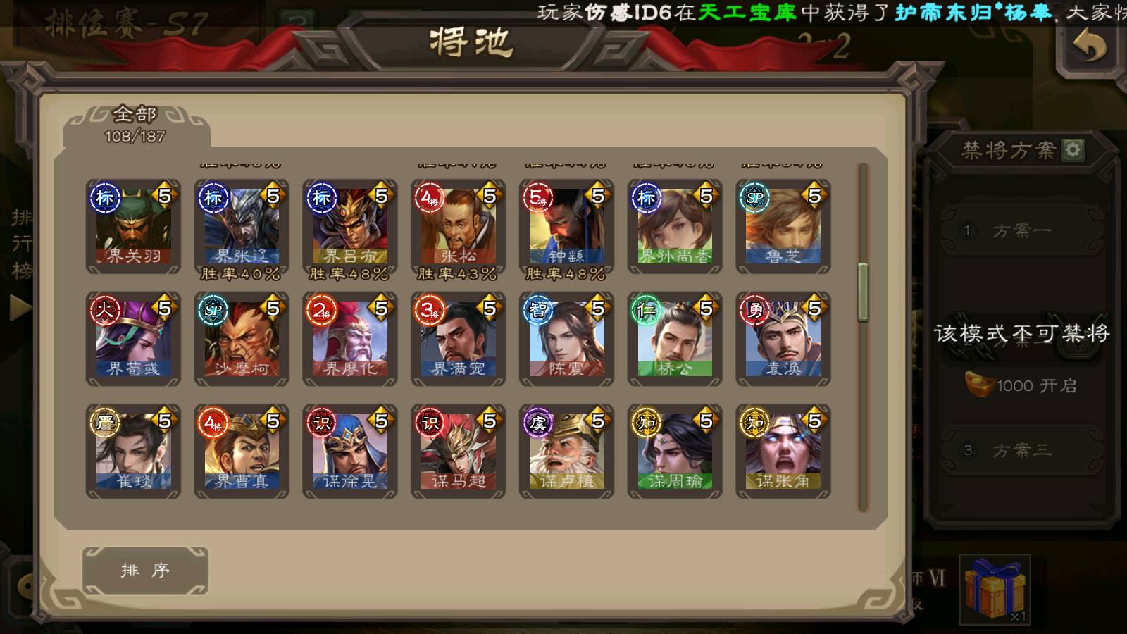 (群雄):南华老仙,界左慈,麴义,许攸,张让,界李儒,谋张角,公孙康,审配,星黄忠,左慈,沮授,兀突骨
