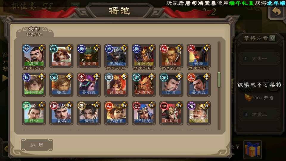 (群雄):刘焉,杜预,界左慈,界沮授,南华老仙,麴义,许攸,十常侍,谋貂蝉,司马昭,张让,界李儒,苏飞,庞德公,卑弥呼,士燮,王允,陶谦,审配,星黄忠,左慈,沮授,兀突骨