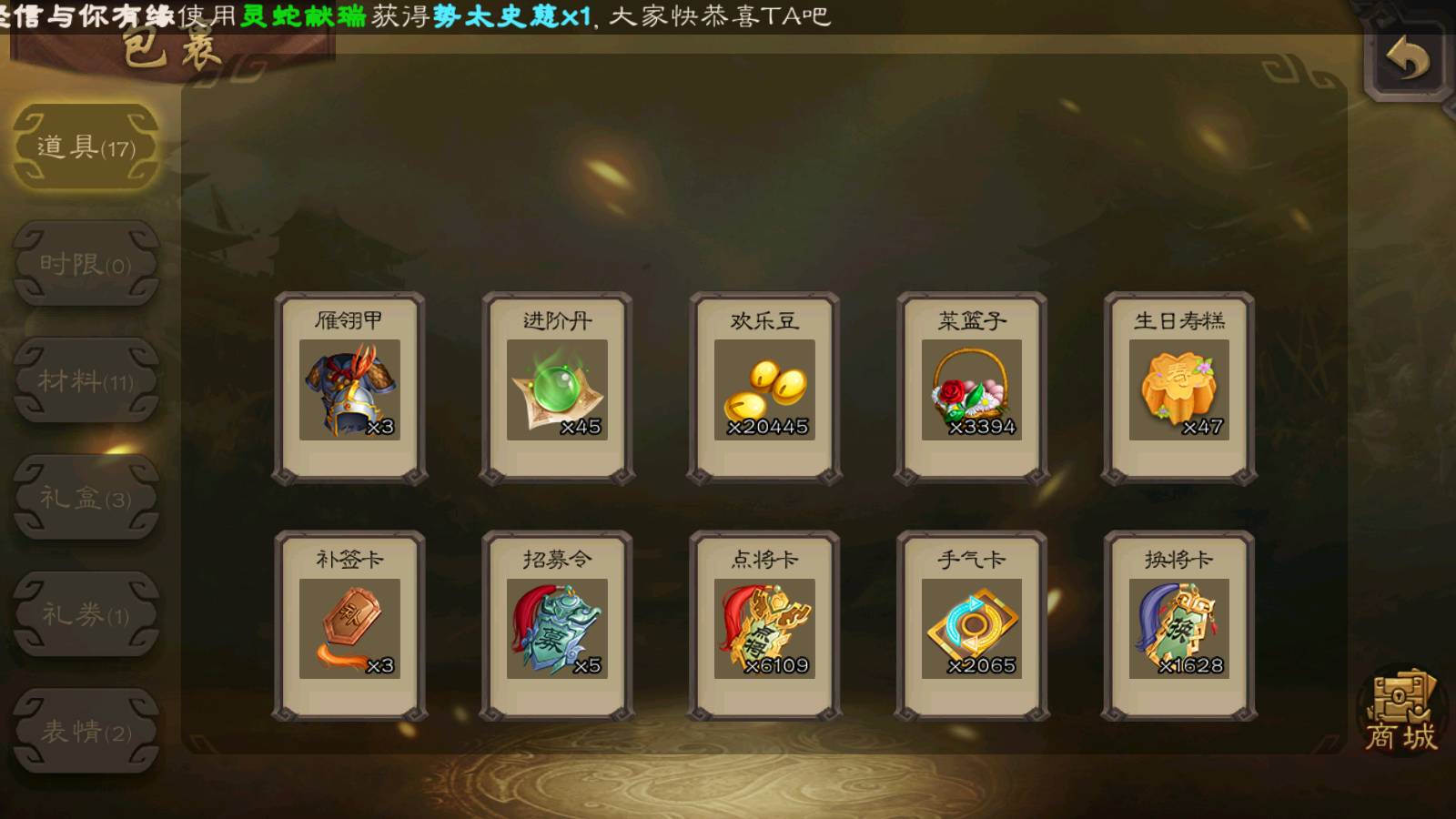(群雄):杨彪,杜预,谋貂蝉,界左慈,张让,界李儒,苏飞,麴义,许攸,司马昭,南华老仙,谋张角,陶谦,公孙康,郑玄,星黄忠,星董卓,左慈,沮授,兀突骨