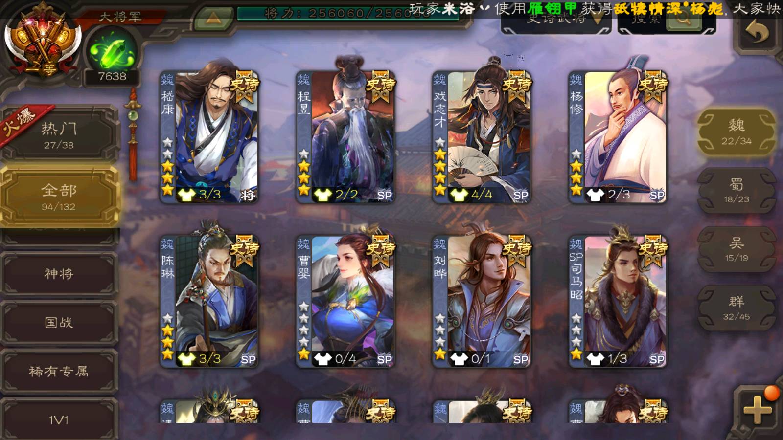 (魏国):曹婴,马钧,文鸯,戏志才,界钟会,曹髦,SP司马昭,谋曹仁,清河公主,界于禁,郝昭,王粲,界曹真,王凌,星周不疑,程昱,曹纯,杨修,陈琳,嵇康,刘晔