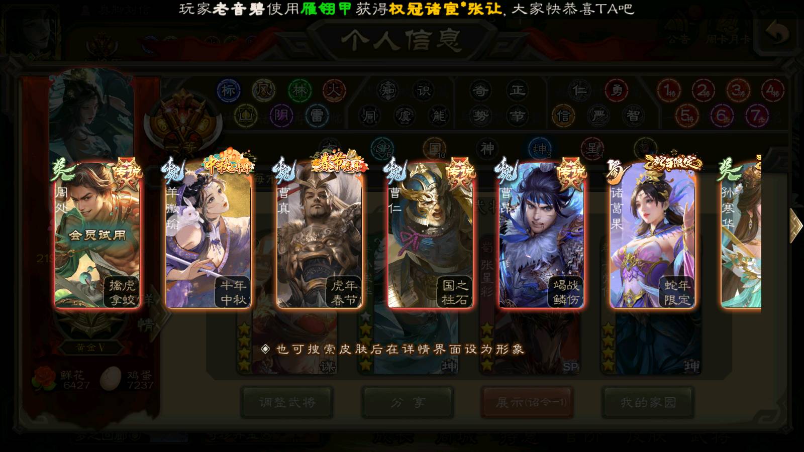 (群雄):刘焉,杨彪,杜预,祢衡,界左慈,南华老仙,麴义,许攸,十常侍,星董卓,谋貂蝉,司马昭,张让,界李儒,苏飞,庞德公,星甘宁,谋公孙瓒,张琪瑛,裴秀,卑弥呼,士燮,谋张角,王允,公孙康,郑玄,陶谦,审配,星黄忠,左慈,沮授,兀突骨