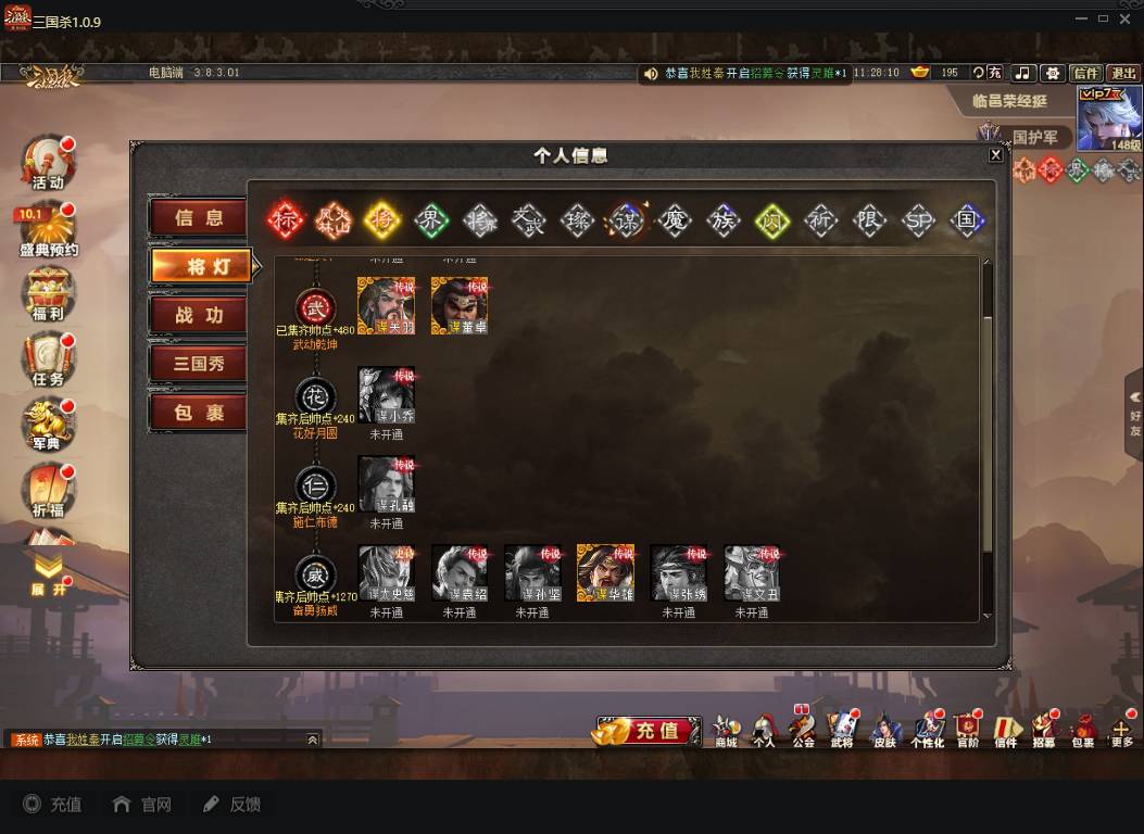 商品编号A072 V7等级+卧龙凤雏(限动),费祎,蒋琬,+张华+族钟琰,族钟会+谋关羽,谋董卓(传动),谋华雄+魔吕布,总武将313,五阶31,皮肤918,动18,花好收藏册达成,包裹:玉玺42,灵宝480,官阶:国护军