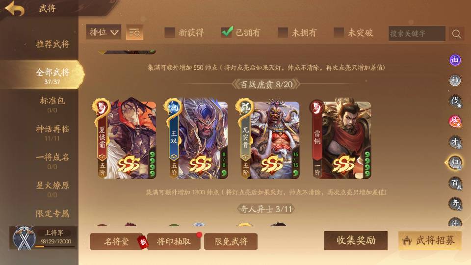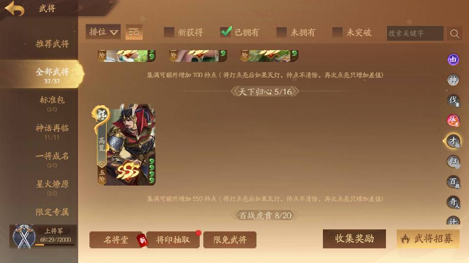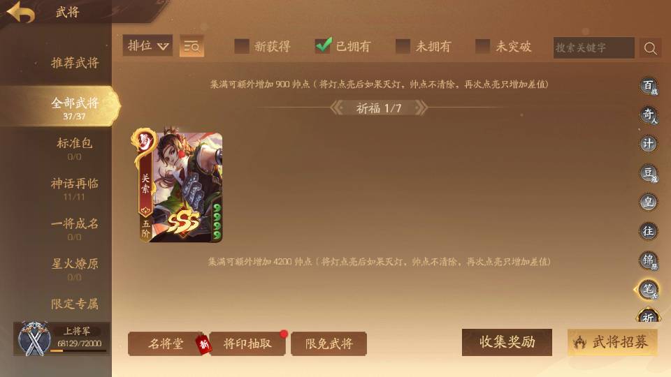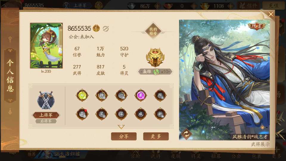 商品编号Dsa175 编号Dsa175 武将:王荣,关索,程昱,来莺儿,蒲元,葛玄,张嫙,骆统 将灵:SSA关索 包裹:祈福灯2,V6会员,总武将277,总皮肤1143,总国战98,帅点6.8w