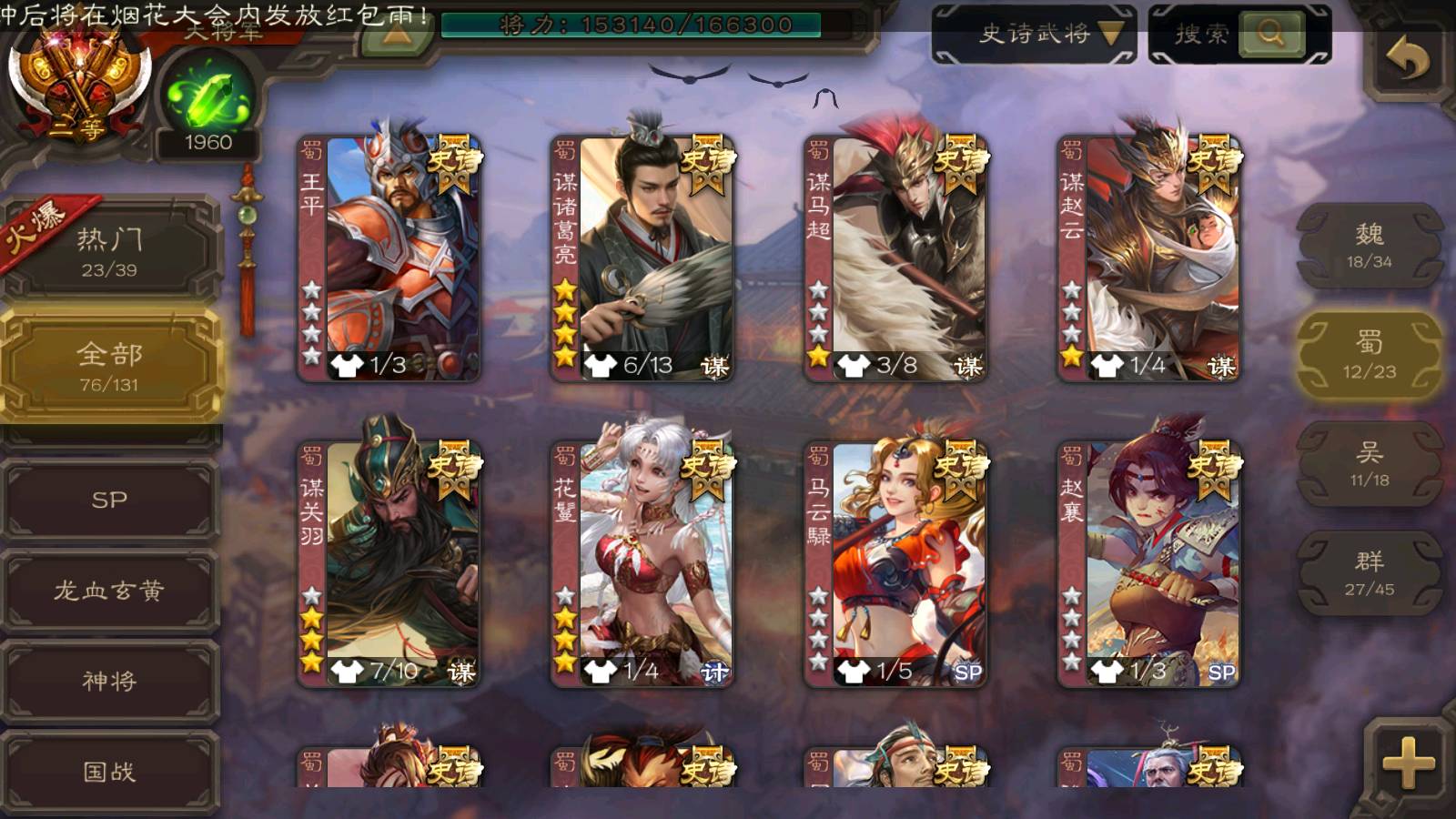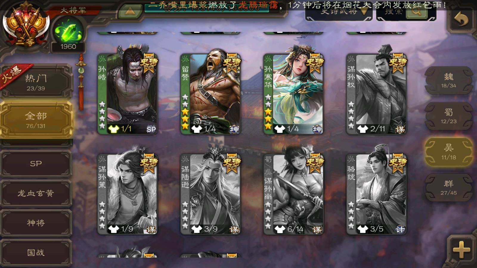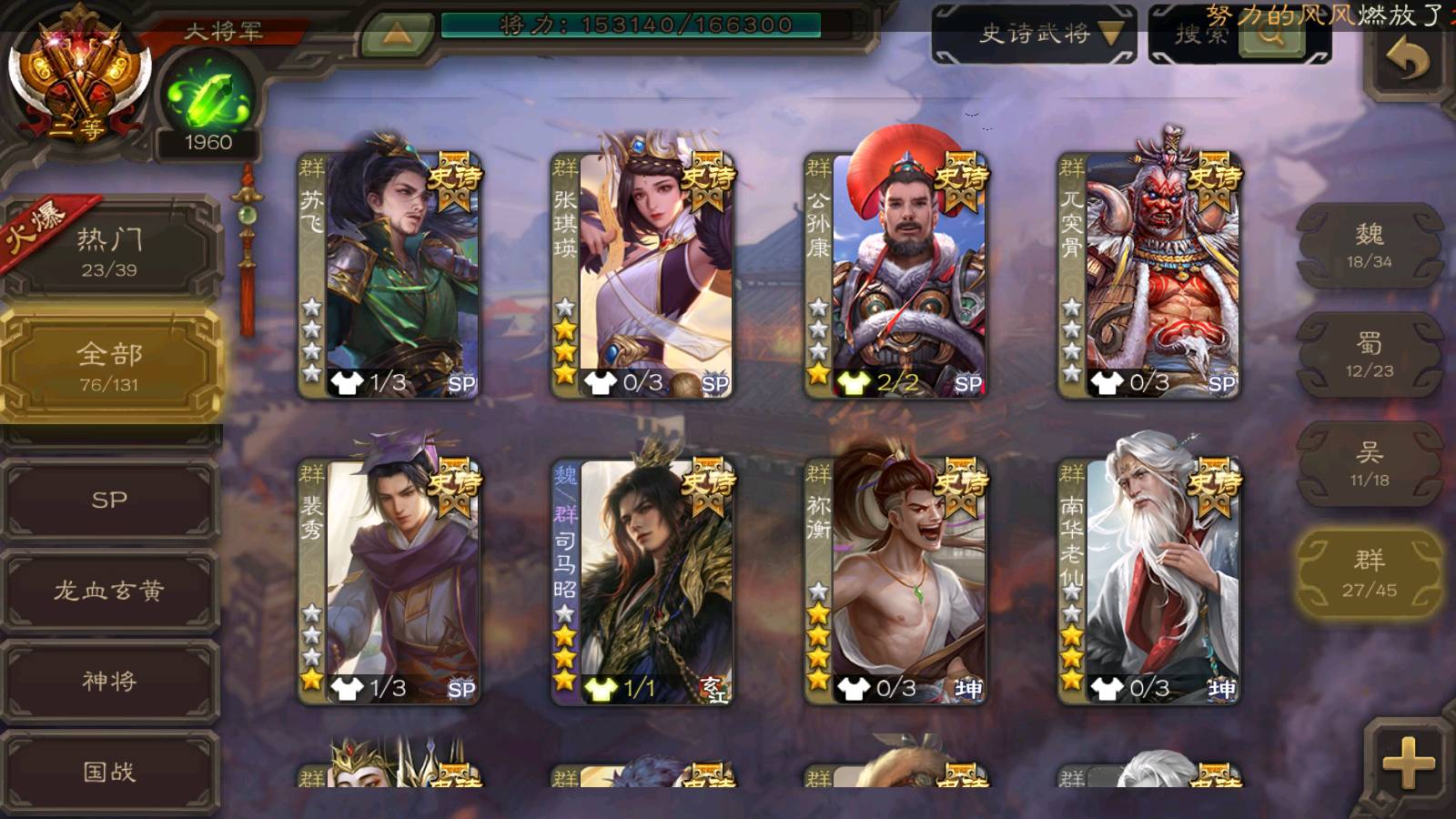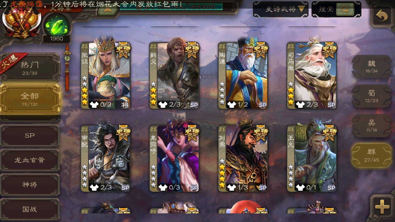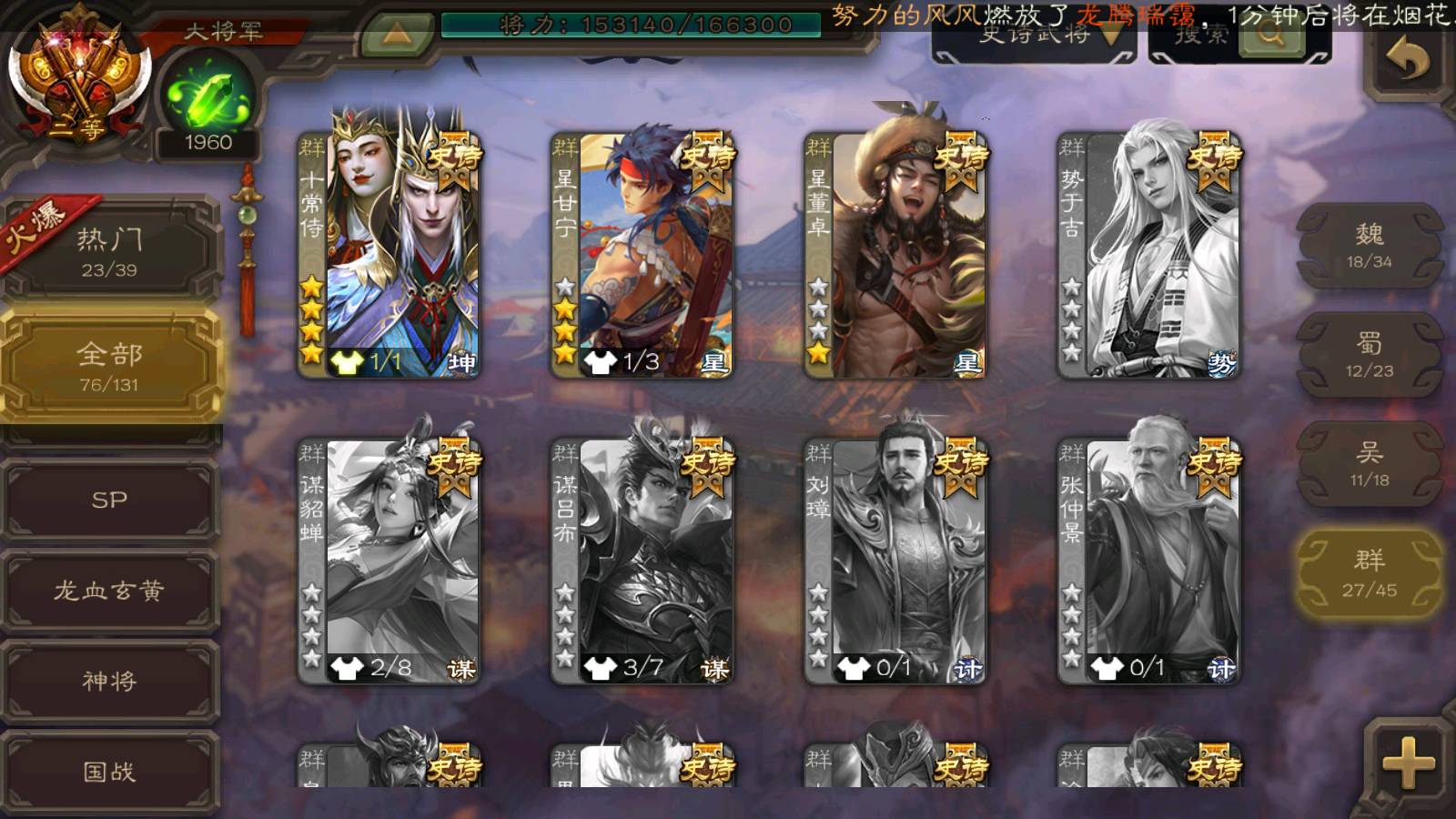 (群雄):刘焉,杜预,祢衡,界沮授,南华老仙,麴义,许攸,十常侍,星董卓,司马昭,张让,界李儒,苏飞,星甘宁,谋公孙瓒,张琪瑛,裴秀,卑弥呼,谋张角,王允,公孙康,陶谦,审配,司马徽,左慈,沮授,兀突骨