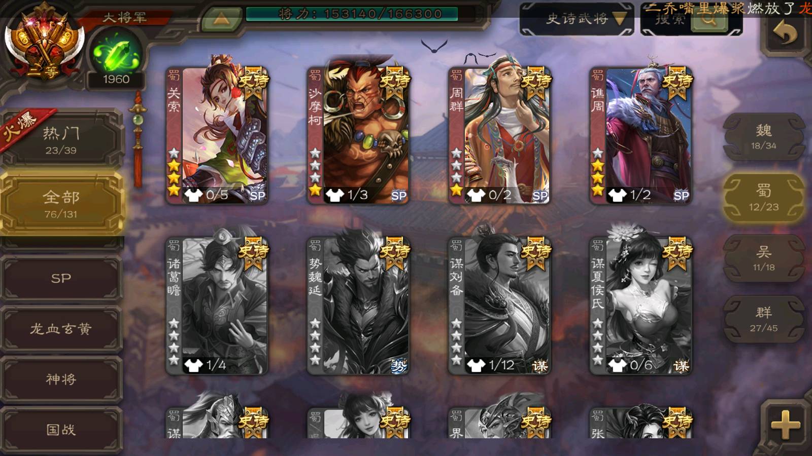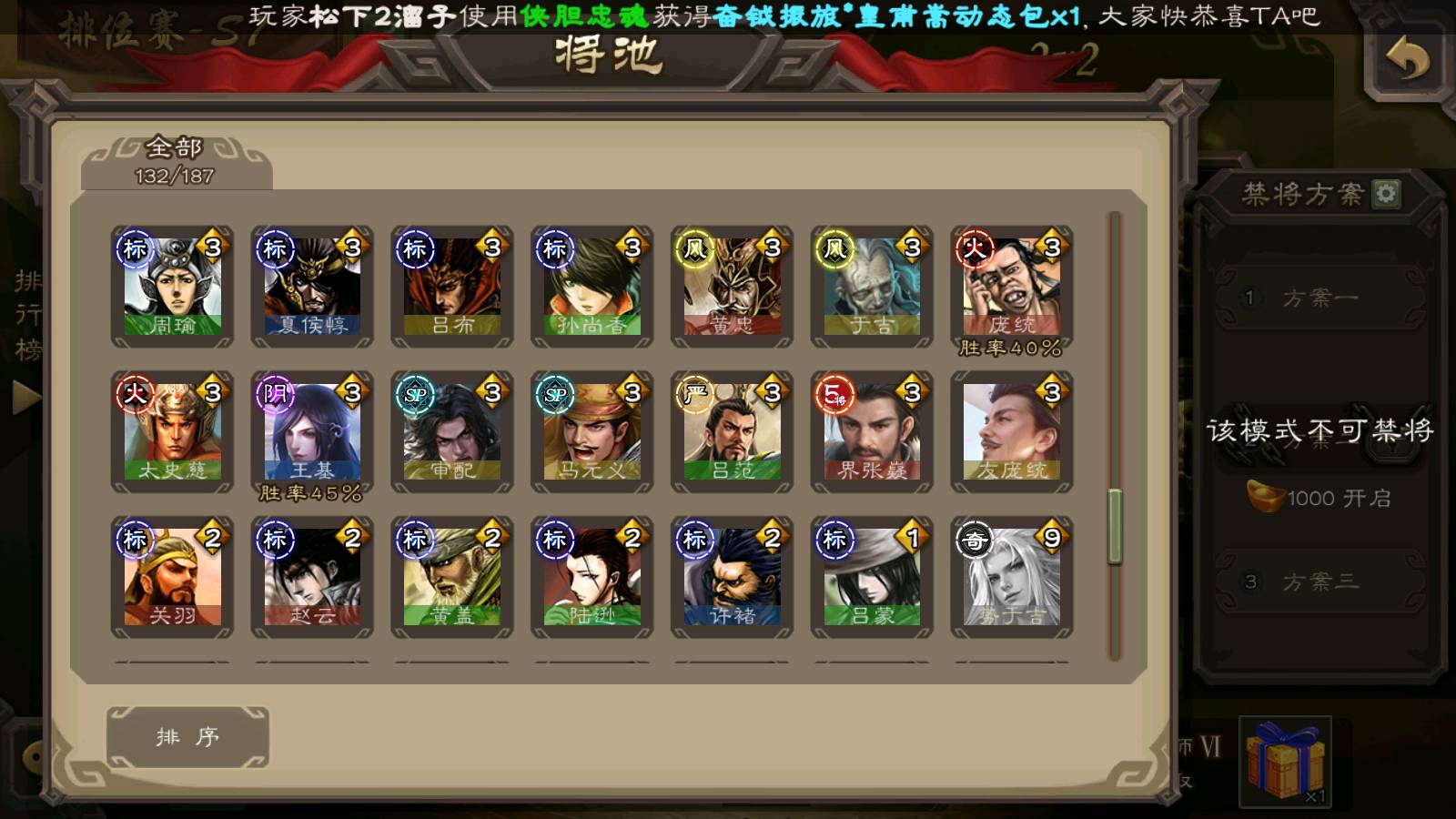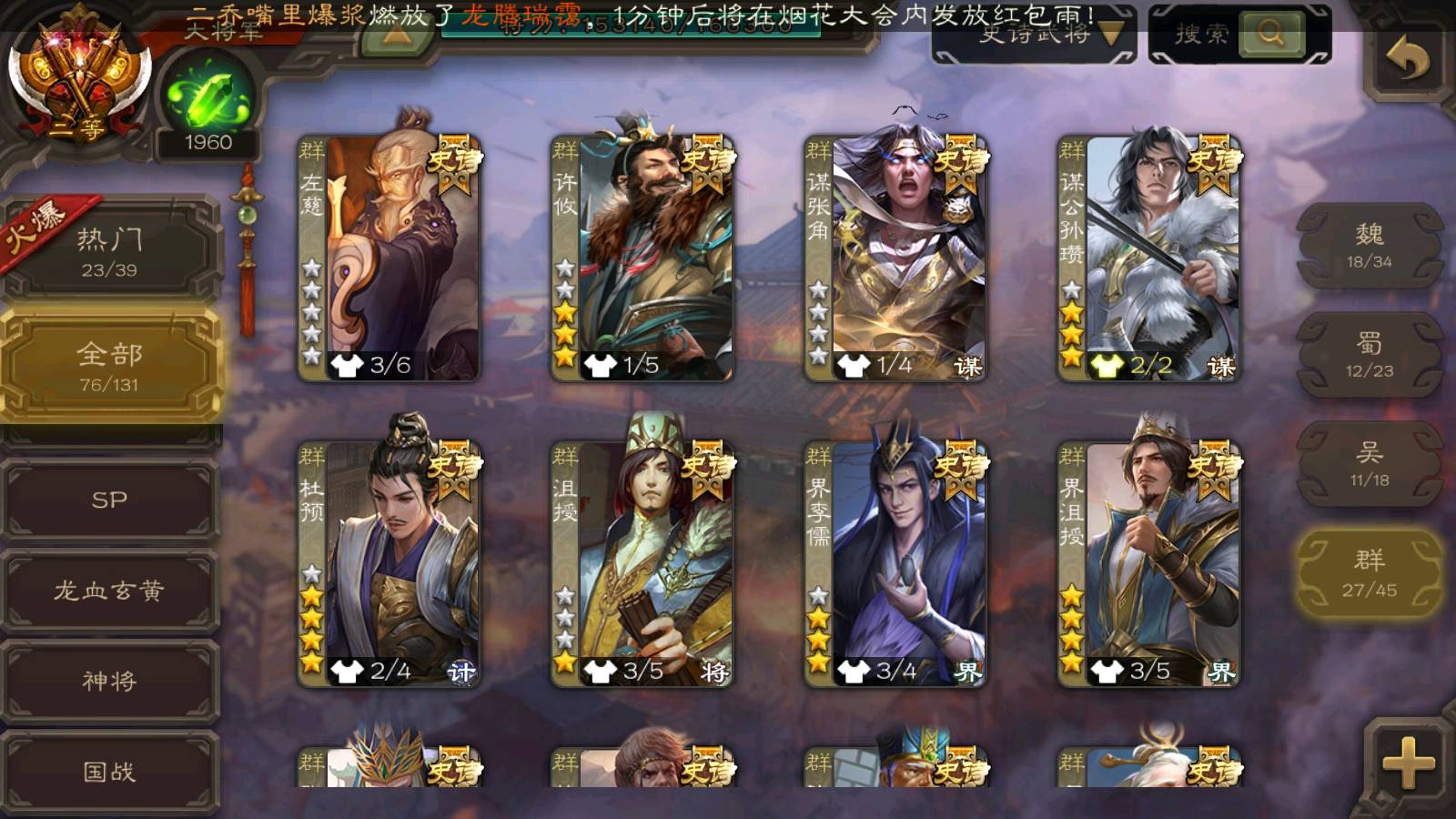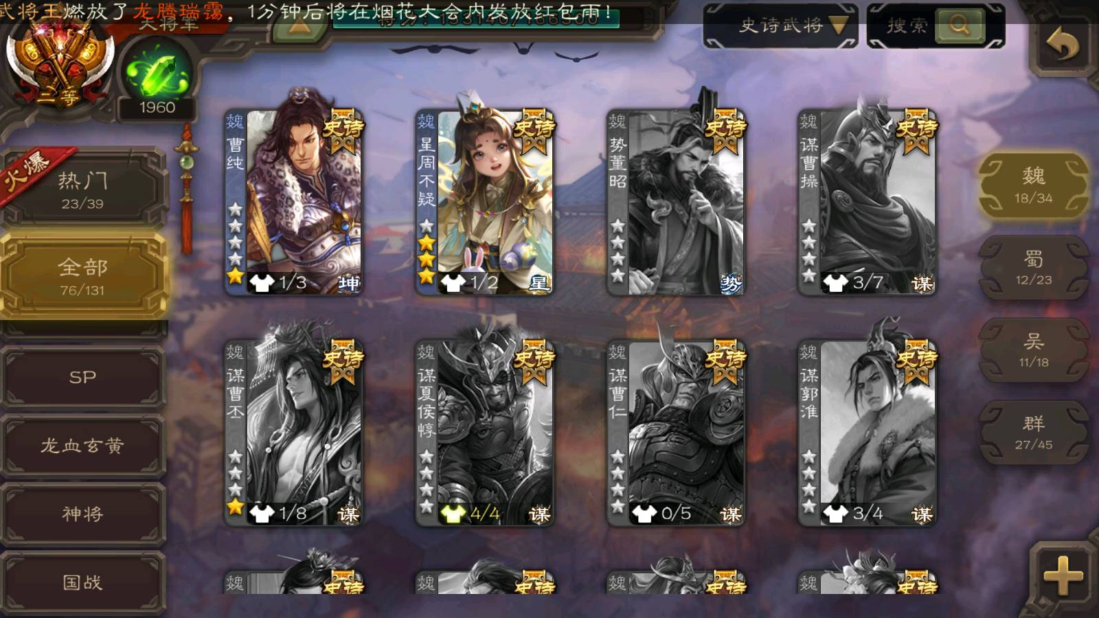 (群雄):刘焉,杜预,祢衡,界沮授,南华老仙,麴义,许攸,十常侍,星董卓,司马昭,张让,界李儒,苏飞,星甘宁,谋公孙瓒,张琪瑛,裴秀,卑弥呼,谋张角,王允,公孙康,陶谦,审配,司马徽,左慈,沮授,兀突骨