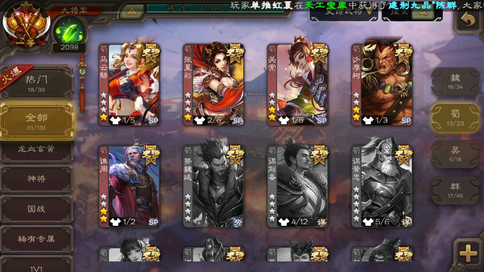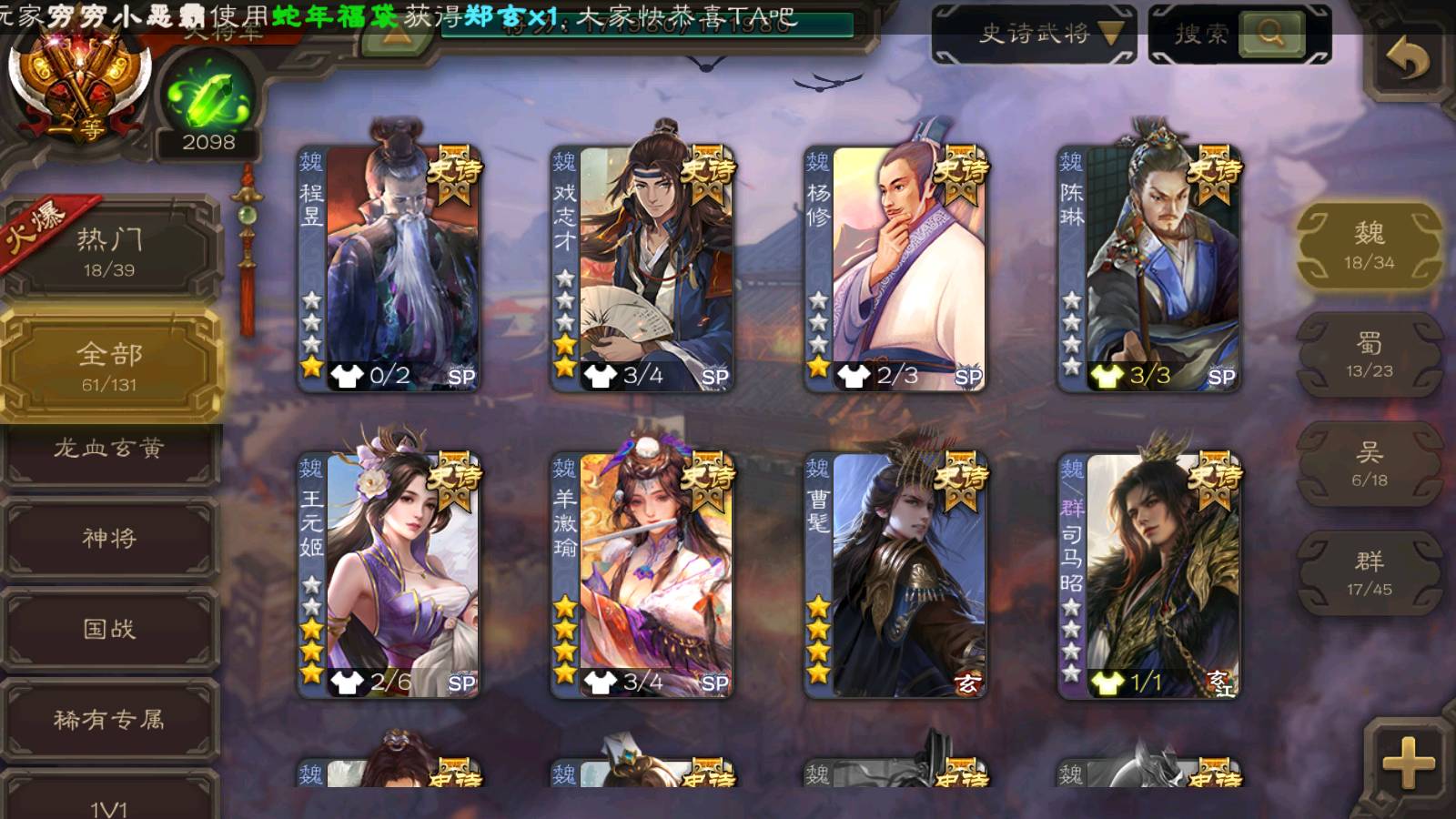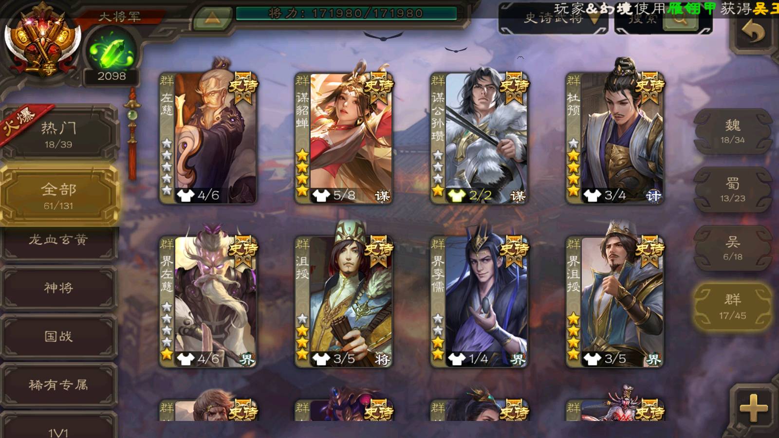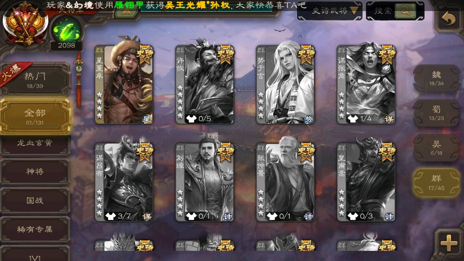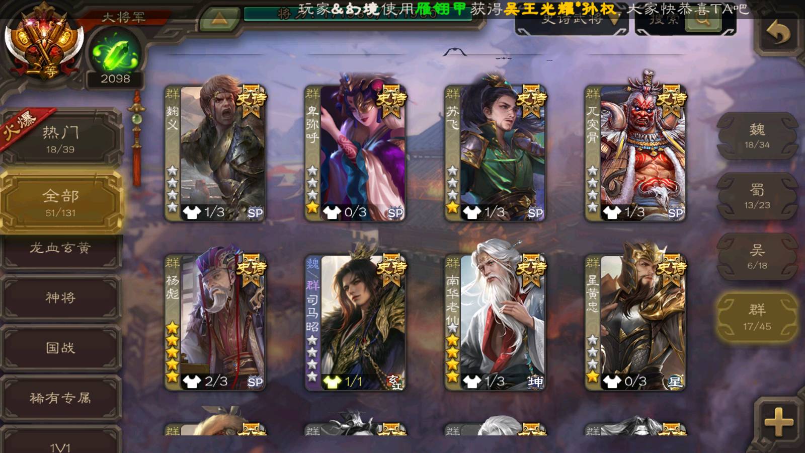 (群雄):杨彪,杜预,界左慈,界沮授,南华老仙,谋貂蝉,麴义,司马昭,谋公孙瓒,界李儒,苏飞,卑弥呼,星董卓,星黄忠,左慈,沮授,兀突骨