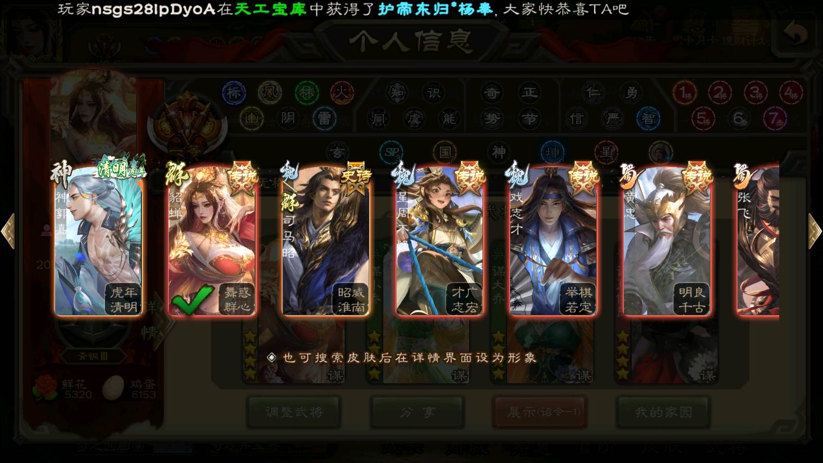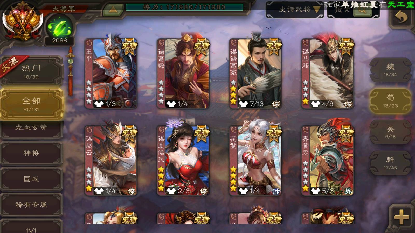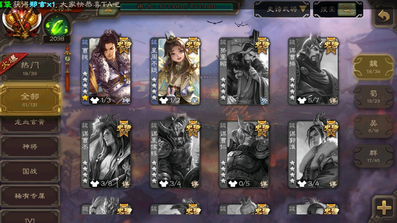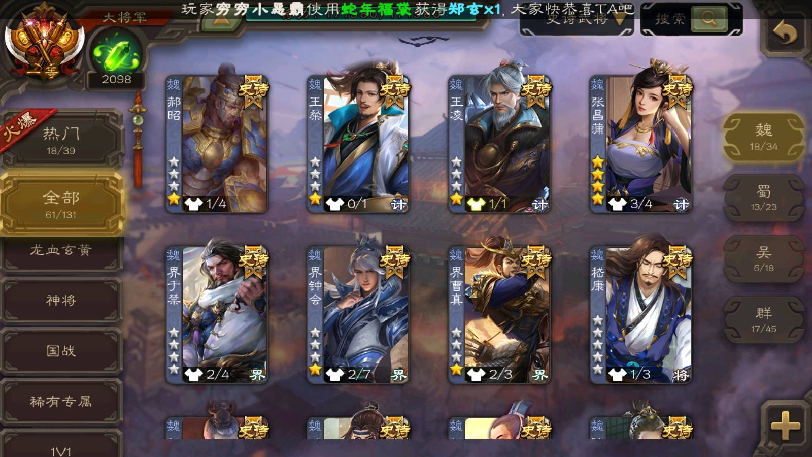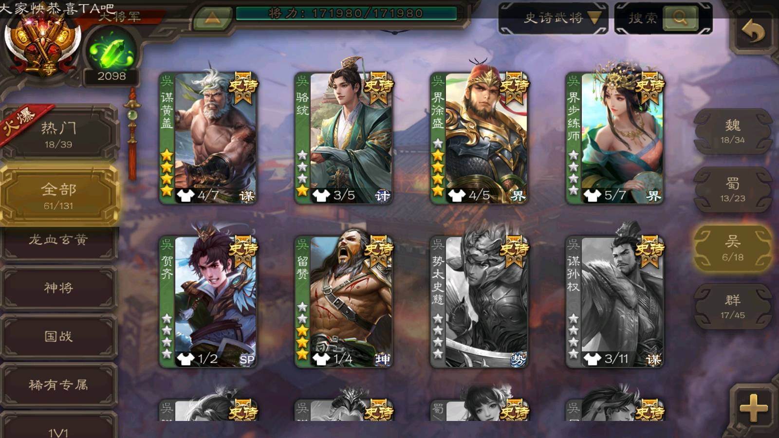 (群雄):杨彪,杜预,界左慈,界沮授,南华老仙,谋貂蝉,麴义,司马昭,谋公孙瓒,界李儒,苏飞,卑弥呼,星董卓,星黄忠,左慈,沮授,兀突骨