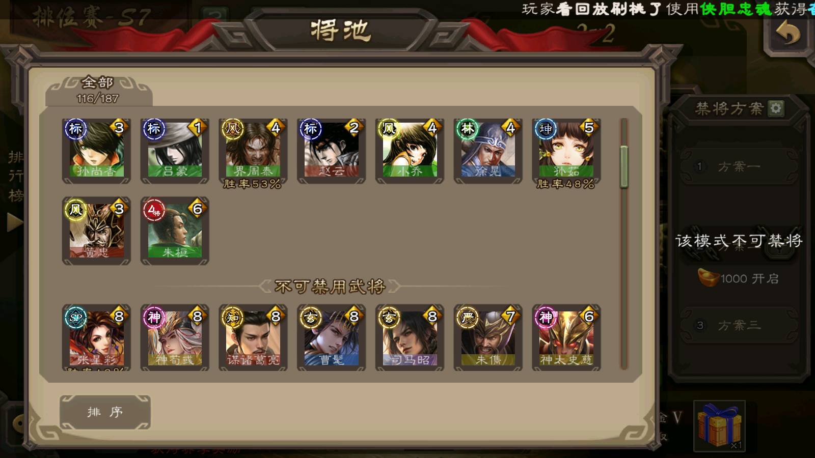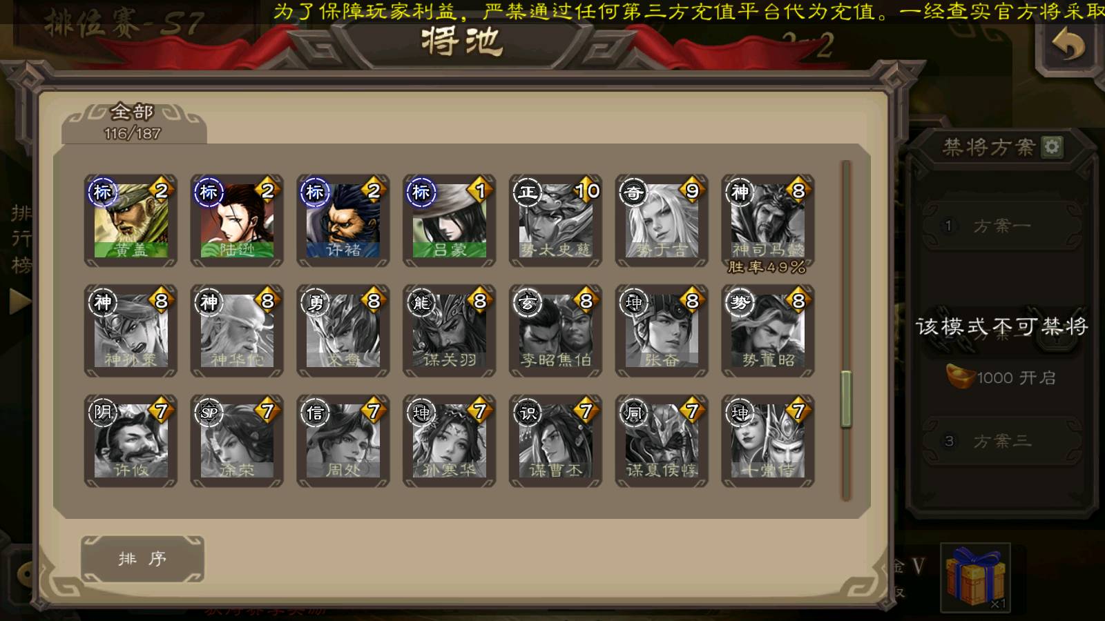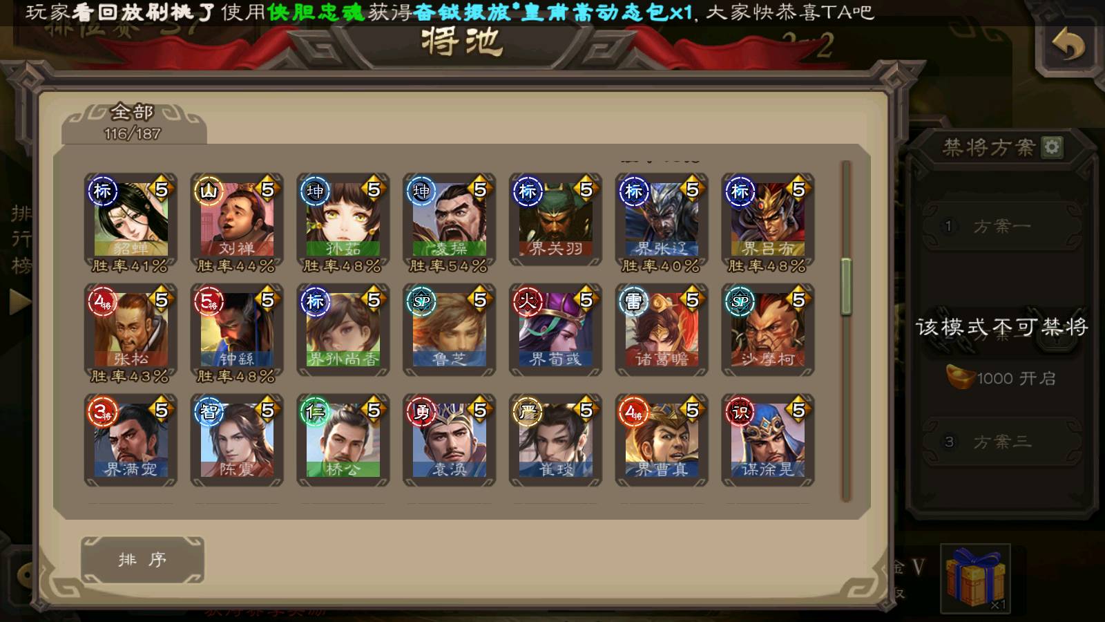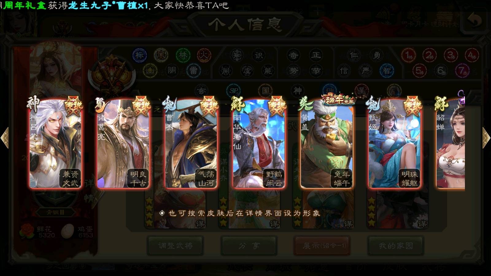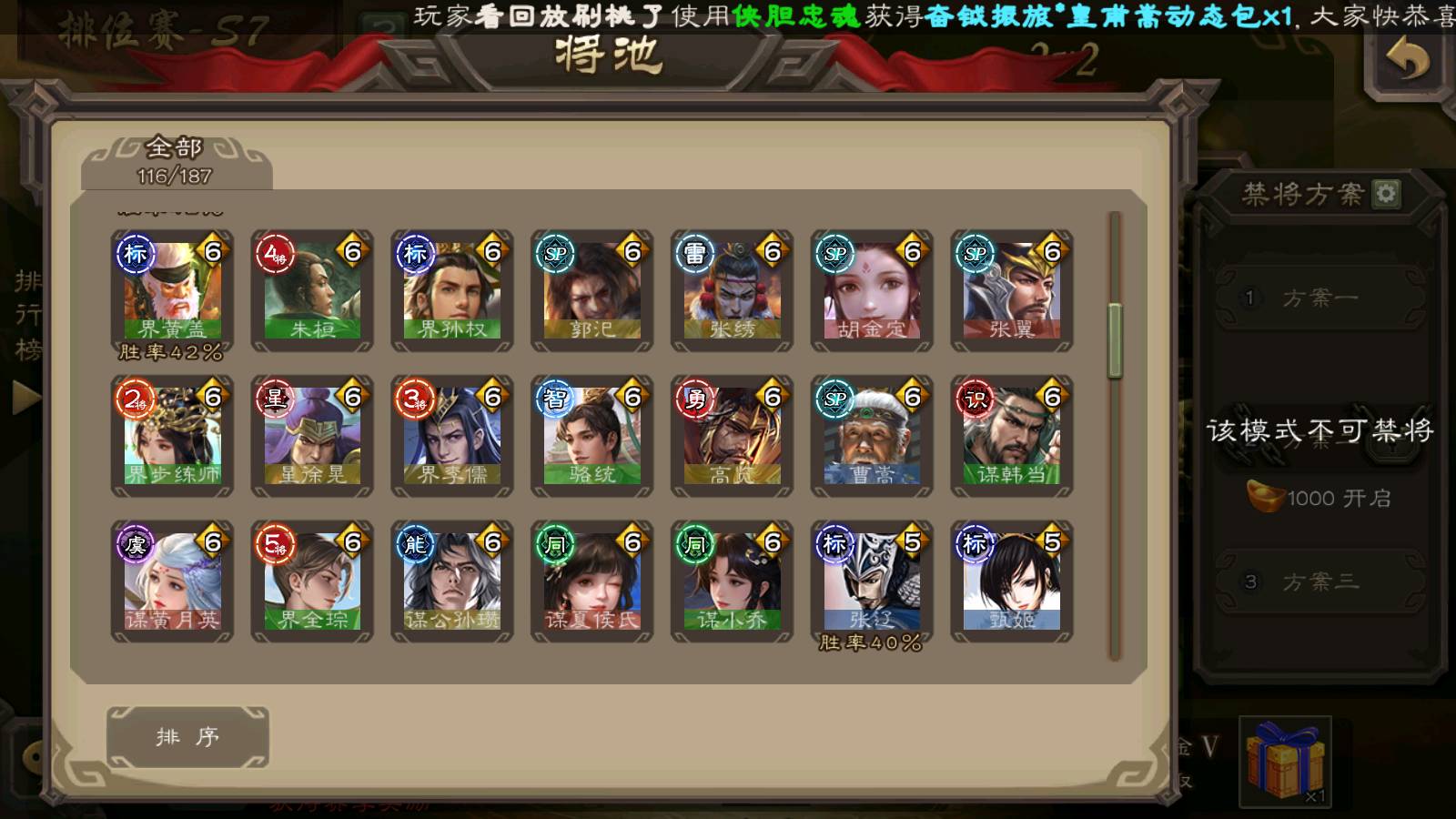 (群雄):杨彪,杜预,界左慈,界沮授,南华老仙,谋貂蝉,麴义,司马昭,谋公孙瓒,界李儒,苏飞,卑弥呼,星董卓,星黄忠,左慈,沮授,兀突骨