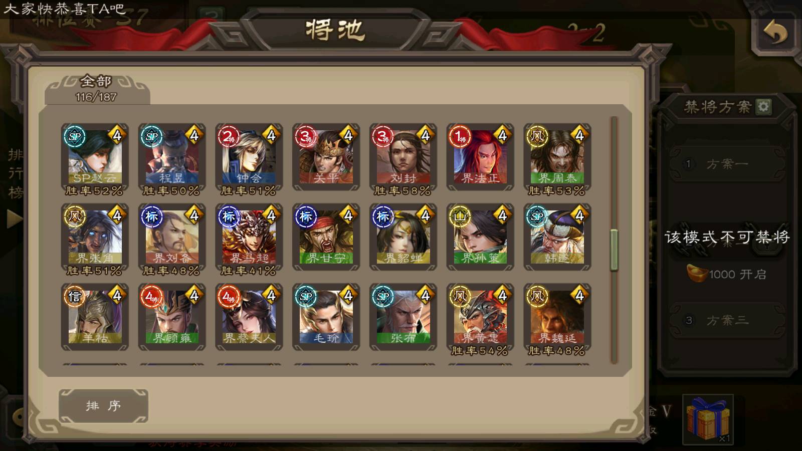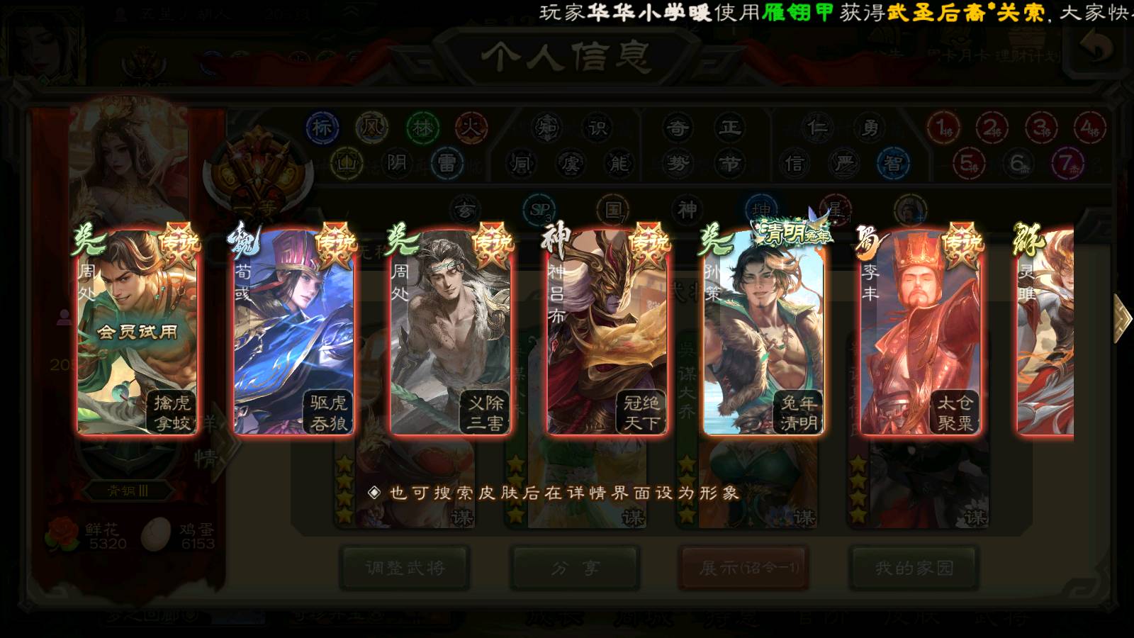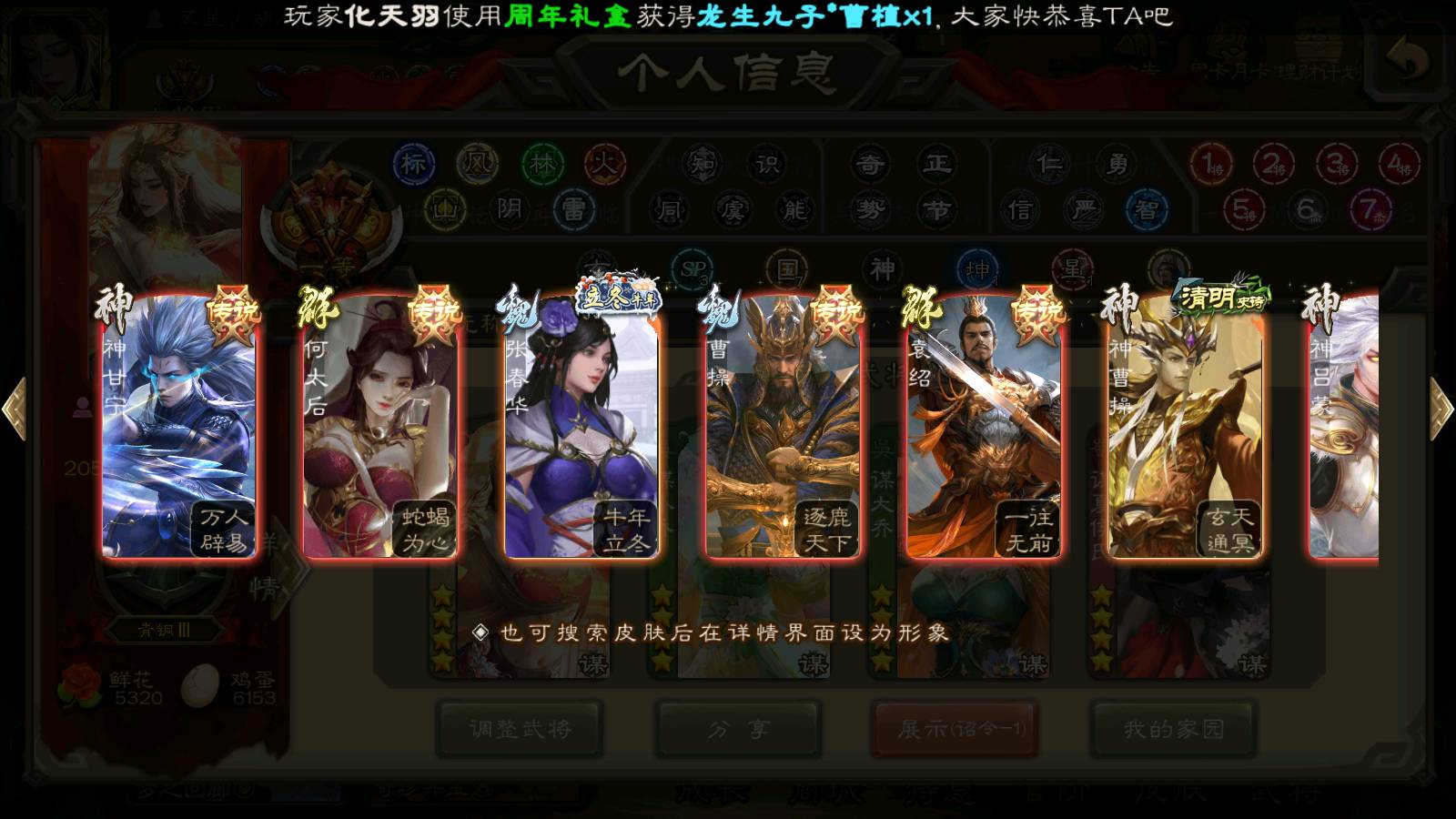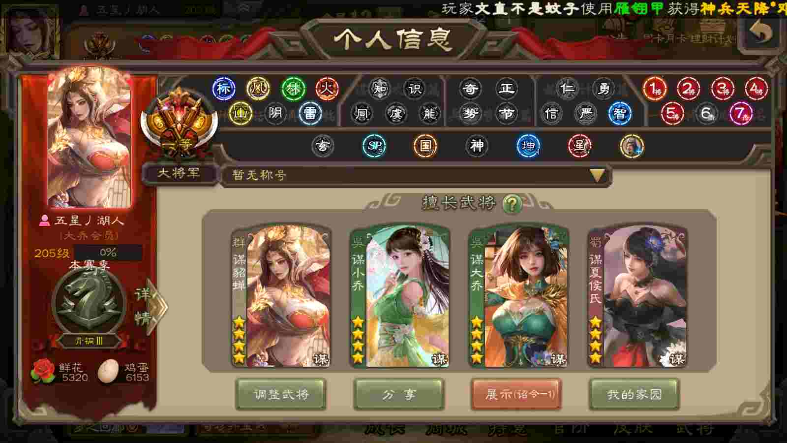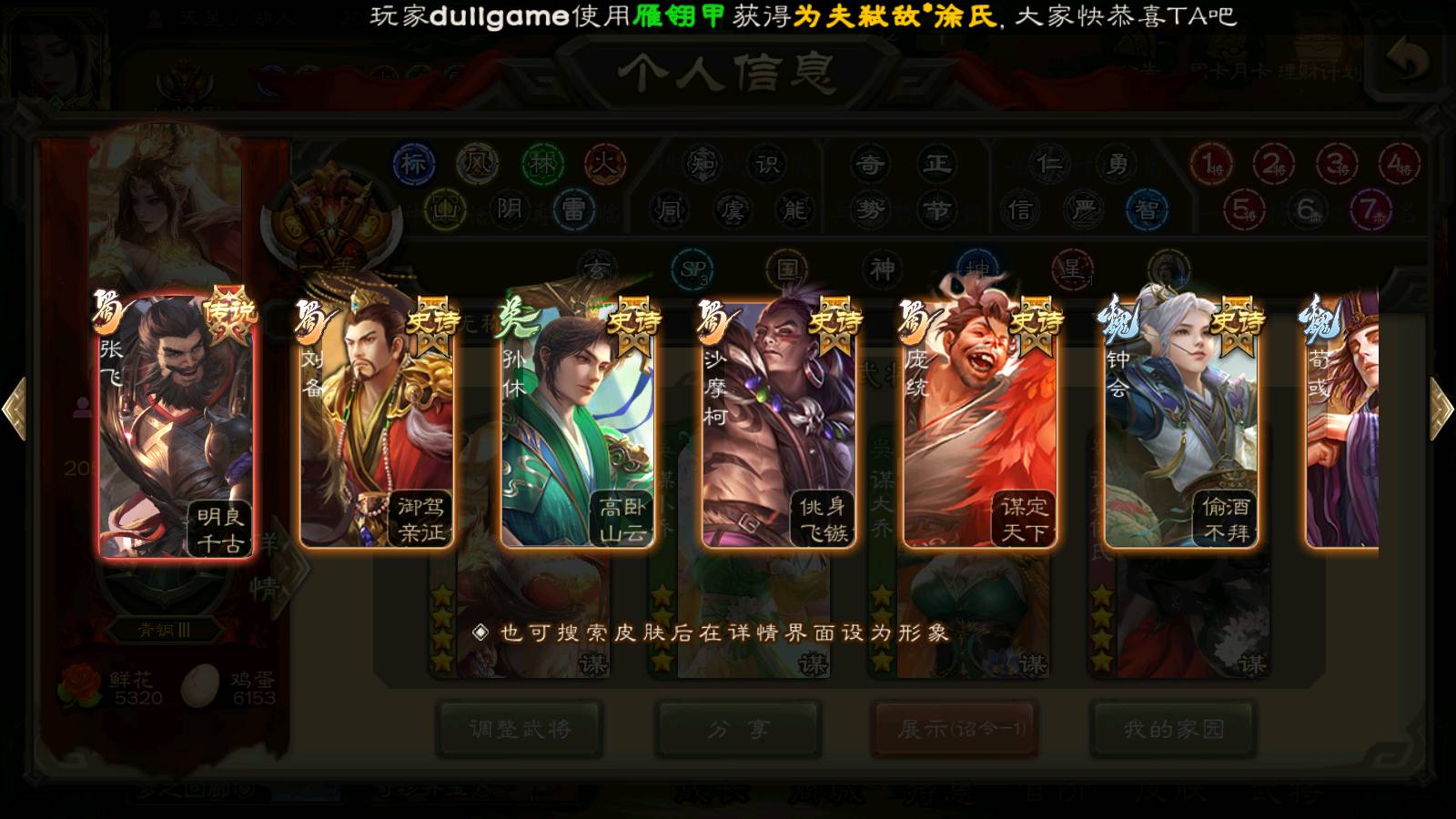 (群雄):杨彪,杜预,界左慈,界沮授,南华老仙,谋貂蝉,麴义,司马昭,谋公孙瓒,界李儒,苏飞,卑弥呼,星董卓,星黄忠,左慈,沮授,兀突骨