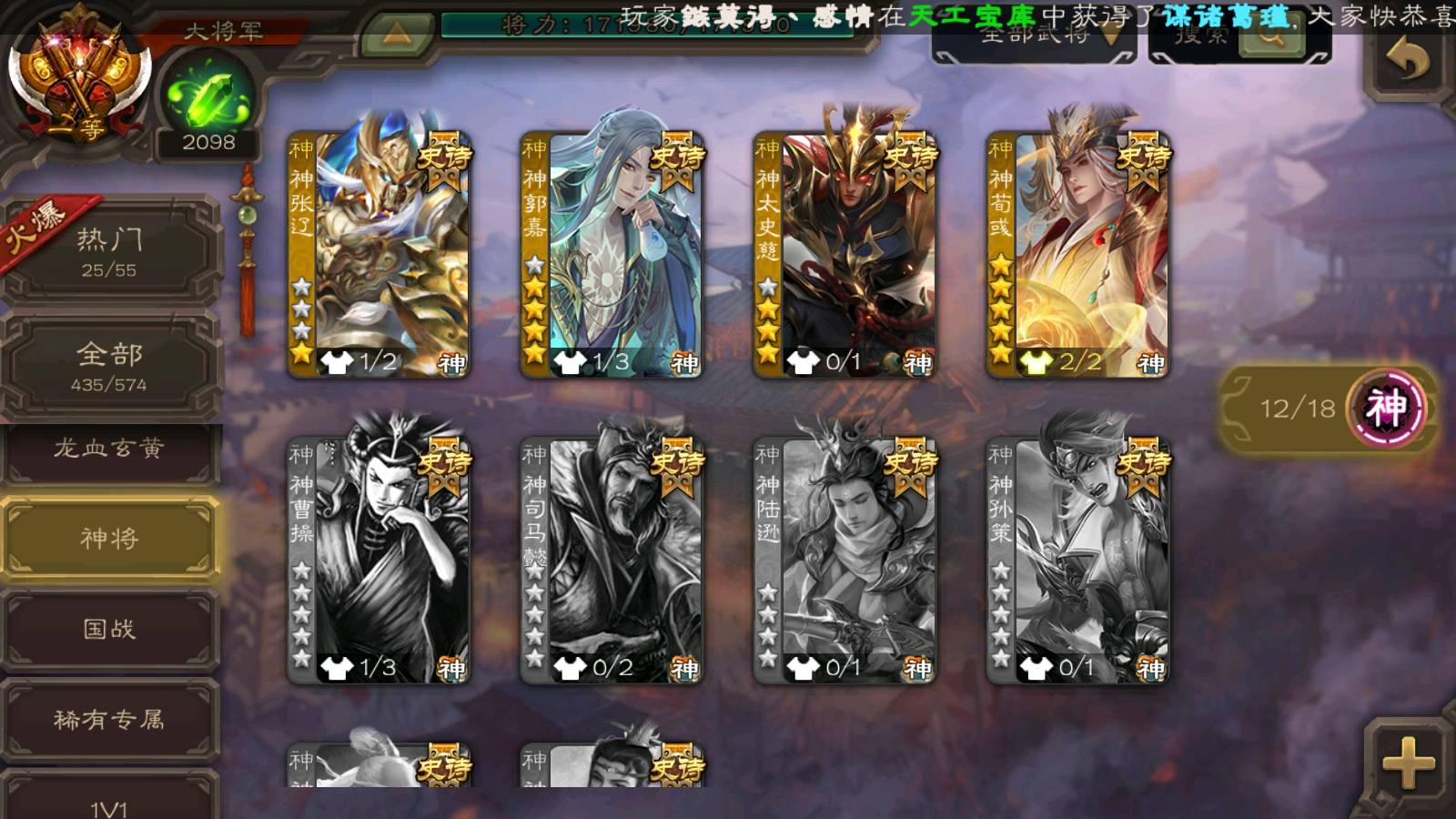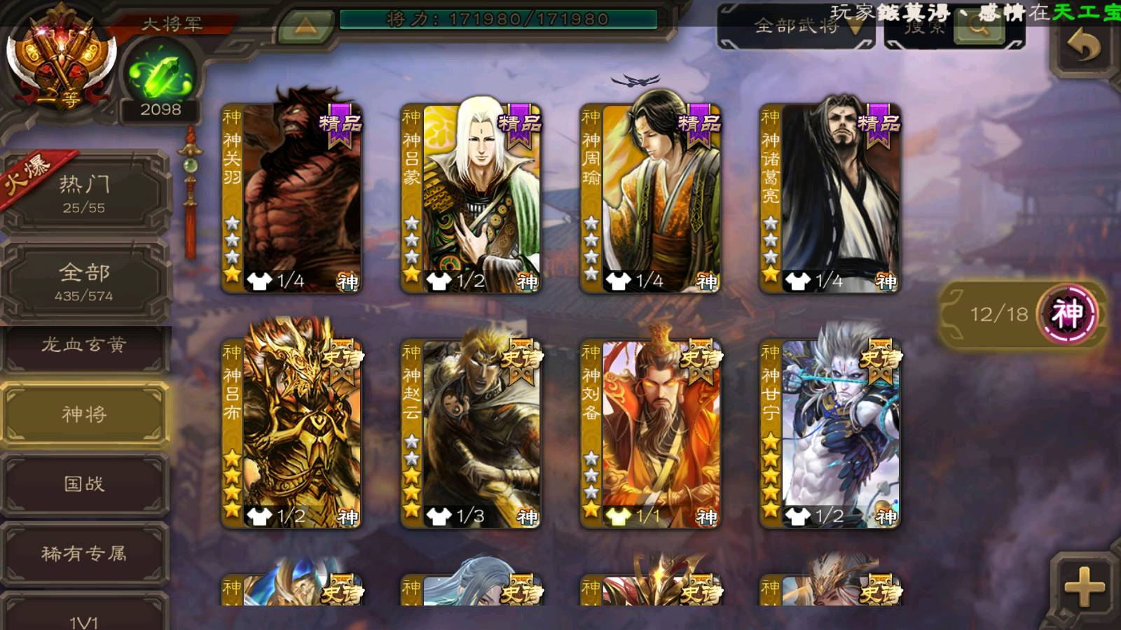 (神将):神荀彧,神郭嘉,神甘宁,神太史慈,神赵云,神吕布,神刘备,神张辽