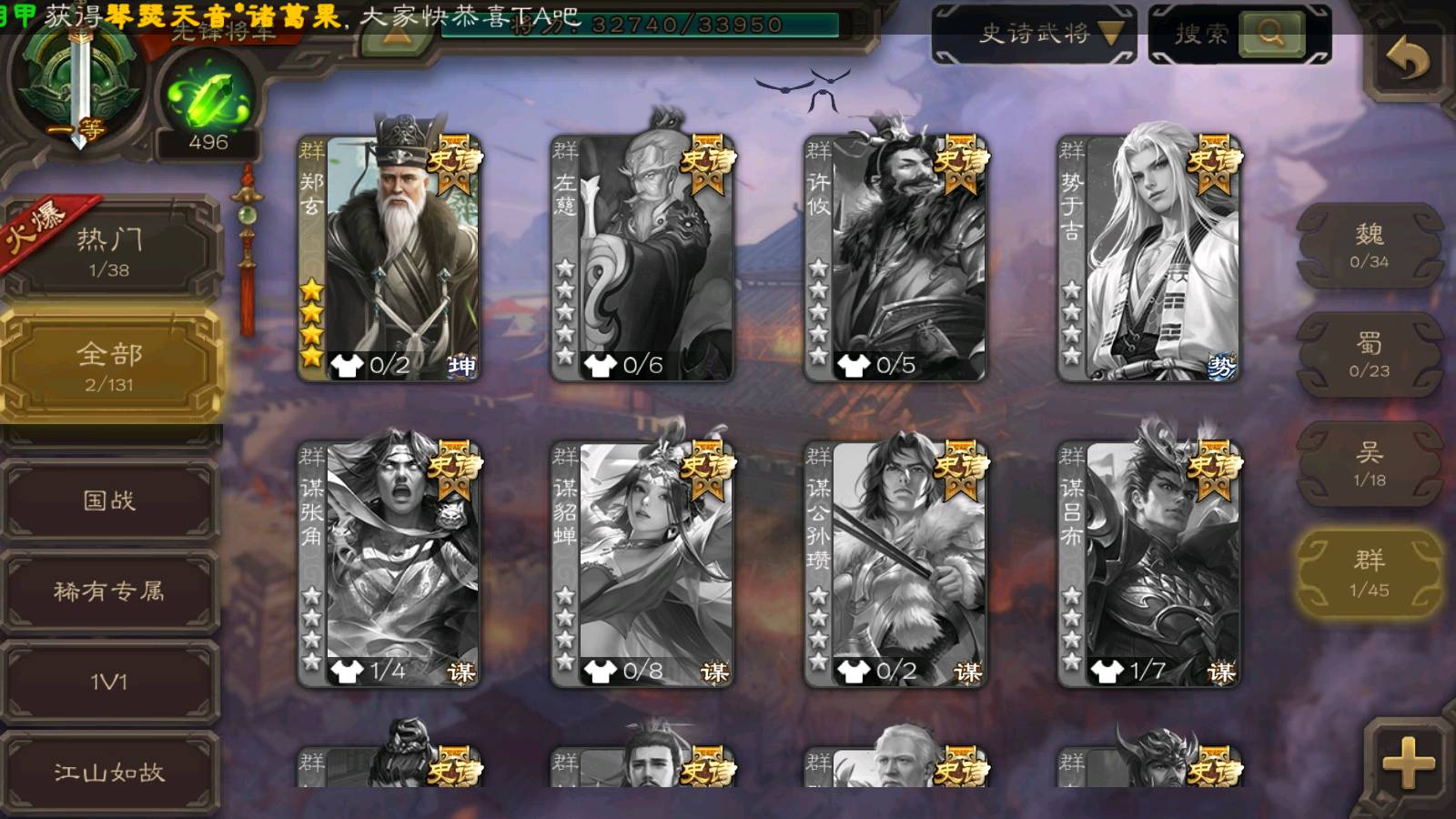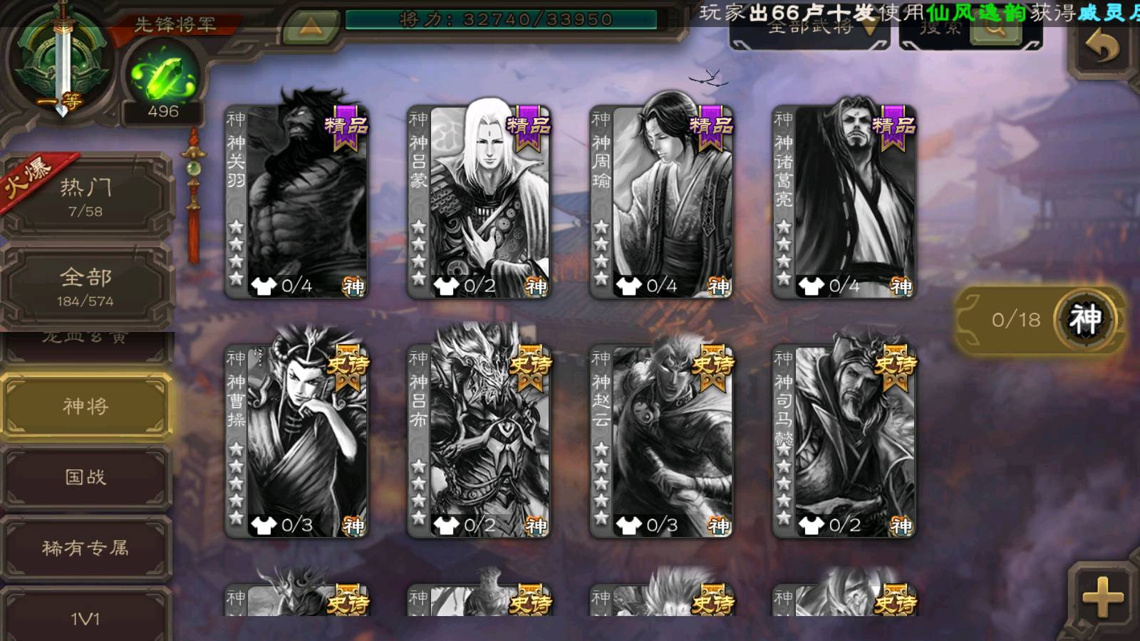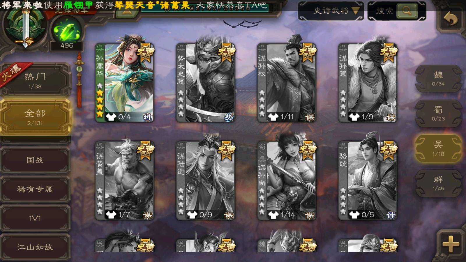 商品编号22024 全部皮肤135,动态皮肤1,全部武将184,排位武将65,国战武将67,史诗武将2,雁翎3.2w