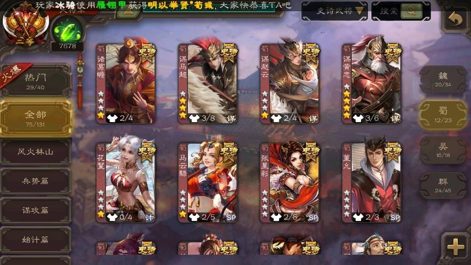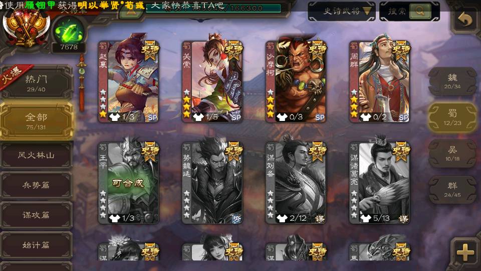 (蜀国):谋黄忠,诸葛瞻,周群,沙摩柯,花鬘,谋赵云,谋马超,关索,张星彩,马云騄,董允,赵襄