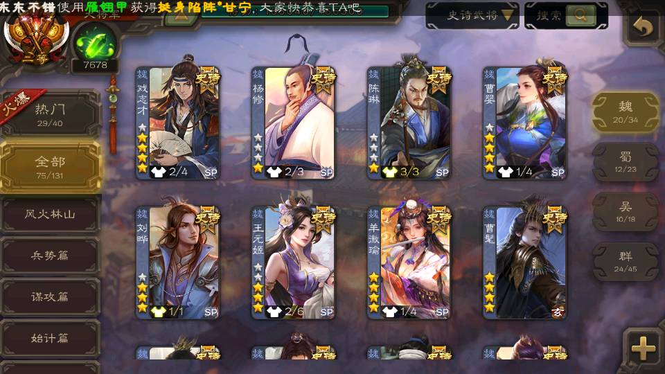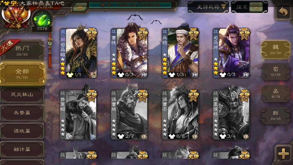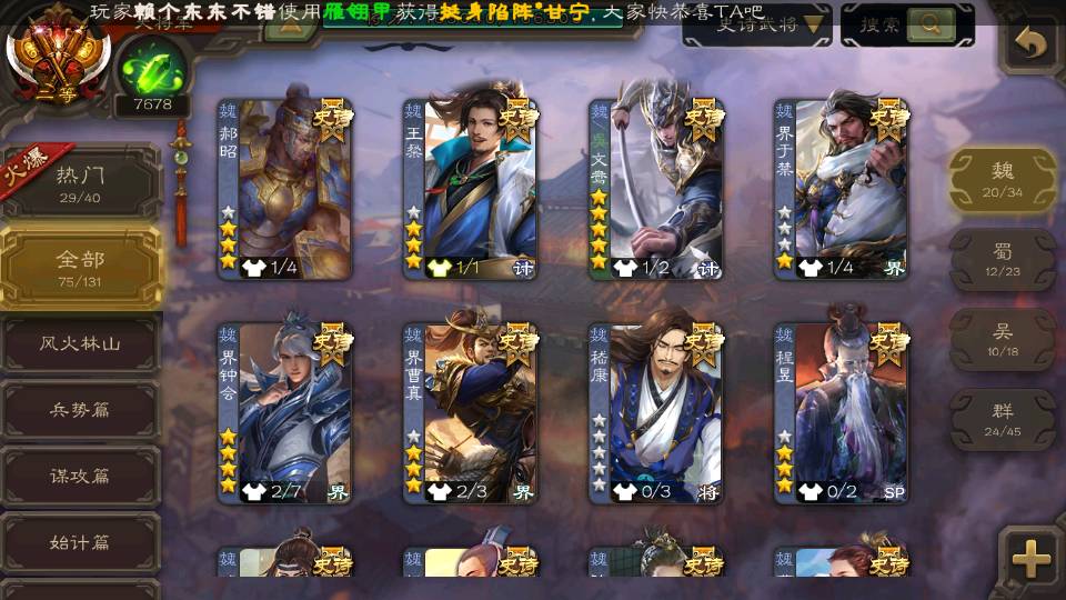 (魏国):曹婴,马钧,王元姬,羊徽瑜,文鸯,戏志才,界钟会,曹髦,司马师,界于禁,郝昭,王粲,界曹真,程昱,曹纯,杨修,陈琳,嵇康,刘晔
