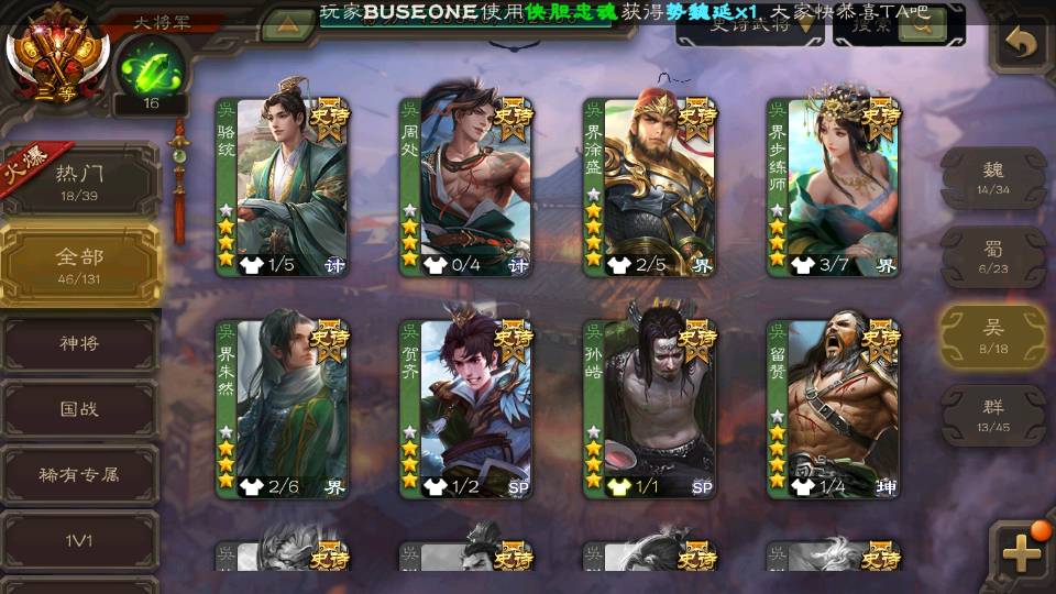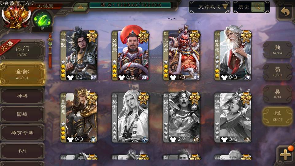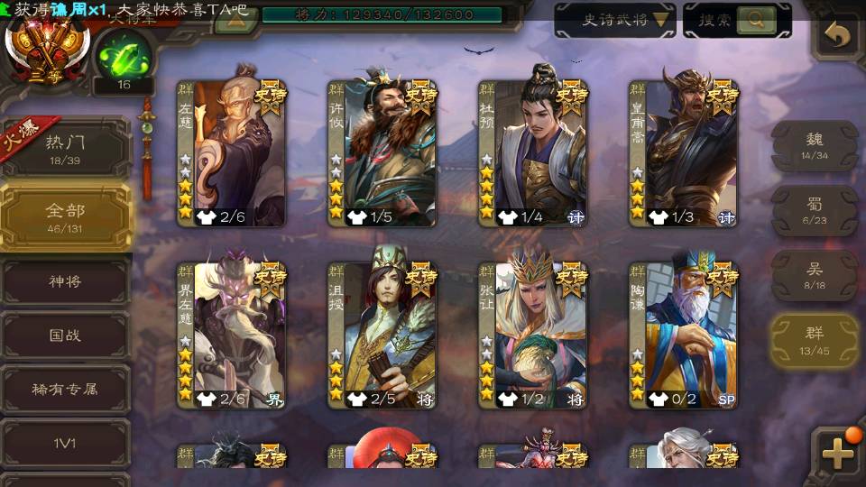 (群雄):杜预,界左慈,皇甫嵩,南华老仙,张让,许攸,公孙康,陶谦,星黄忠,审配,左慈,沮授,兀突骨