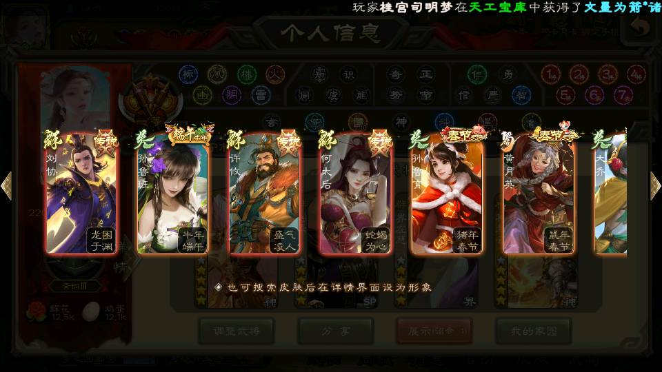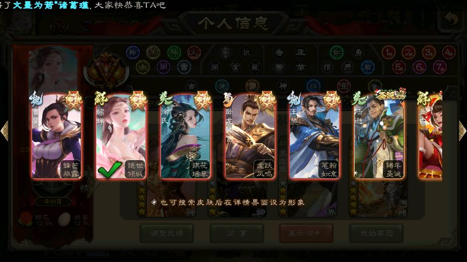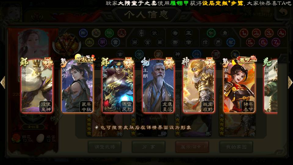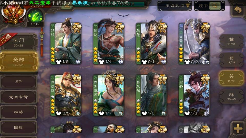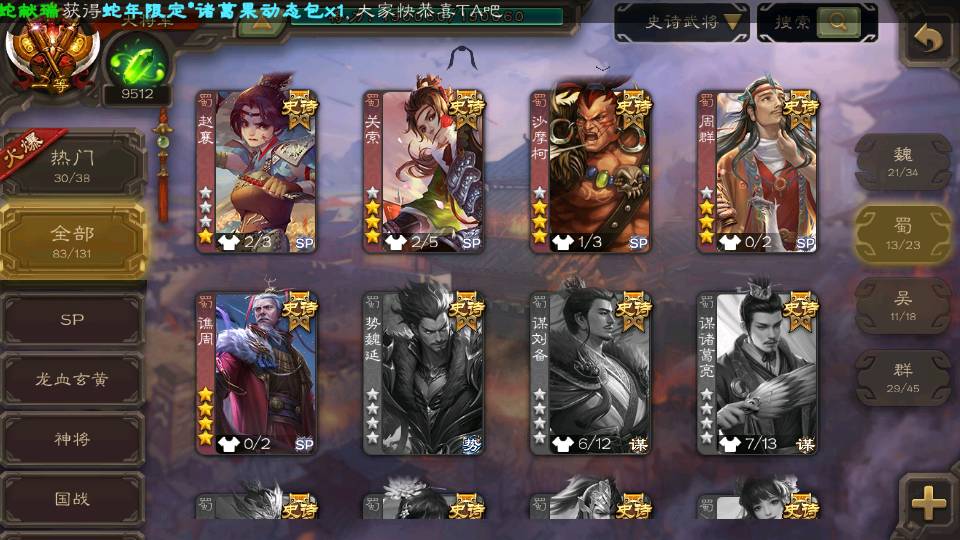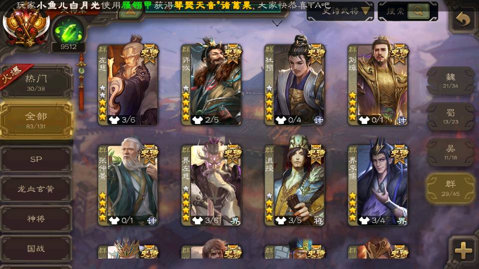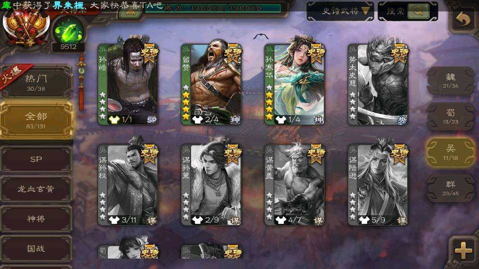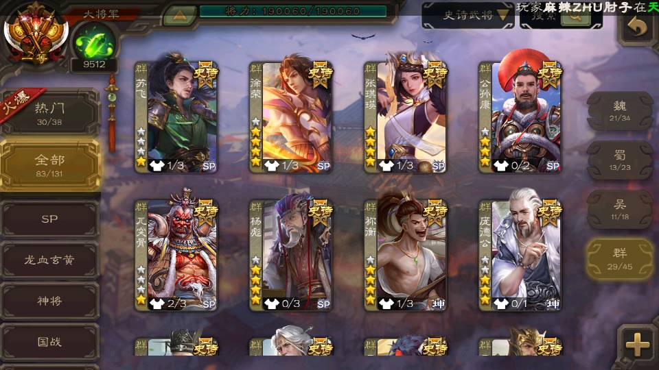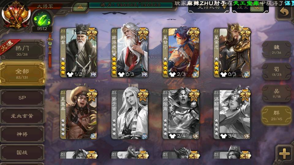 (群雄):刘焉,徐荣,杨彪,杜预,祢衡,界左慈,南华老仙,麴义,许攸,张仲景,星董卓,张让,界李儒,苏飞,庞德公,星甘宁,张琪瑛,卑弥呼,士燮,王允,公孙康,刘璋,郑玄,陶谦,星黄忠,司马徽,左慈,沮授,兀突骨