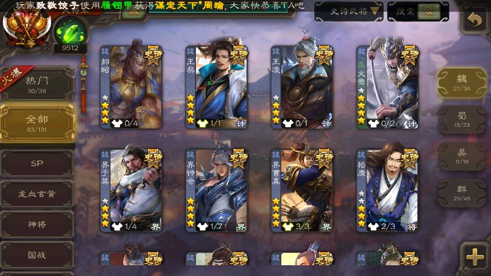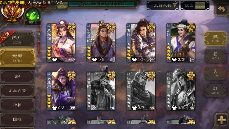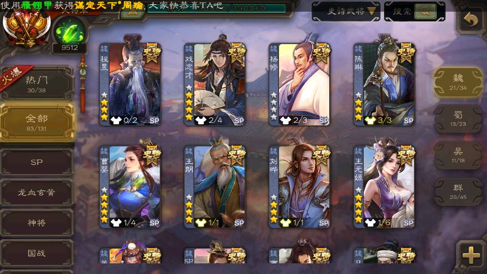 (魏国):曹婴,马钧,王元姬,羊徽瑜,文鸯,戏志才,界钟会,SP司马昭,司马师,王朗,界于禁,郝昭,王粲,界曹真,王凌,程昱,曹纯,杨修,陈琳,嵇康,刘晔