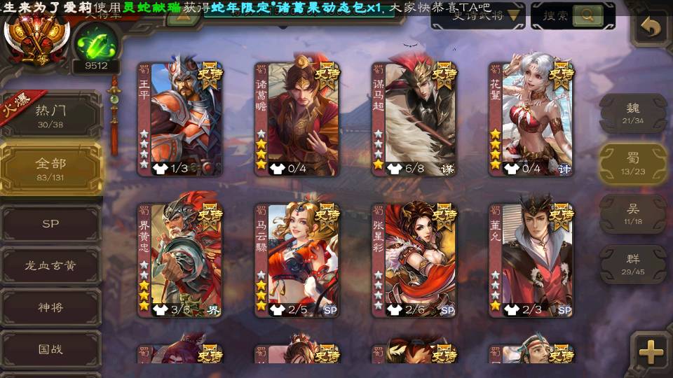 (蜀国):界黄忠,周群,诸葛瞻,花鬘,沙摩柯,谯周,谋马超,关索,张星彩,王平,马云騄,董允,赵襄