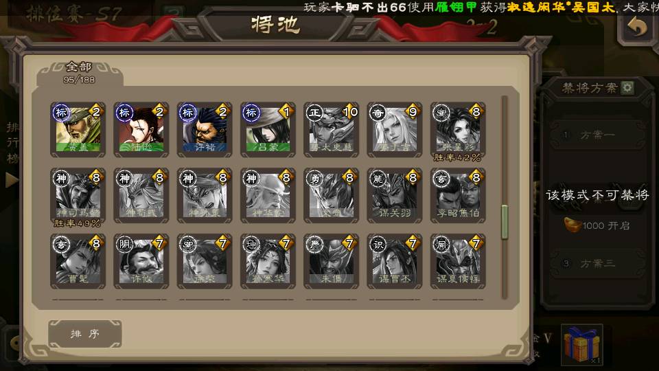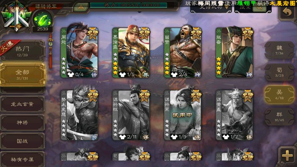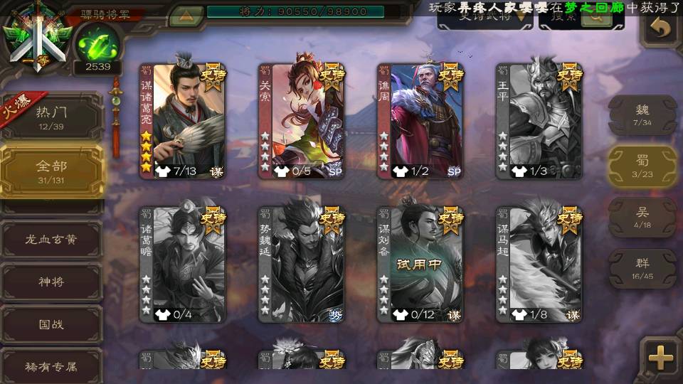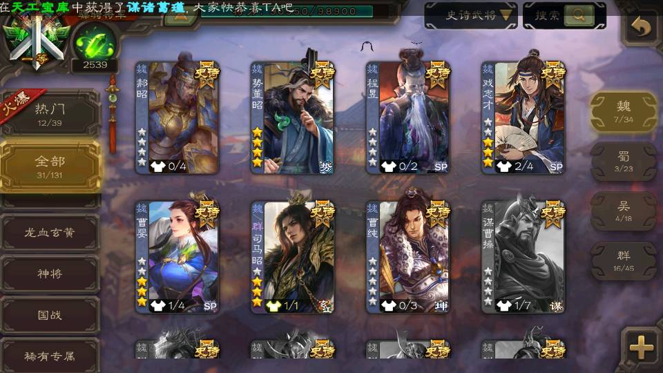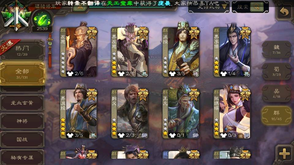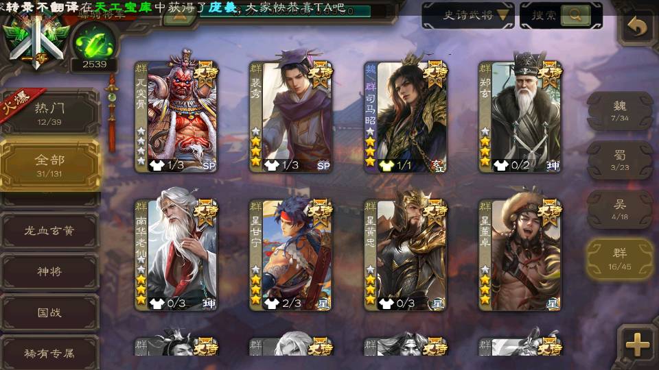(群雄):界沮授,界左慈,南华老仙,麴义,裴秀,司马昭,界李儒,张琪瑛,王允,郑玄,星甘宁,星董卓,星黄忠,左慈,沮授,兀突骨