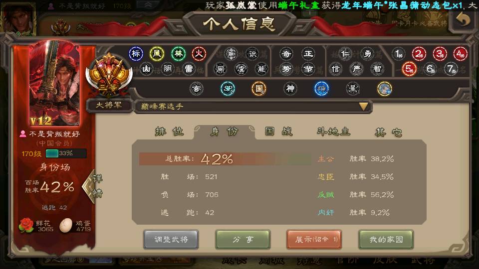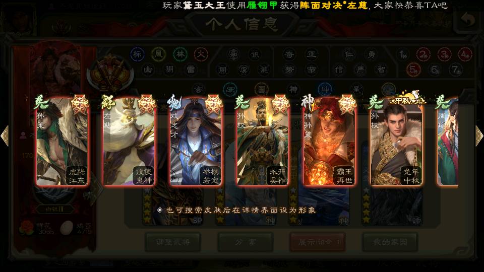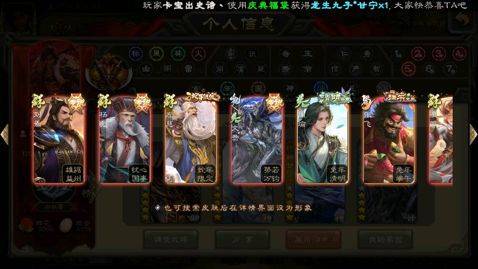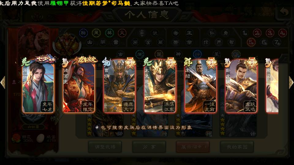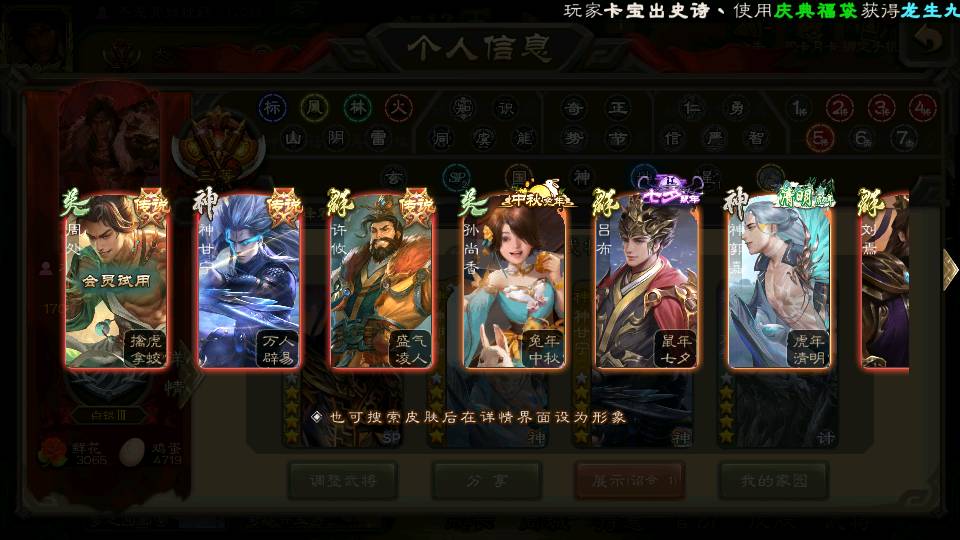 商品编号22093 全部皮肤413,动态皮肤38,全部武将361,排位武将106,国战武将89,史诗武将57,杨彪动皮,文鸯动皮,神孙策动皮,麴义动皮,金票7w,将魂6.3k