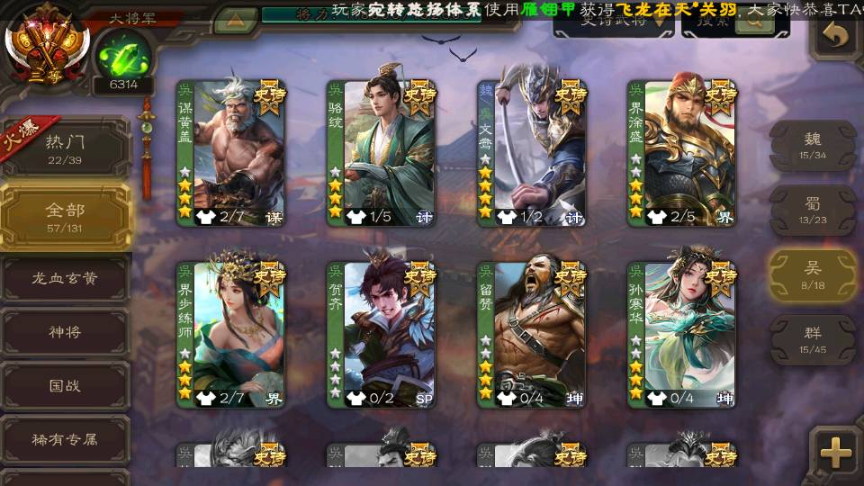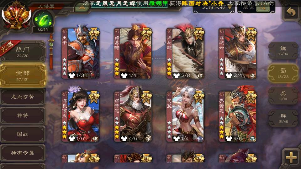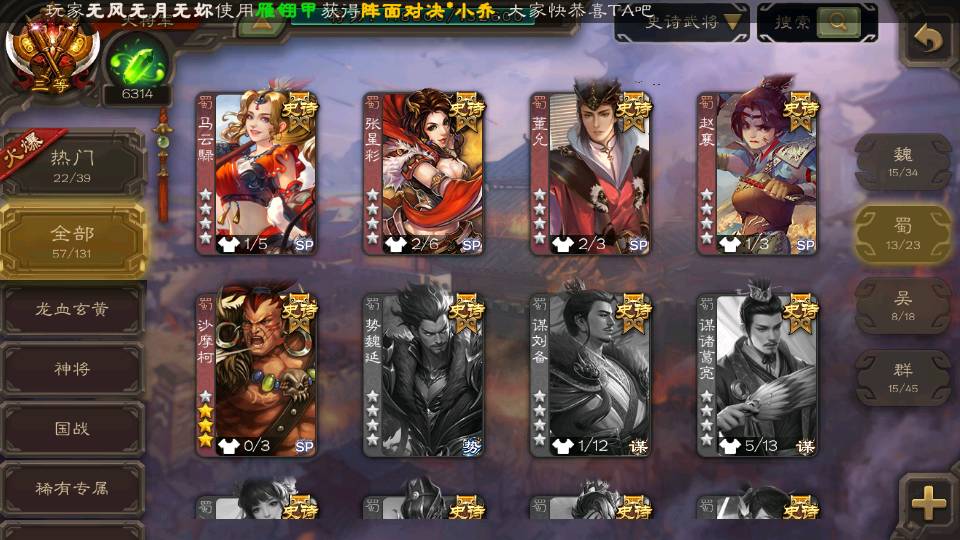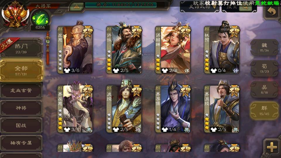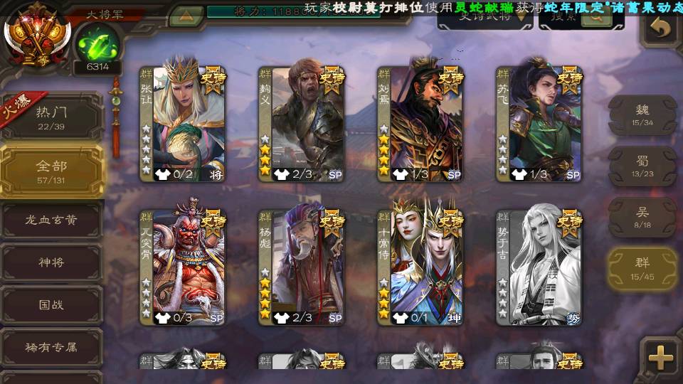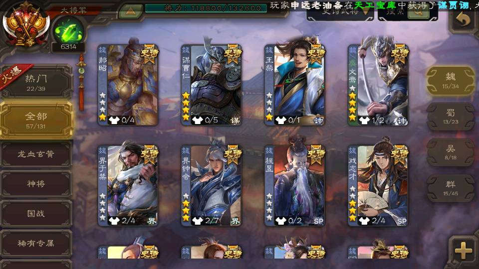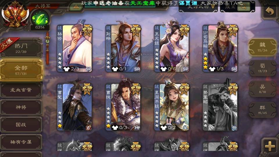 (魏国):王元姬,文鸯,曹髦,戏志才,界钟会,谋曹仁,界于禁,郝昭,王粲,SP司马昭,星周不疑,程昱,曹纯,杨修,刘晔