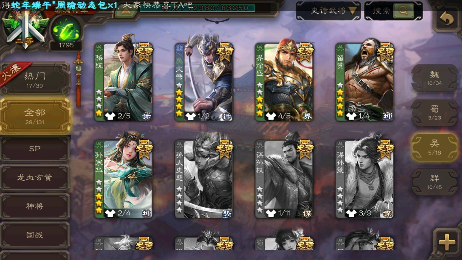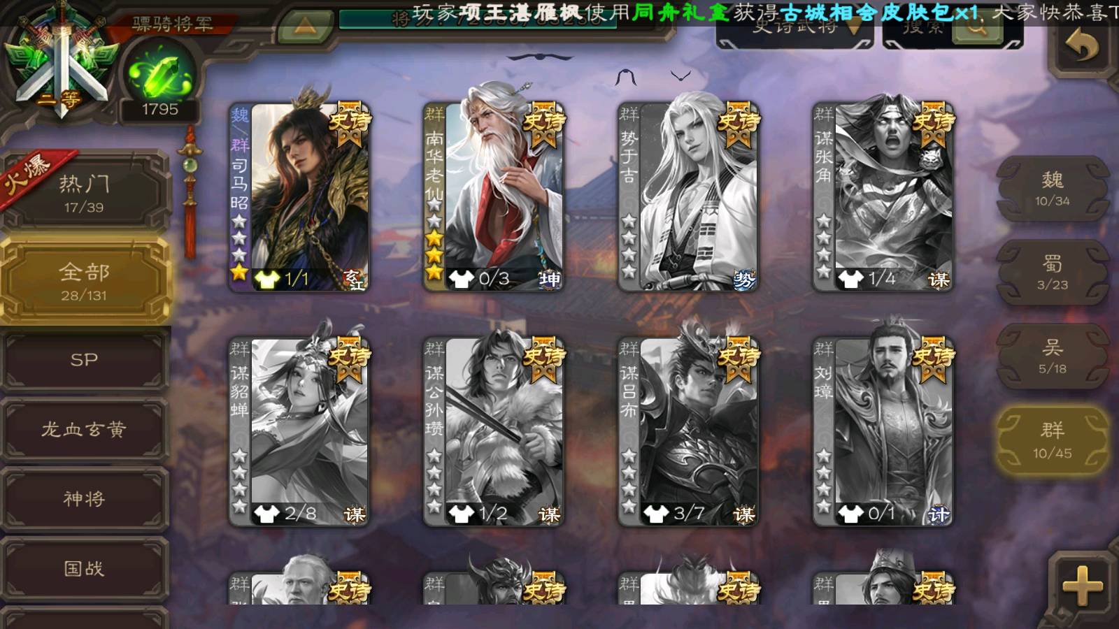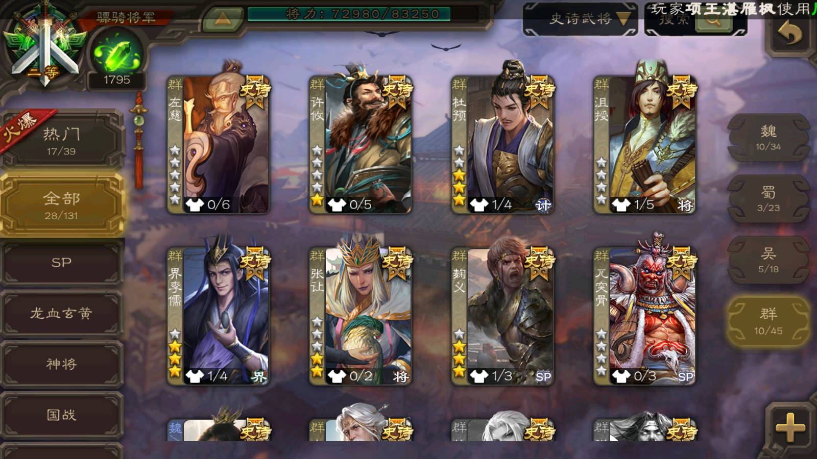 (群雄):杜预,司马昭,南华老仙,麴义,许攸,张让,界李儒,左慈,沮授,兀突骨