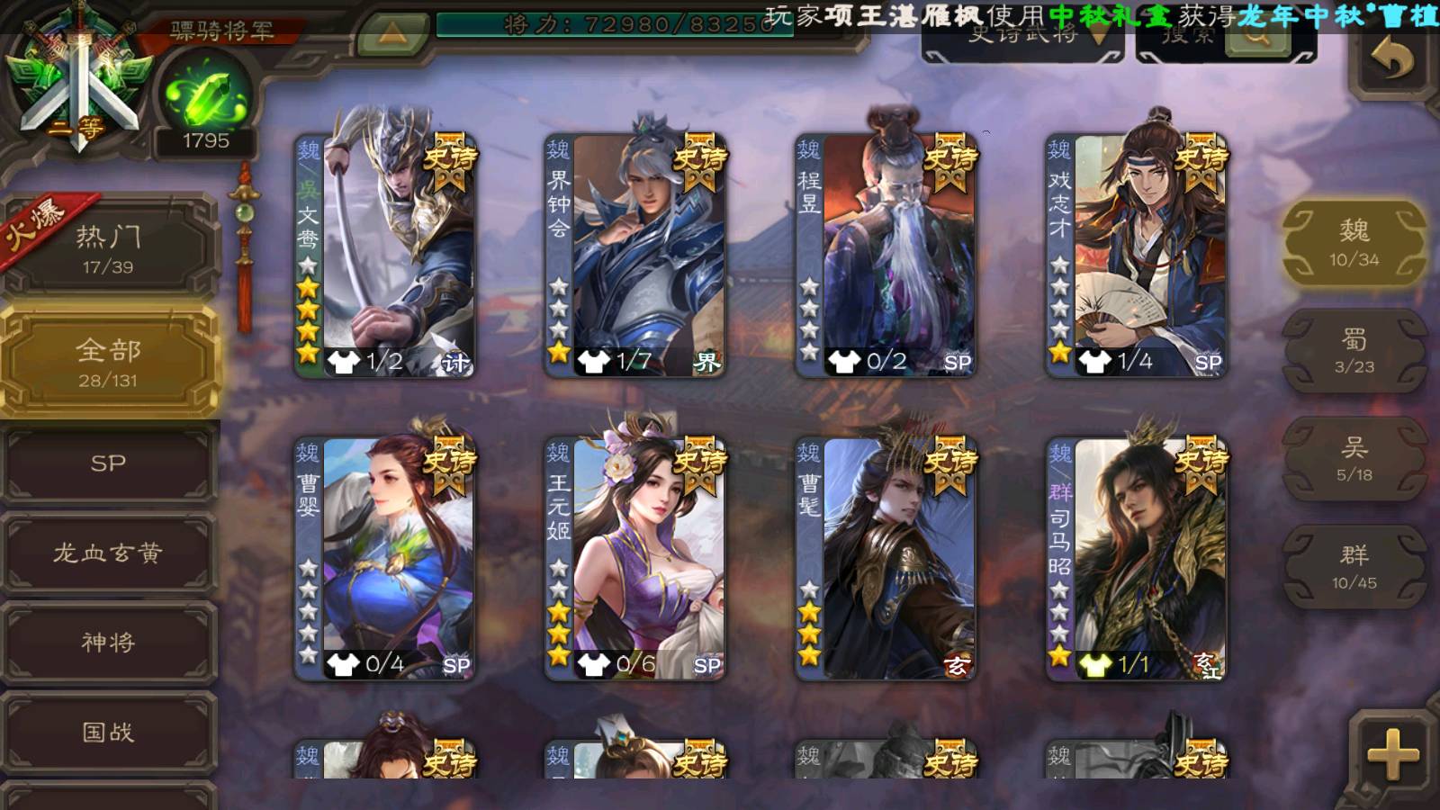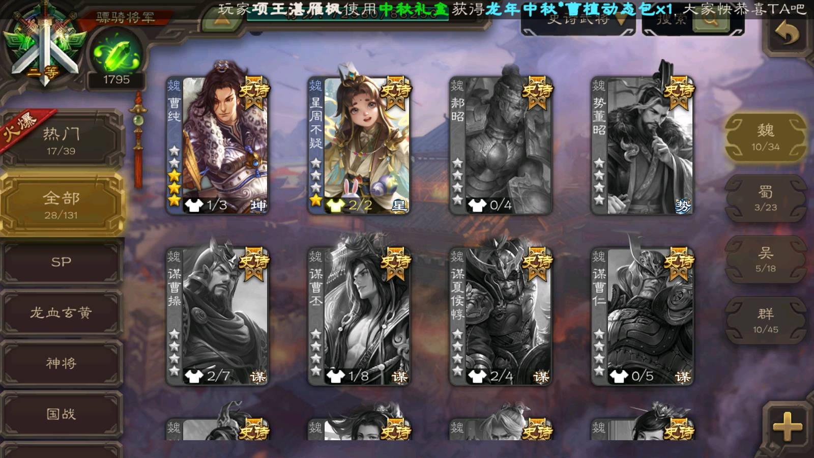 (魏国):曹髦,文鸯,曹婴,界钟会,王元姬,戏志才,星周不疑,程昱,曹纯