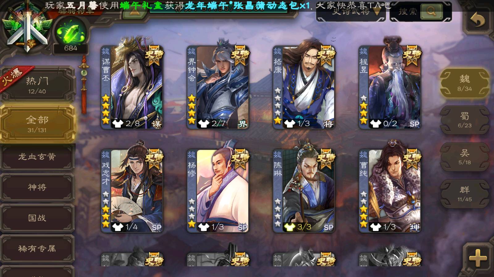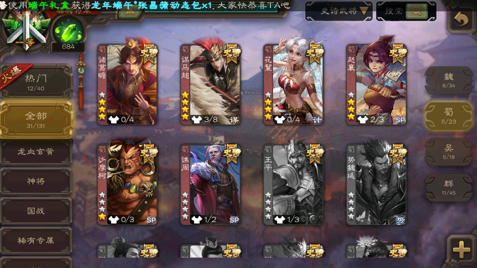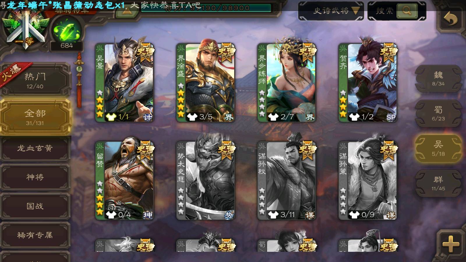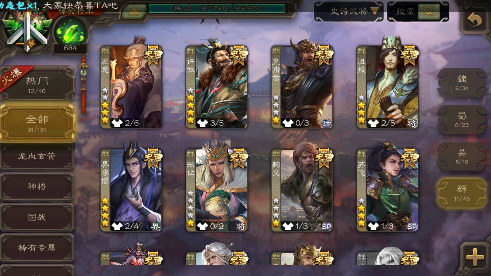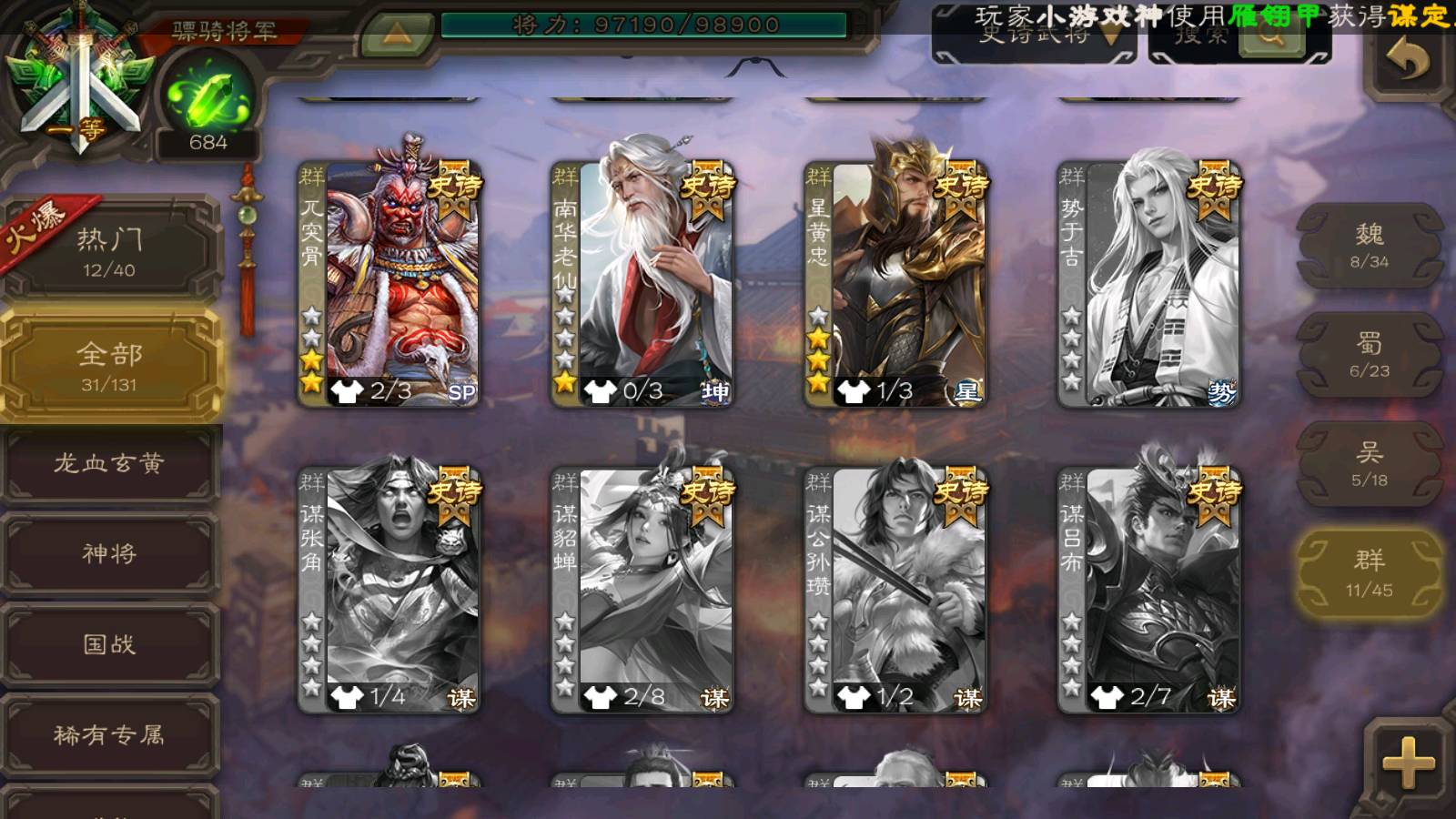 (群雄):南华老仙,麴义,许攸,张让,界李儒,苏飞,皇甫嵩,星黄忠,左慈,沮授,兀突骨
